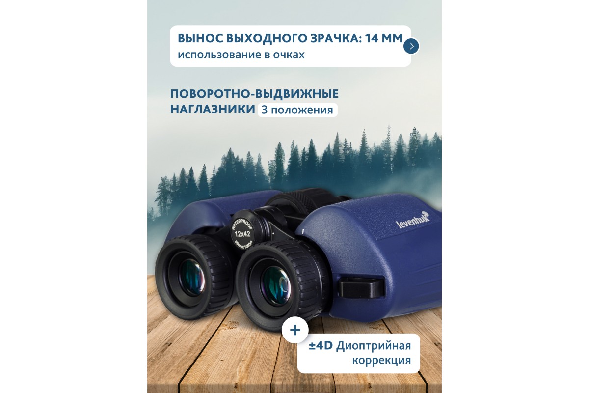 Levenhuk New Sherman PLUS 12x42 также легко адаптируется под особенности каждого пользователя. Межзрачковое расстояние регулируется, а поворотно-выдвижные наглазники позволяют установить их в наиболее комфортное положение – доступно 3 фиксированных уровня. Для пользователей с особенностями зрения предусмотрена диоптрийная подстройка в пределах от –4 до +4 D.