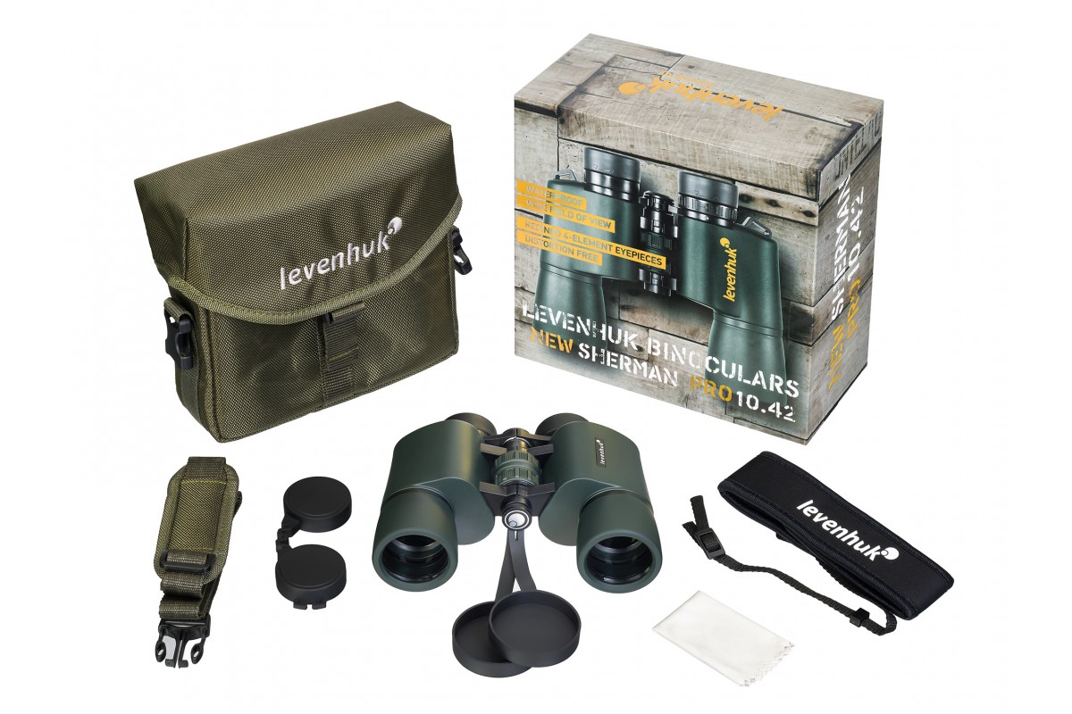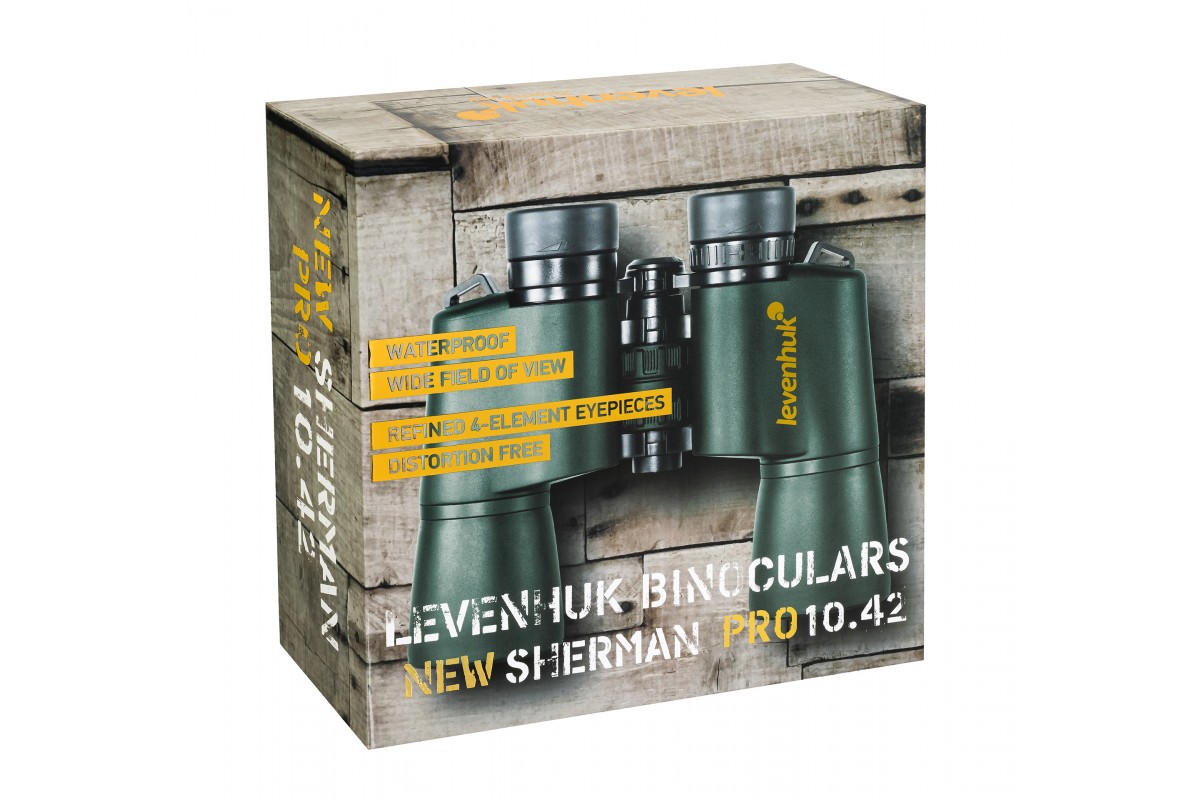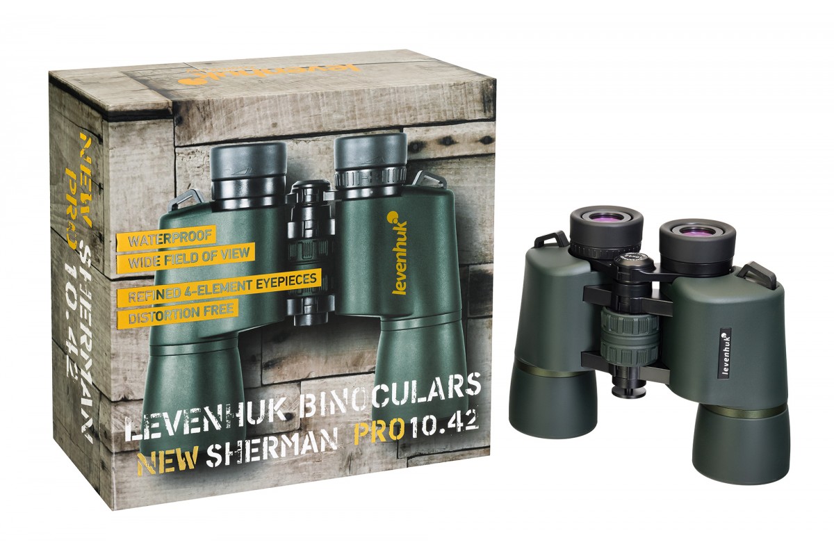 New Sherman PRO 10x42 – профессиональный бинокль с увеличением 10x и апертурой 42 мм. Он обладает довольно широким полем зрения (112 м на удалении 1000 м) и подойдет практически для любых целей: от рыбалки и охоты до охраны территории. Светосильная оптика прибора создана из BaK-4 и многократно покрыта просветляющим составом. В сочетании с высоким сумеречным фактором (20,5) это дает превосходную видимость не только в светлое время дня, но и при недостатке освещения. Качество изображения остается однородным по всей площади обзора: достаточно только навести фокус, и вы получите превосходную по четкости и ясности картинку в любых погодных условиях.