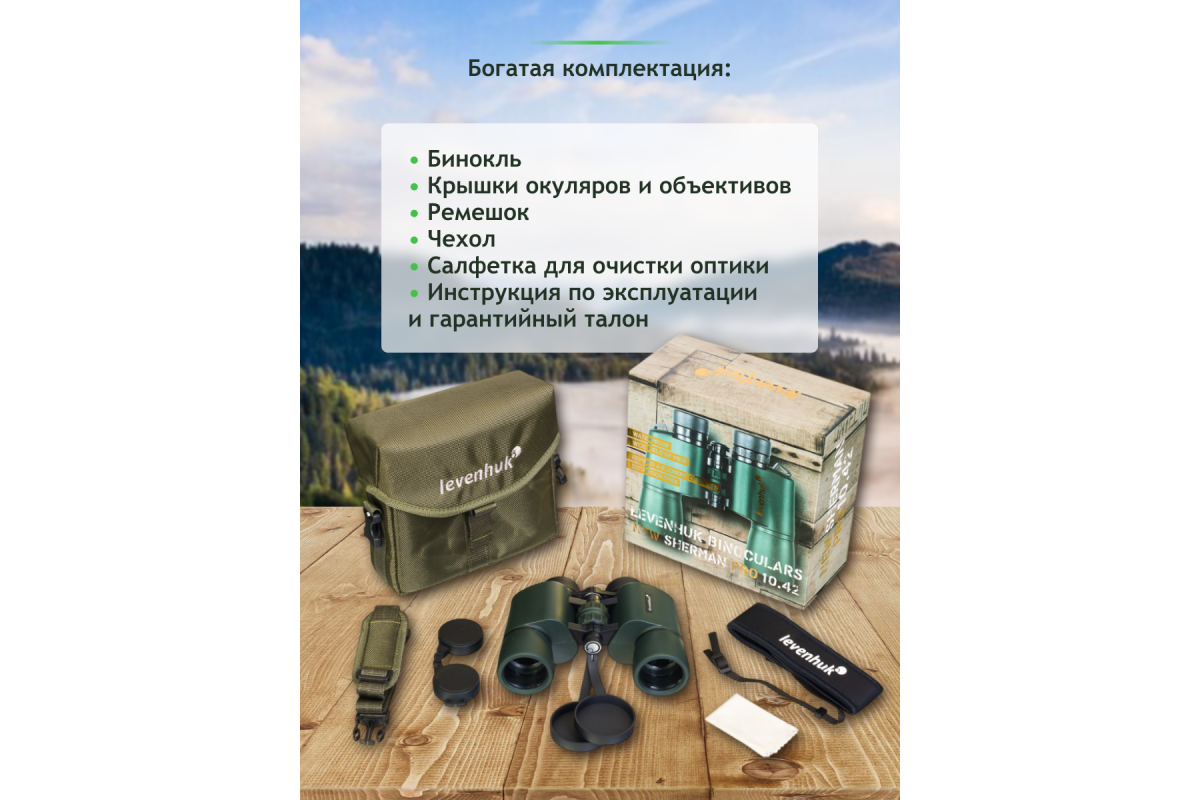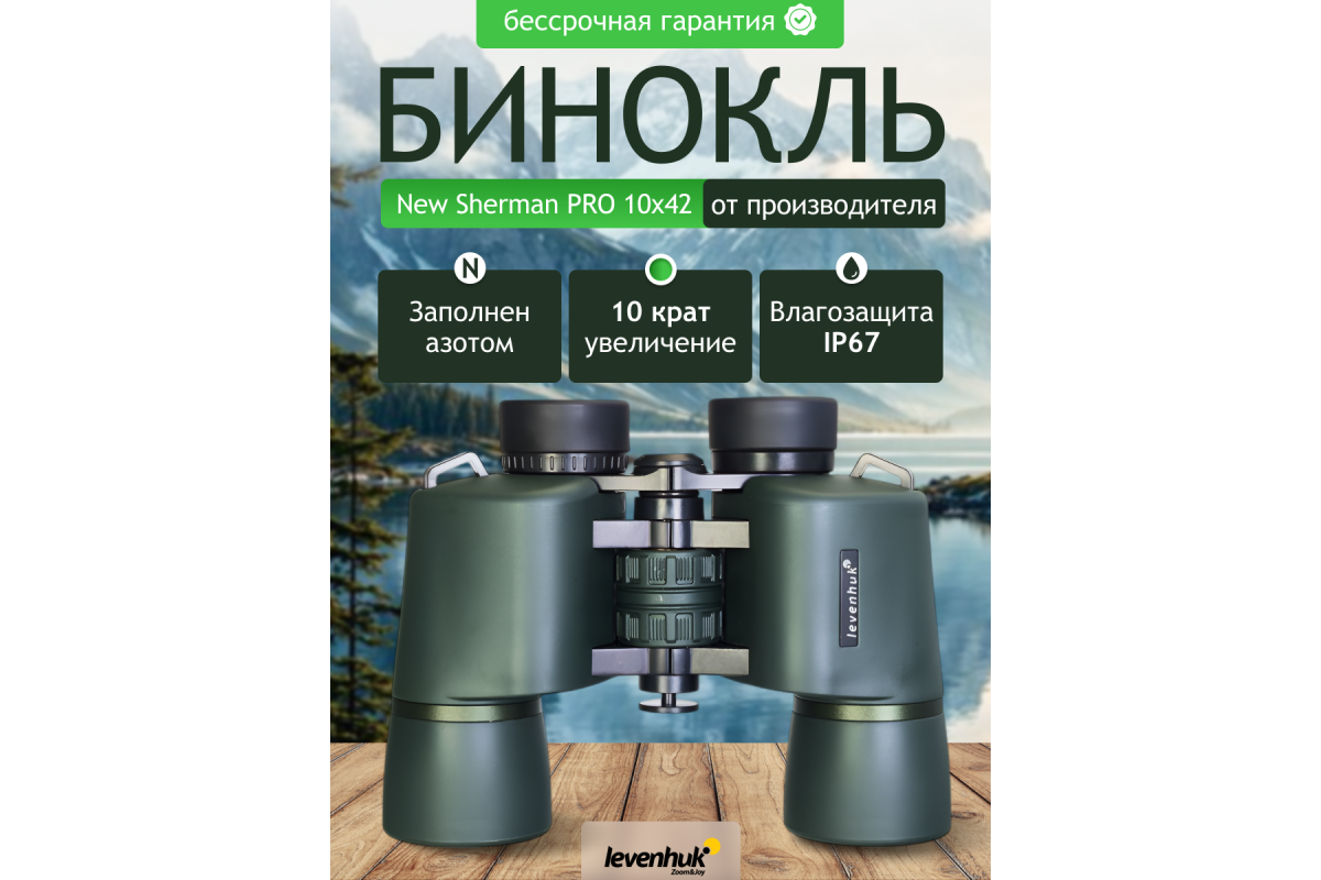Упоминания достойны и качества долговечности New Sherman PRO 10x42. Бинокль имеет эргономичный корпус из высокопрочного дюраля, защищенный резиновой поверхностью, что не только способствует сохранности прибора, но и гарантирует удобство хвата. Модель имеет азотное заполнение – это обеспечивает устойчивость к появлению конденсата на поверхности оптики. Ей не страшны морозы до –10 °С и даже обильные осадки. Бинокль поставляется с ремешком, чехлом и защитой для оптики (крышки объективов закреплены на корпусе), предусмотрено использование на штативе.