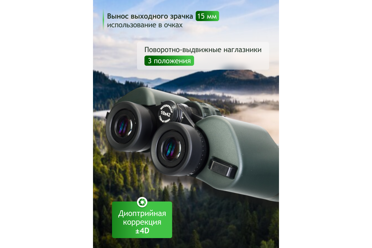 Обладатели несовершенного зрения оценят диоптрийную коррекцию в пределах ±4 D, с помощью которой можно оптимально настроить прибор под свои особенности. Минимальная дистанция фокусировки составляет 6 м. Межзрачковое расстояние регулируется, также можно выбрать наиболее удобное положение поворотно-выдвижных наглазников. Благодаря системе «клик-стоп» настройка наглазников интуитивно-понятная, механизм предлагает 3 положения фиксации.