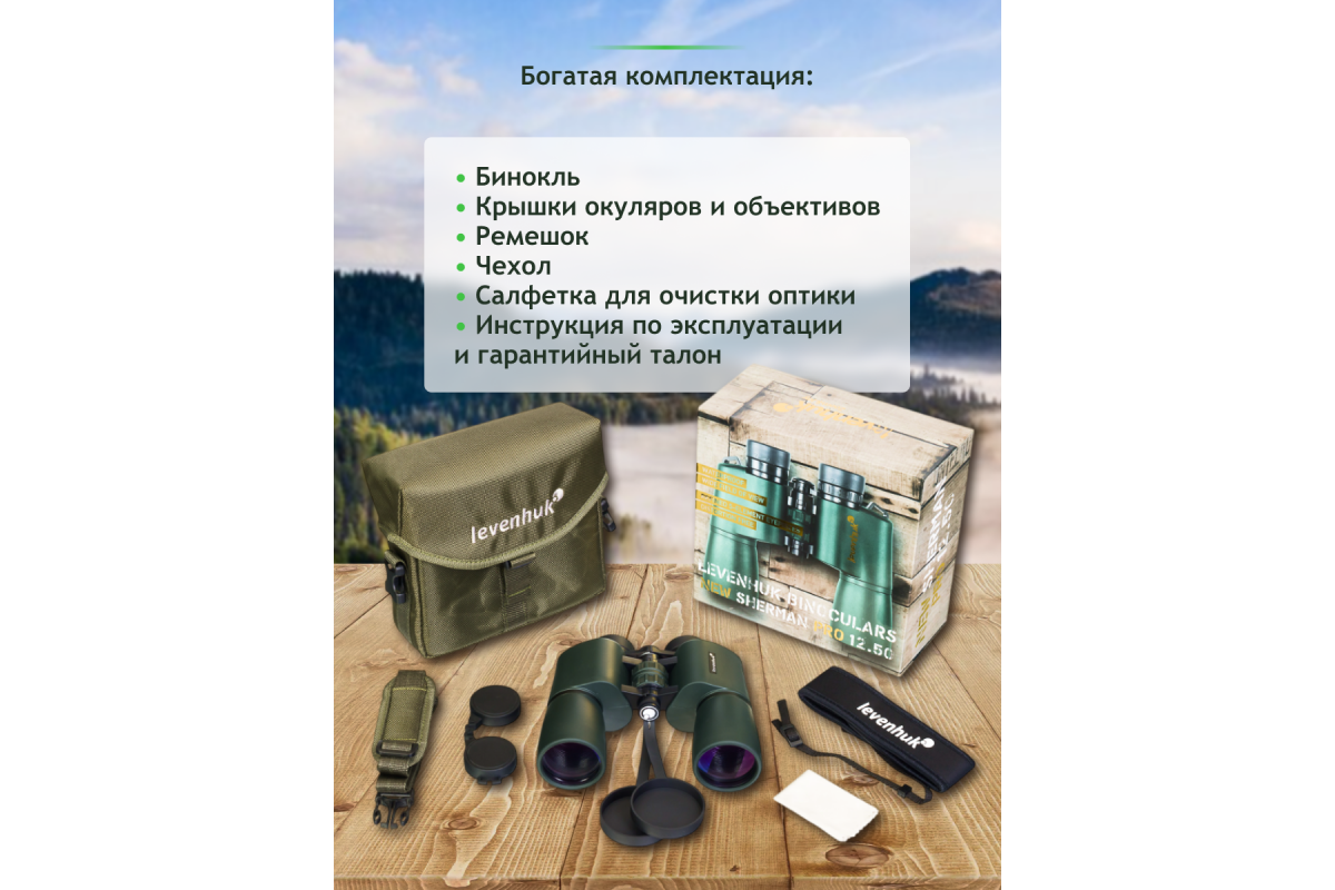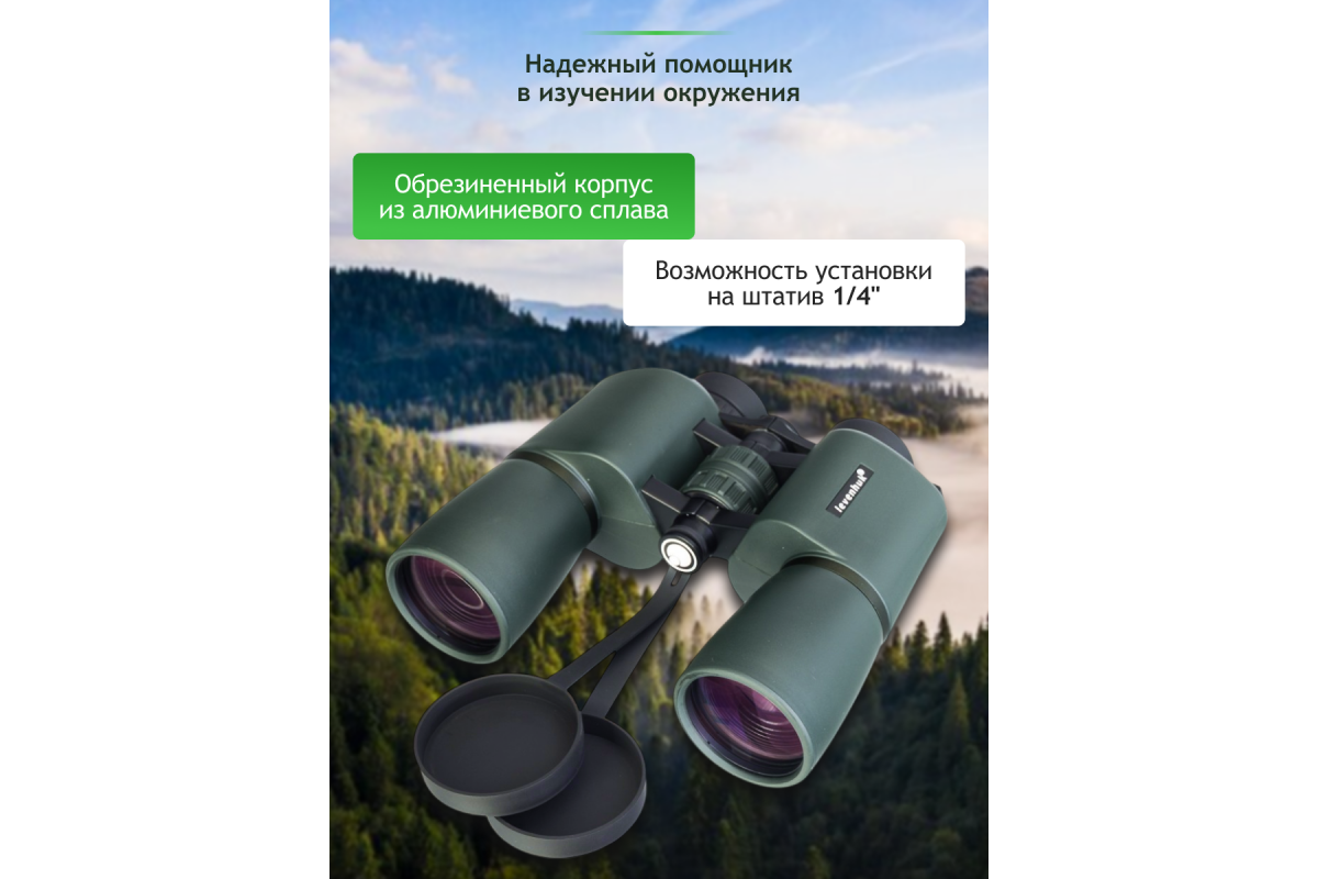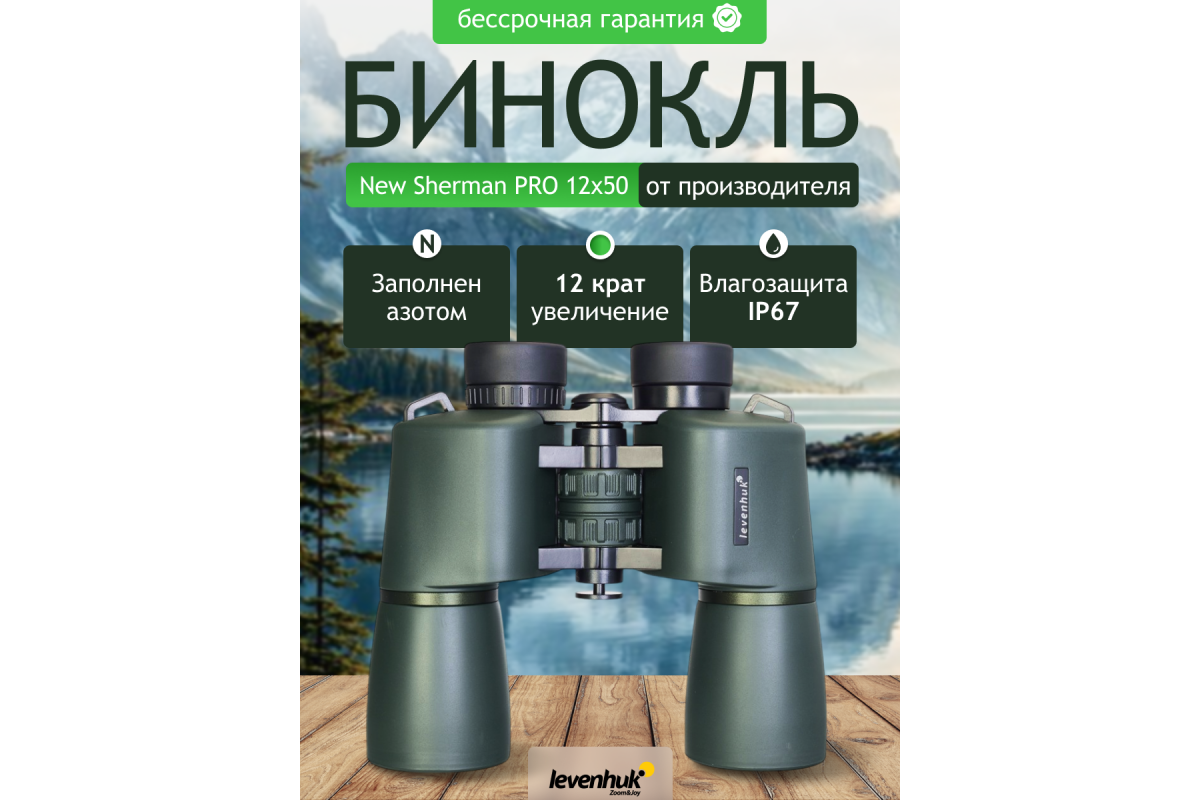 Levenhuk New Sherman PRO 12x50 отлично проявит себя в суровых условиях эксплуатации: он не боится морозов до –10 °С, имеет высокую степень защиты от влаги (IP67) и собран из прочных материалов, устойчивых к механическим повреждениям. Дюраль – сплав на основе алюминия, меди, магния и марганца – выступает основным материалом корпуса и обеспечивает прибору надежность и долговечность даже в самых суровых условиях эксплуатации. Кроме того, корпус продут азотом, что препятствует появлению конденсата на поверхности оптики. Что немаловажно в путешествии, для своих характеристик бинокль весит совсем немного – чуть больше килограмма.