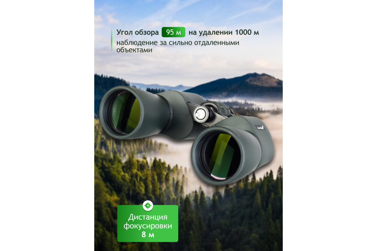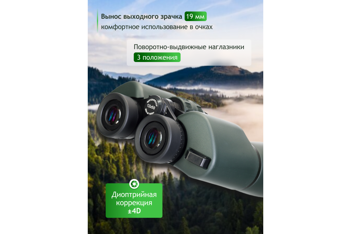 Вынос выходного зрачка составляет 19 мм, а потому бинокль удобно использовать в очках. Предусмотрена диоптрийная коррекция в диапазоне ±4 D. Фокусировка центральная, производится легким прокручиванием. Наглазники поворотно-выдвижные, с механизмом «клик-стоп» (три положения фиксации). Удобство хвата гарантирует резиновое покрытие корпуса.