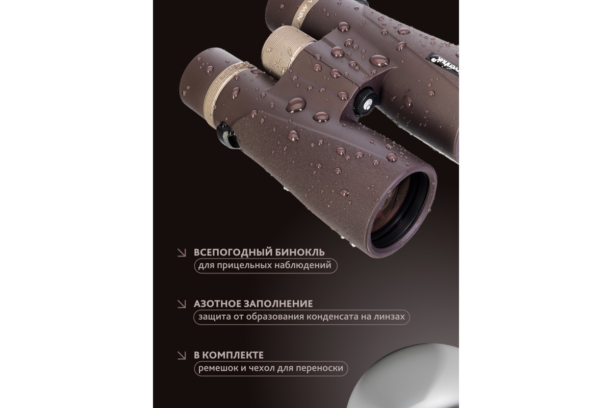 Бинокль Levenhuk New Vegas ED 12x50 – пример надежного всепогодного инструмента, который не подведет даже в центре бушующей стихии. Его корпус изготовлен из ударопрочного и долговечного алюминиево-магниевого сплава, герметизирован от пыли, грязи и воды по стандарту IP67 и заполнен азотом, предотвращающим запотевание линз при скачках внешней температуры и тормозящим окислительные процессы. Бинокль без труда выдержит даже падение в водоем на глубину до 1 метра, а значит с ним можно работать не только на суше, но и у рек и озер.