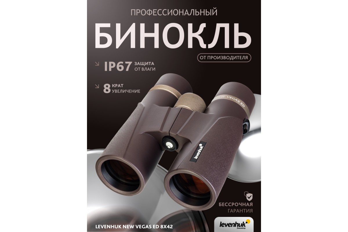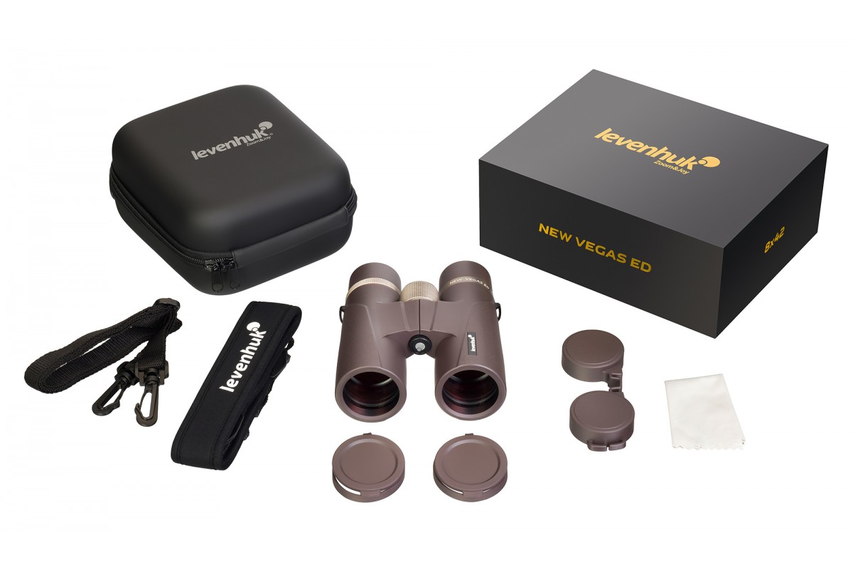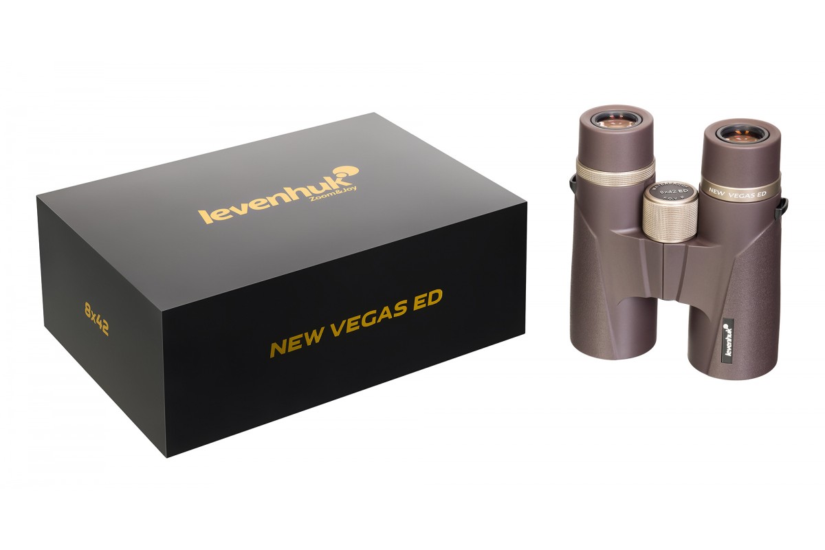 Levenhuk New Vegas ED 8x42 отличается высоким качеством оптики. Благодаря продуманной оптической схеме, в основе которой лежат roof-призмы, бинокль позволит наблюдать одинаково четкую, яркую и правдоподобную картинку в любых условиях работы. Многослойное просветляющее покрытие, нанесенное на призмы и линзы, придает изображению светлоты и делает наблюдения комфортными и эффективными даже при значительном недостатке освещения. Отдельного внимания заслуживает конструкция окуляров и объективов: они состоят из пяти элементов в трех группах и четырех элементов в двух группах соответственно; такое строение придает изображению особой реалистичности, словно вы наблюдаете объект прямо перед собой.