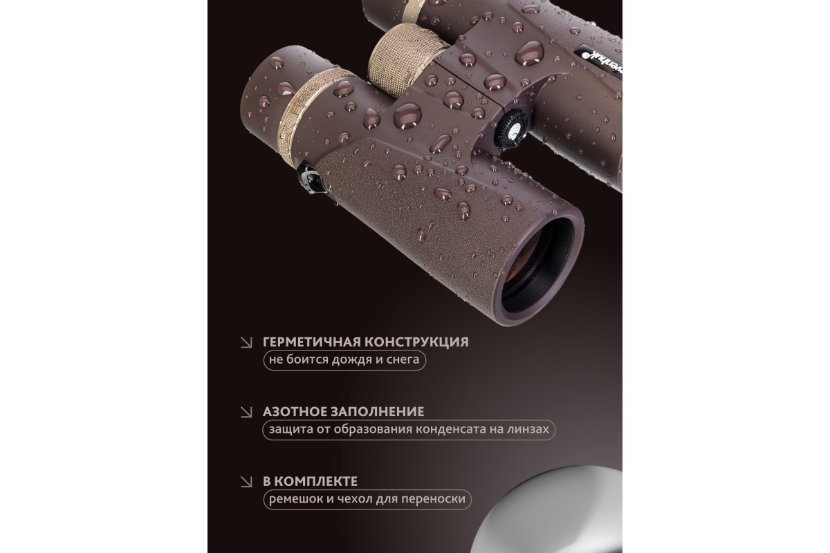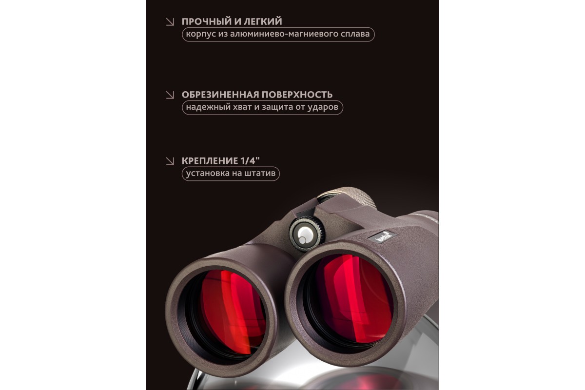 Компактность roof-призм в оптической схеме положительно влияет на размер и дизайн корпуса прибора, позволяя сохранить его удобство в переноске и транспортировке. Бинокль можно установить на любой стандартный фотоштатив (потребуется адаптер – приобретается отдельно), и таким образом организовать комфортное статичное место для наблюдений, освободить руки для других важных занятий.