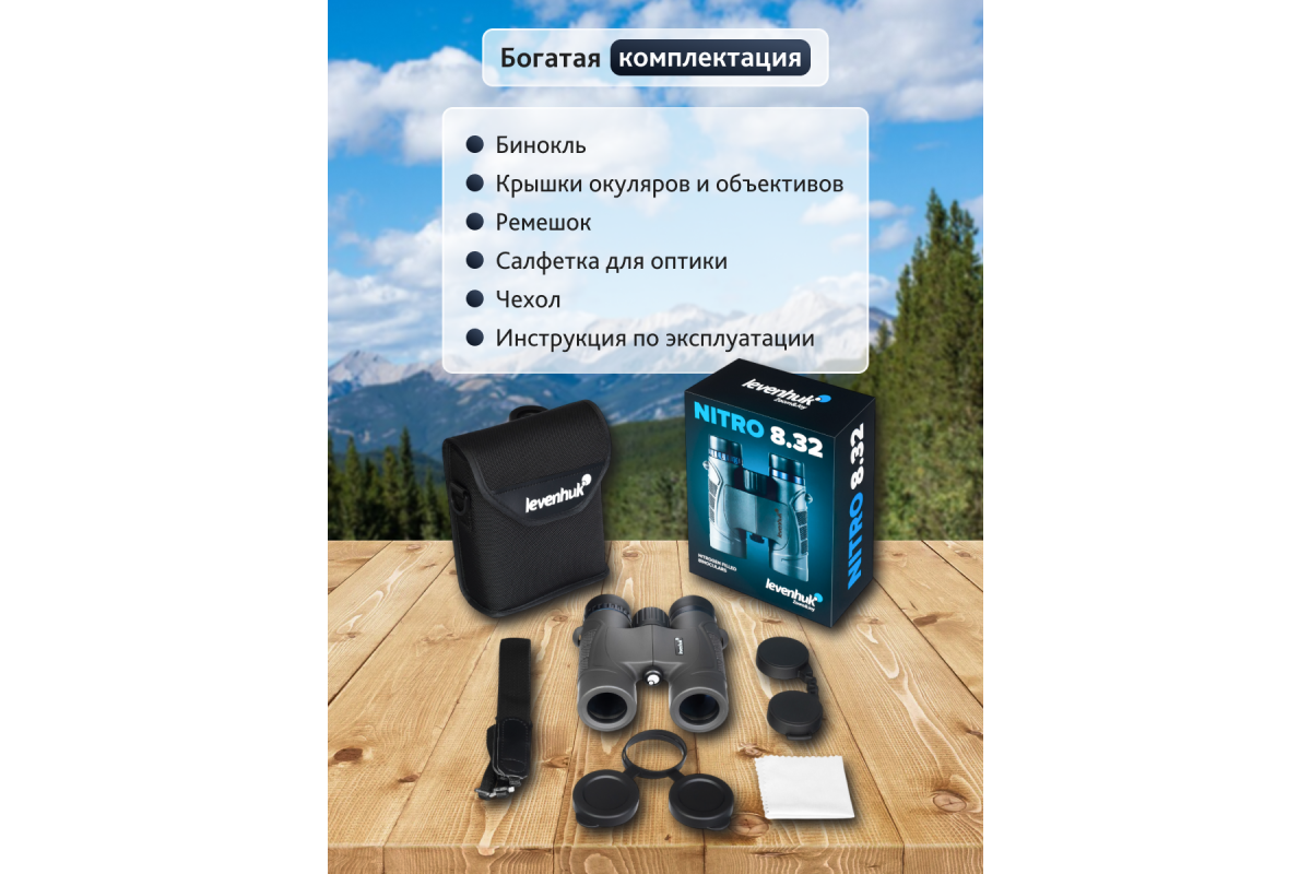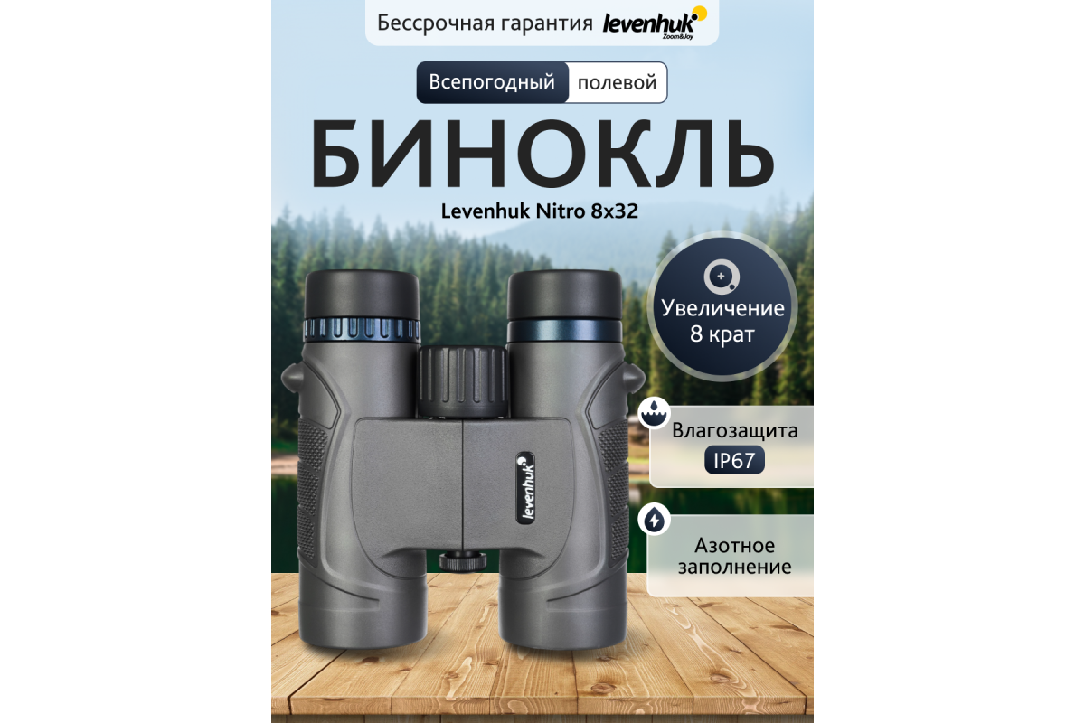 Прибор построен на roof-призмах, все элементы оптической схемы выполнены из стекла BaK-4. Оптика покрыта многослойным просветляющим составом, наиболее яркую картинку бинокль продемонстрирует в солнечную погоду. Levenhuk Nitro 8x32 позволяет охватить большую территорию одним взглядом, поэтому будет удобен не только для прицельных, но и для обзорных наблюдений.