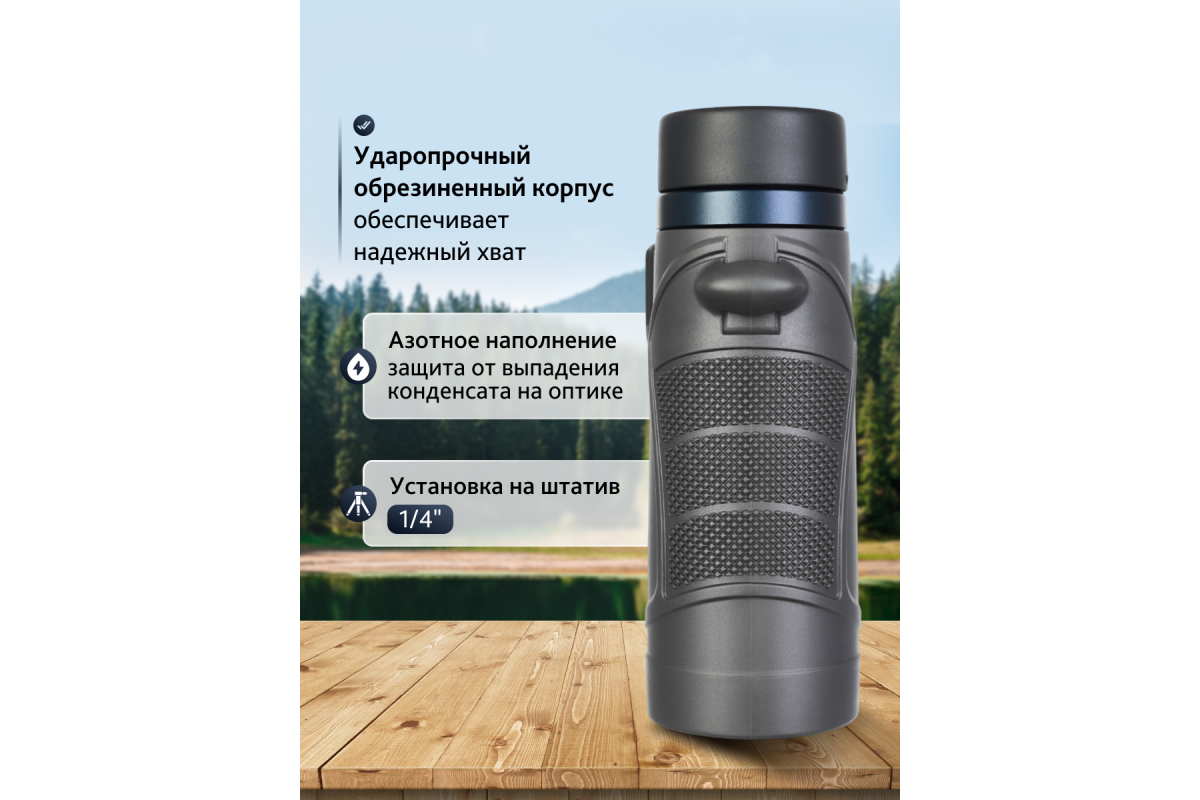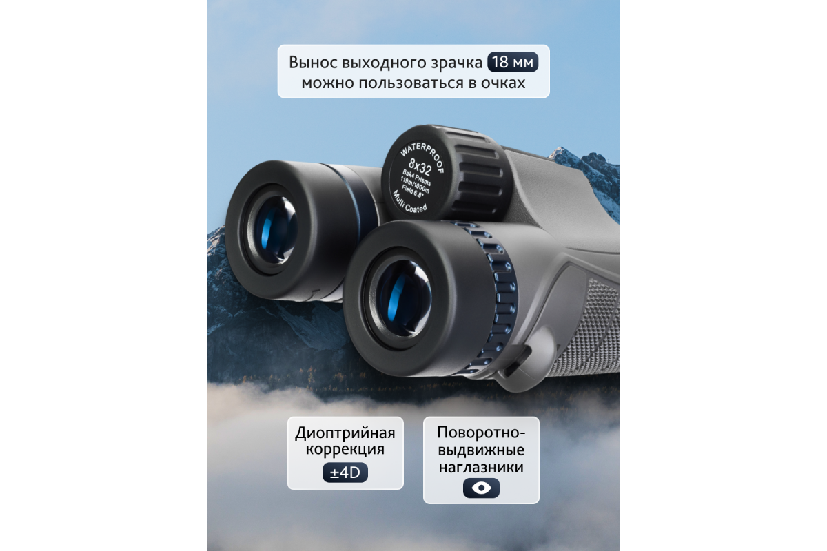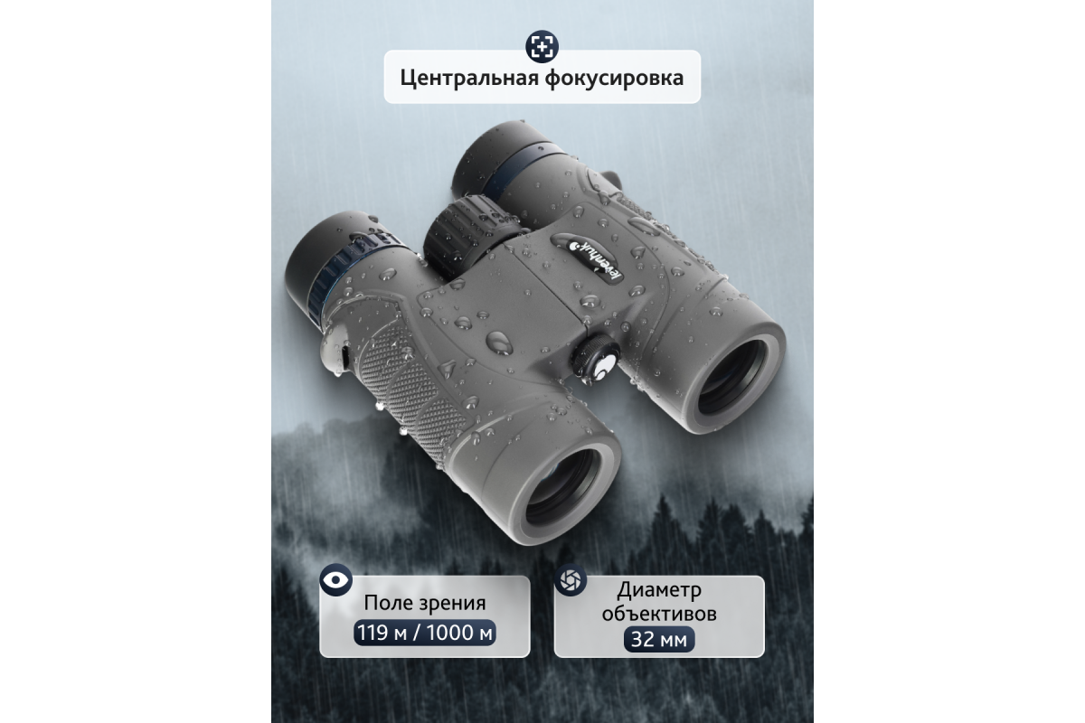 Предусмотрена индивидуальная настройка некоторых параметров: пользователь может подобрать оптимальное межзрачковое расстояние, выполнить диоптрийную подстройку и отрегулировать положение наглазников. Бинокль можно использовать, не снимая очков, – он имеет большой вынос выходного зрачка. Корпус выполнен из высокопрочного ABS-пластика и обрезинен, крепко удерживать прибор в руках позволяют фактурные вставки по бокам. Здесь есть барабан центральной фокусировки и стандартное штативное гнездо 1/4".