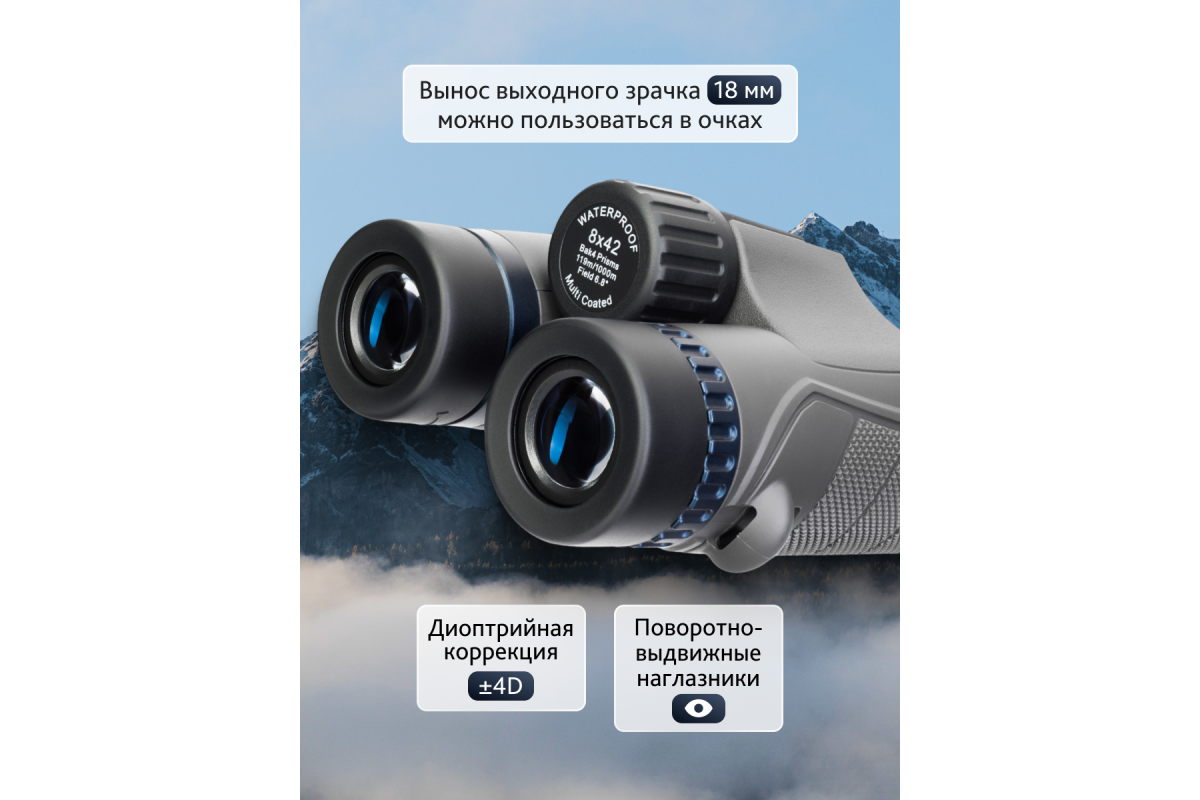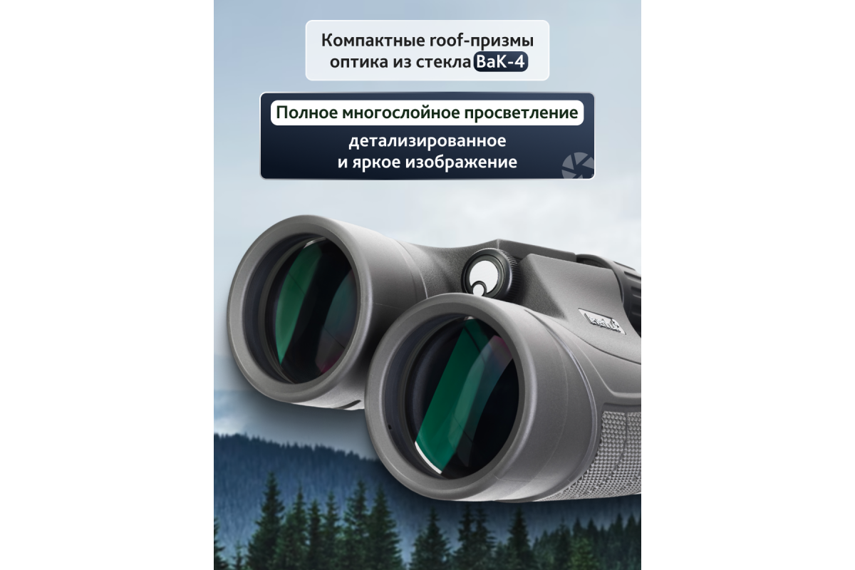 Оптика модели основана на roof-призмах, изготовленных из стекла BaK-4. Бинокль порадует яркой картинкой даже в пасмурный день: оптические элементы покрыты несколькими слоями просветляющего состава. Настройка резкости осуществляется с помощью центрального барабана. Модель имеет большой вынос выходного зрачка и подойдет тем, кто носит очки. Можно выполнить диоптрийную подстройку, чтобы скомпенсировать разницу в остроте зрения глаз наблюдателя. Кроме того, здесь есть возможность регулировки межзрачкового расстояния и универсальные поворотно-выдвижные наглазники.