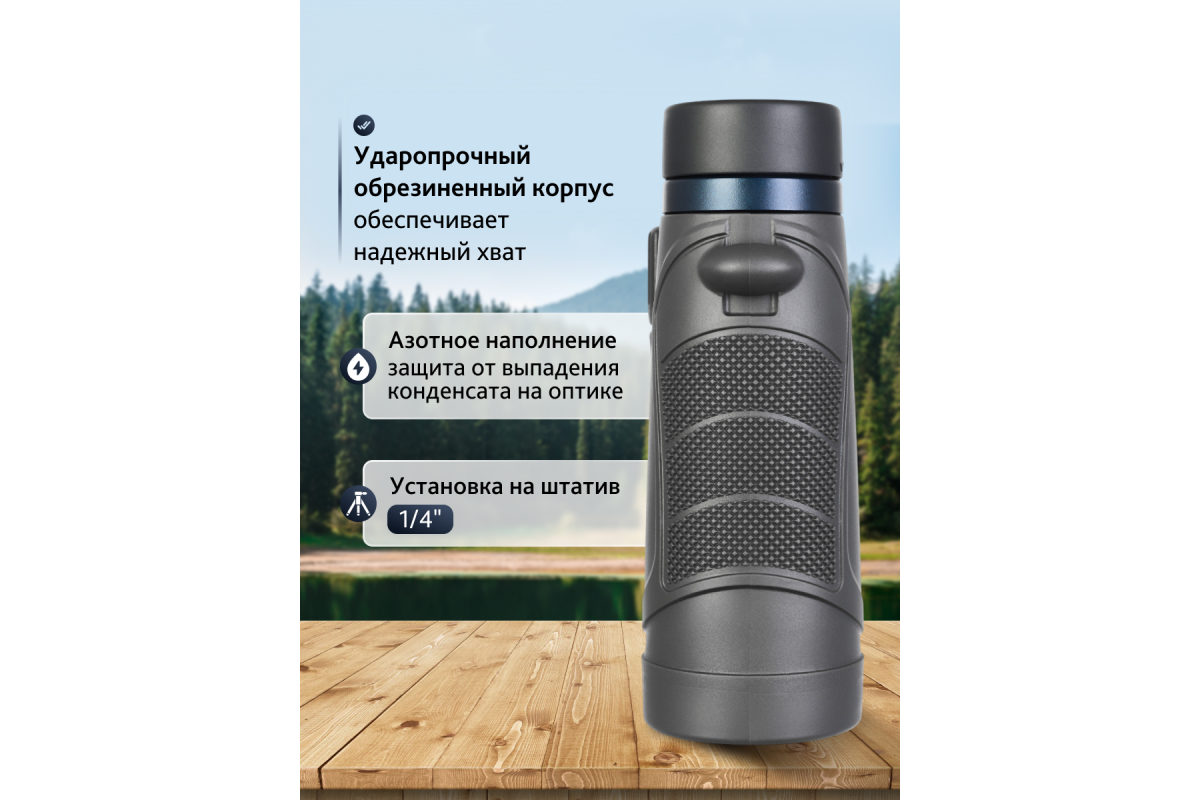 Бинокль не сломается при случайном ударе – его корпус изготовлен из высокопрочного ABS-пластика. Противоскользящее резиновое покрытие и рельефные боковые вставки гарантируют надежное удержание бинокля даже во влажных руках. Прибор можно зафиксировать на стандартном штативе 1/4".