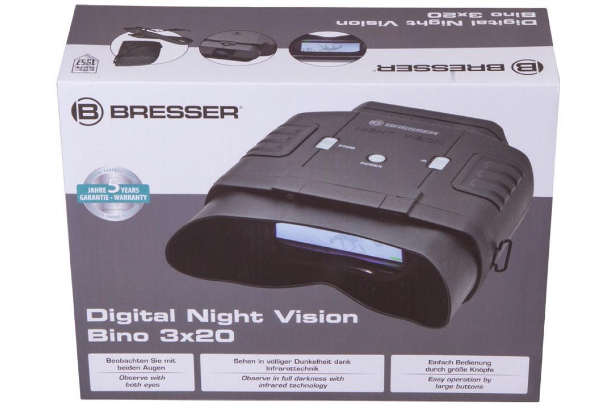 Цифровой бинокль ночного видения Bresser 3x20 работает от батареек. Их можно приобрести в любом магазине и менять прямо во время наблюдений. Широкий диапазон рабочих температур позволяет использовать этот прибор даже в сильные морозы. Есть штативное крепление стандартного размера.