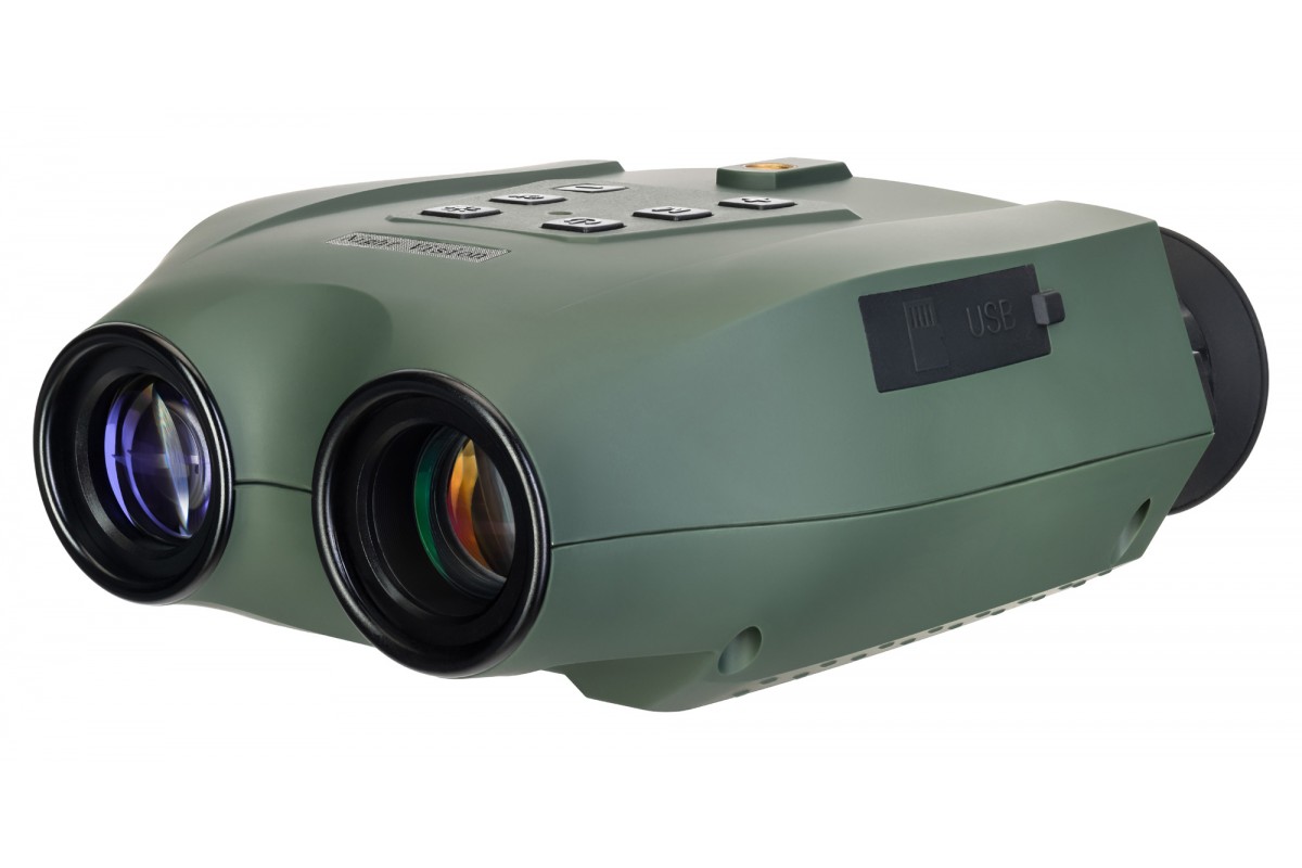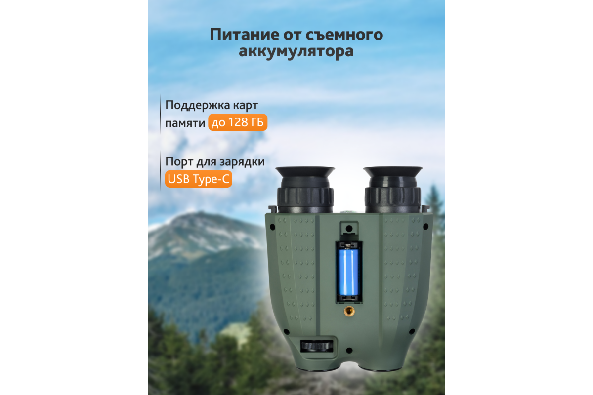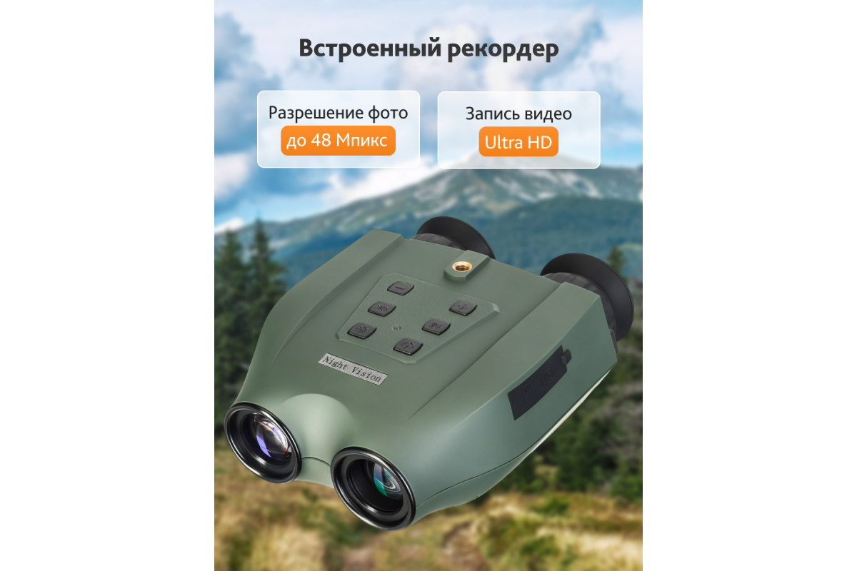Бинокль имеет встроенный видеорекордер и совместим с картами памяти до 128 ГБ (нет в комплекте). Рекордер записывает видео разрешением до 2560х1440 пикс и фото до 48 Мпикс. Ночью съемка ведется в черно-белом режиме, а днем – в полноцветном. Время автономной работы бинокля – до 2 часов ночью (с работающим ИК-осветителем) и до 10 часов днем. В комплекте есть съемный литий-ионный аккумулятор емкостью 700 мАч с возможностью подзарядки с помощью USB-кабеля или от сети (для этого требуется приобрести адаптер).