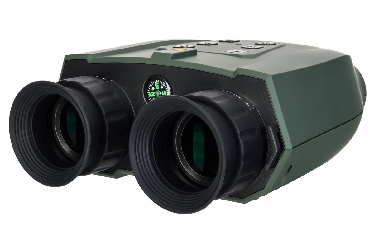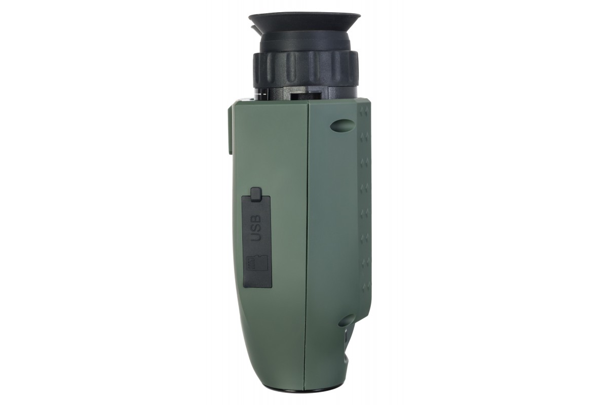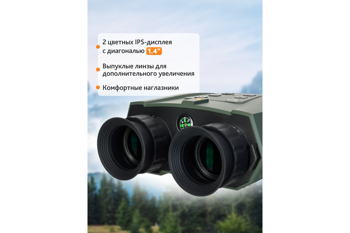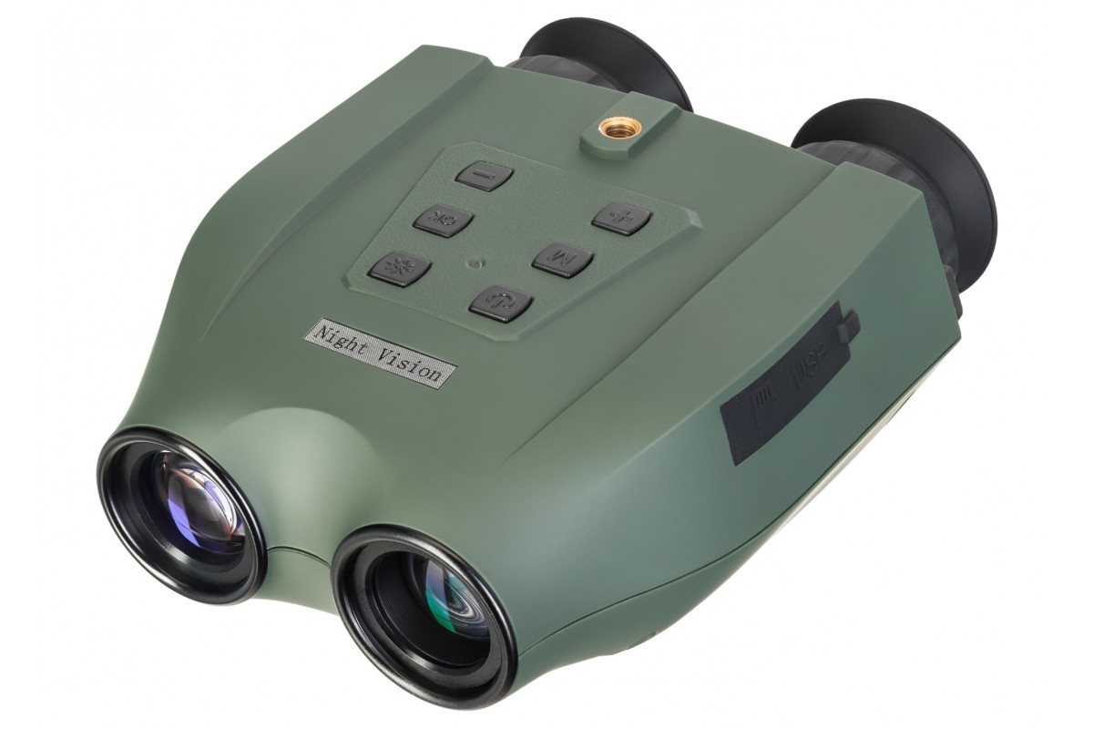 Бинокль имеет встроенный видеорекордер и совместим с картами памяти до 128 ГБ (нет в комплекте). Рекордер записывает видео разрешением до 2560х1440 пикс и фото до 48 Мпикс. Ночью съемка ведется в черно-белом режиме, а днем – в полноцветном. Время автономной работы бинокля – до 2 часов ночью (с работающим ИК-осветителем) и до 10 часов днем. В комплекте есть съемный литий-ионный аккумулятор емкостью 700 мАч с возможностью подзарядки с помощью USB-кабеля или от сети (для этого требуется приобрести адаптер).