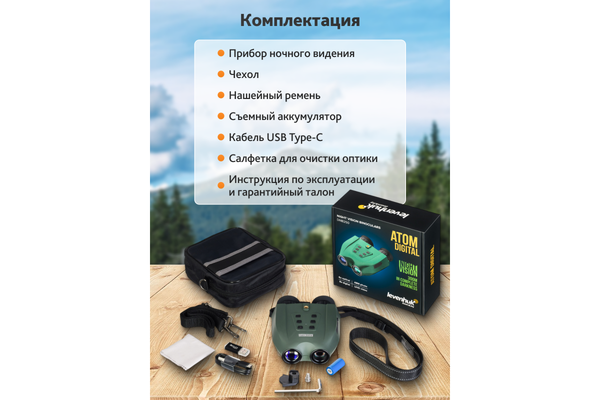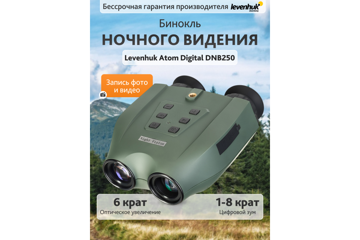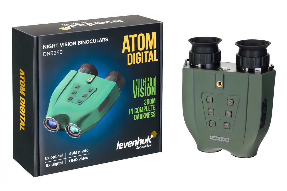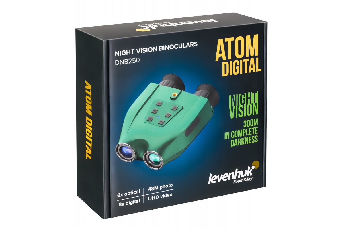Бинокль ночного видения Levenhuk Atom Digital DNB250 – это универсальный оптический прибор, который обеспечивает изображение высокого качества в любое время суток и при осложненной видимости. Он оснащен стеклянной оптикой и линзами с полным многослойным просветлением, а его окулярные линзы – выпуклые, обеспечивающие дополнительное увеличение изображения. Высокочувствительная CMOS-матрица собирает максимальное количество информации. Оптическое увеличение изображения составляет 6 крат, цифровой зум достигает 8 крат: это позволяет наблюдать издалека и использовать бинокль как для обзорных, так и для прицельных наблюдений. Максимальная дистанция обнаружения днем составляет 1000 метров, а ночью – 300 метров. Прибор оборудован ИК-осветителем с тремя режимами яркости. Два IPS-дисплея бинокля можно использовать как совместно, так и по отдельности.