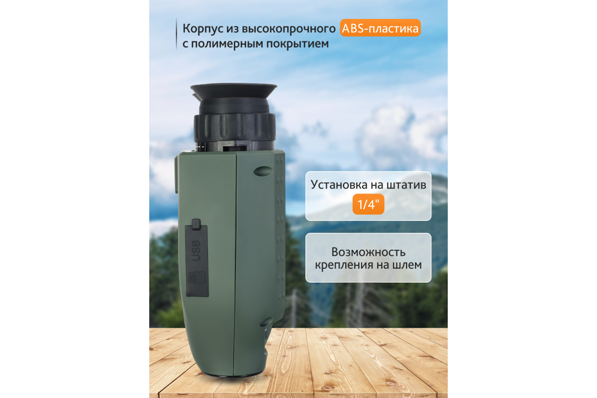 Этот бинокль подходит как для наблюдений с рук, так и для установки на штатив или крепления на шлем. Корпус из легкого высокопрочного ABS-пластика устойчив к повреждениям, а его силиконовое покрытие повышает надежность хвата. Биноклем можно пользоваться как зимой, так и летом, диапазон его рабочих температур составляет от −30 ℃ до +55 ℃.