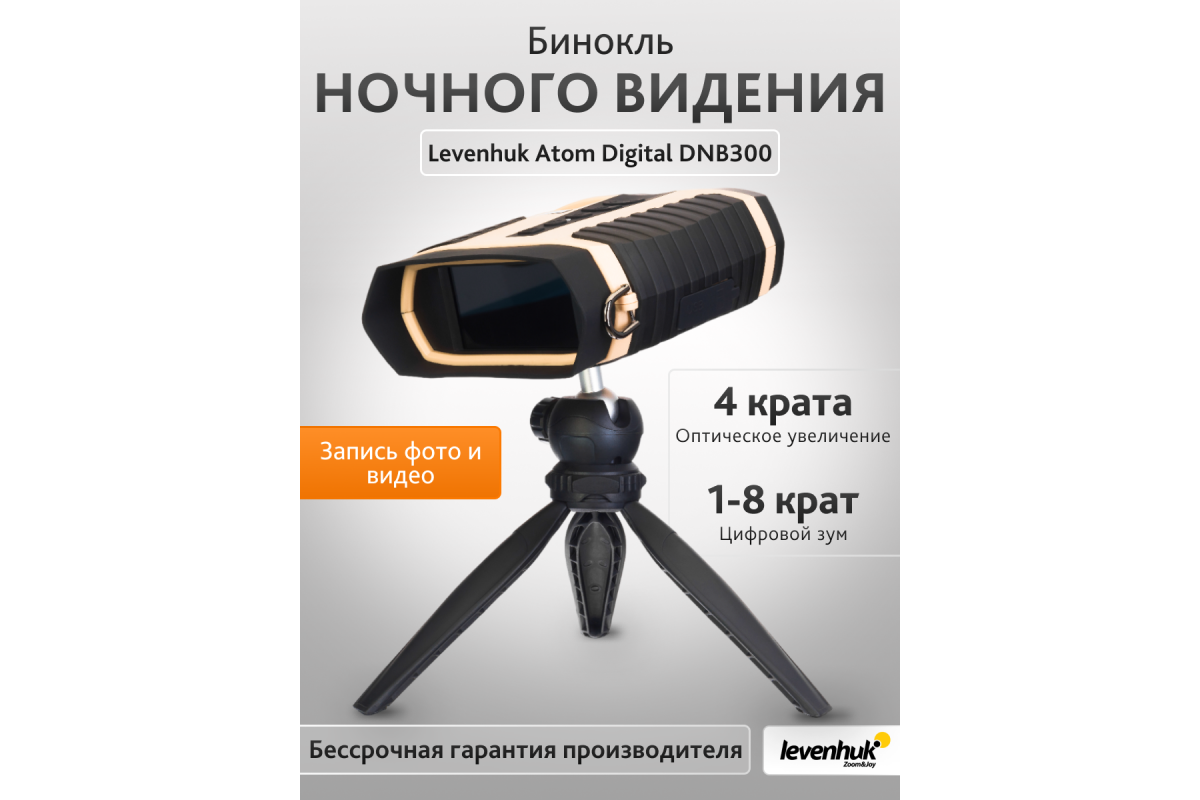 При дневном и сумеречном свете дальность обнаружения достигает 1000 метров, а в ночное время она составляет 250–300 метров. Инфракрасный осветитель питается от встроенного аккумулятора и подстраивается к внешним условиям: предусмотрены режимы ночного видения при звездном свете и в абсолютной темноте. Экономить заряд батареи помогает функция автоотключения. Оптика Levenhuk Atom Digital DNB300 сделана из стекла, сочетание оптического 4-кратного приближения и переменного цифрового зума 1–8 крат позволяет без труда подобрать подходящую степень увеличения для любой цели.