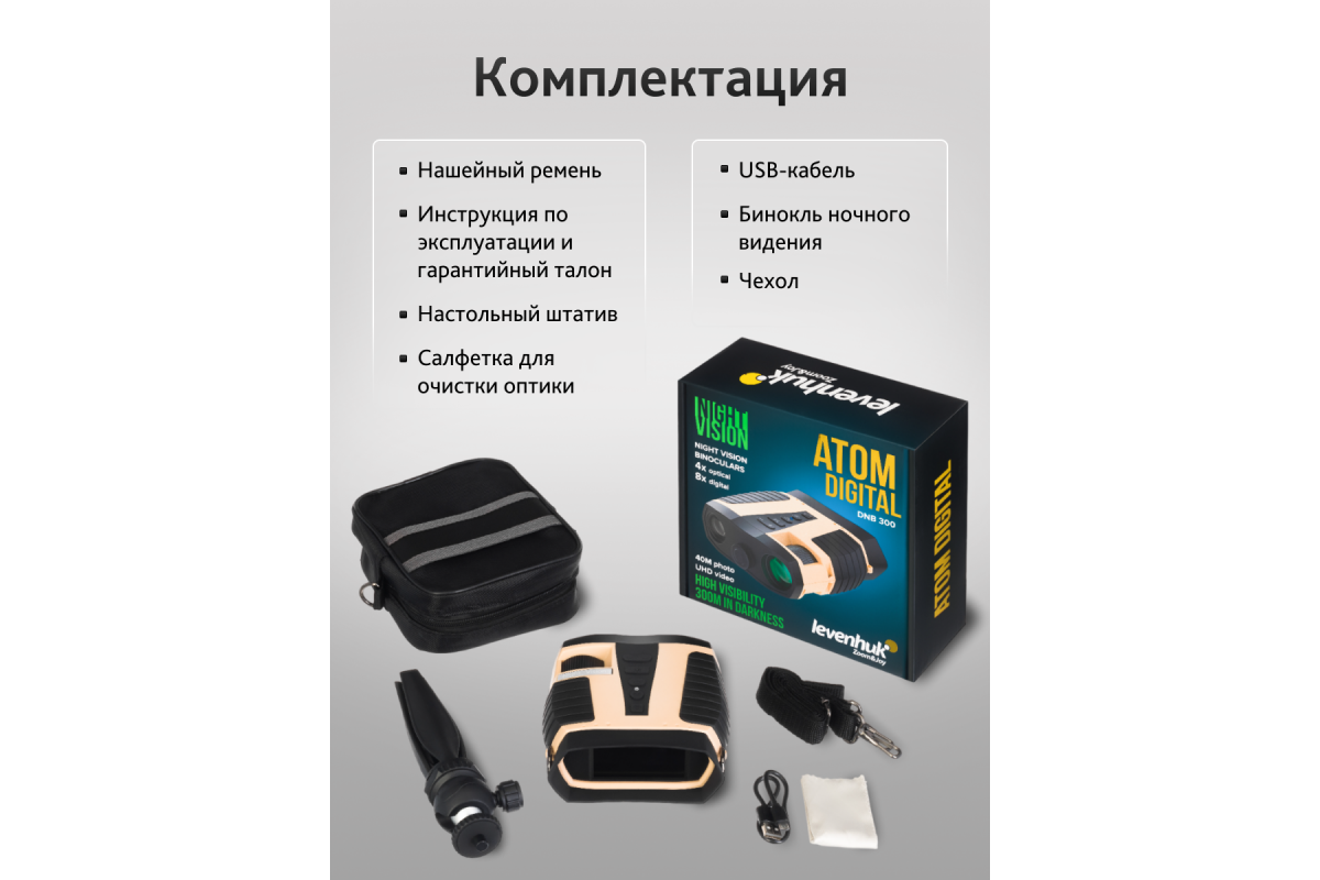 Levenhuk Atom Digital DNB300 – это бинокль ночного видения, который отлично подходит для наблюдений при любом освещении: и в абсолютной темноте, и при свете звезд, и в дневное время. Прибор оборудован CMOS-матрицей, встроенным IPS-дисплеем с хорошей цветопередачей и ИК-подсветкой. Бинокль станет надежным помощником охотника и любителя походов, поможет в решении профессиональных задач в охране, поисковых операциях и экспедиционном деле. Материалом корпуса прибора послужил ABS-пластик повышенной прочности – бинокль готов к работе в полевых условиях.