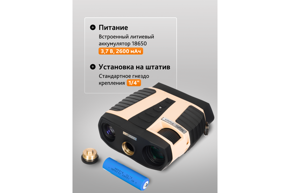 - Дополнительнофункция автоотключения экрана и прибора; режимы ночного видения при свете звезд и в полной темноте; штатив