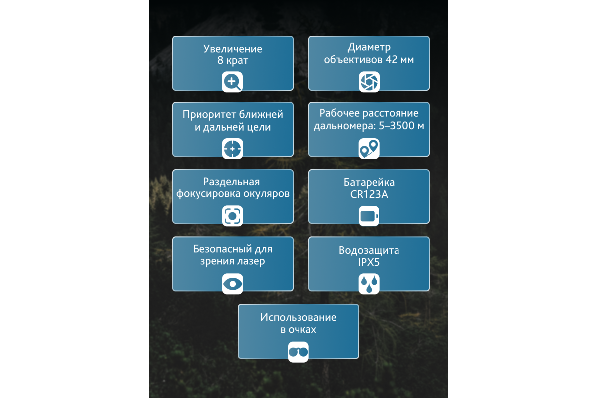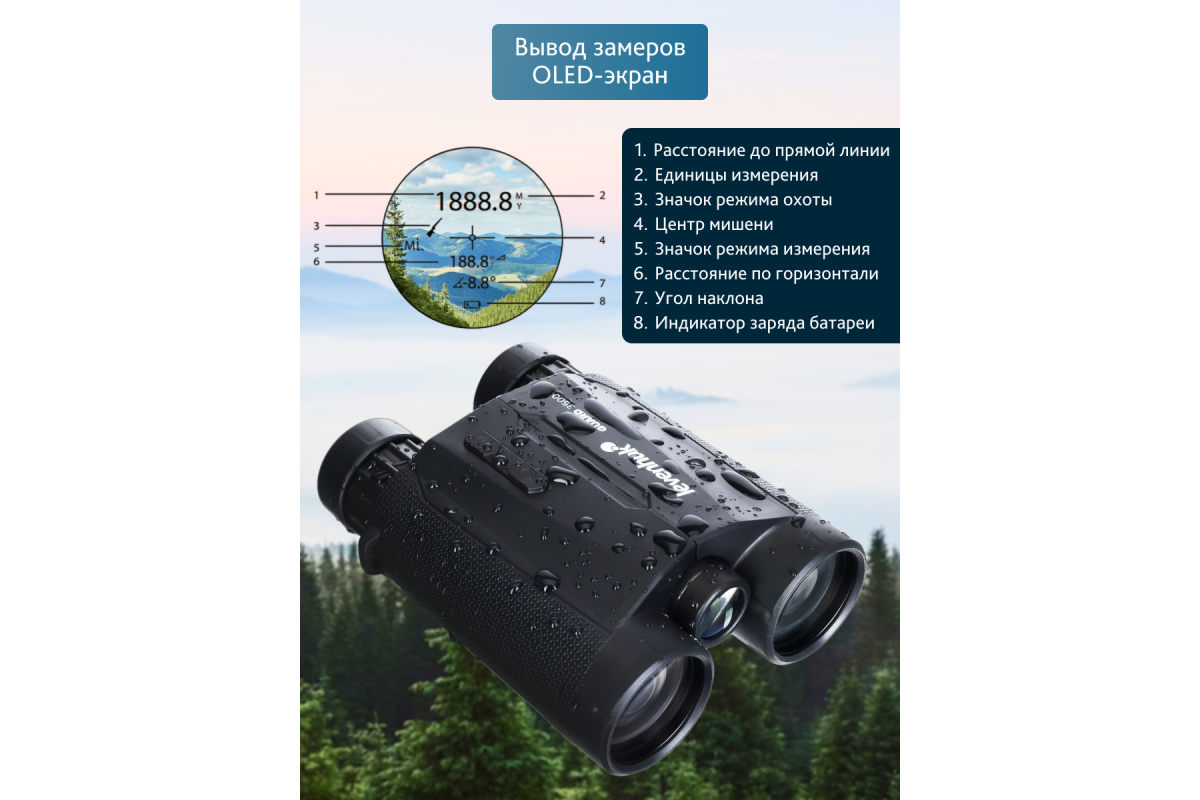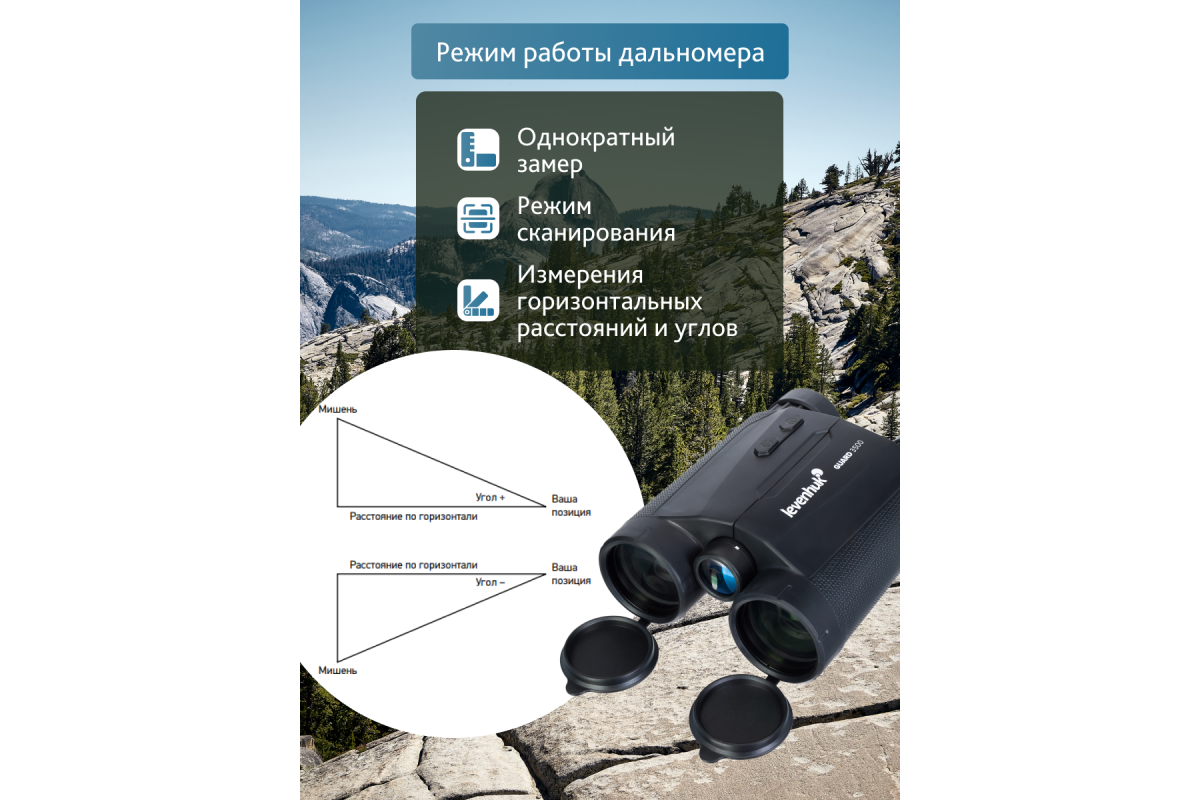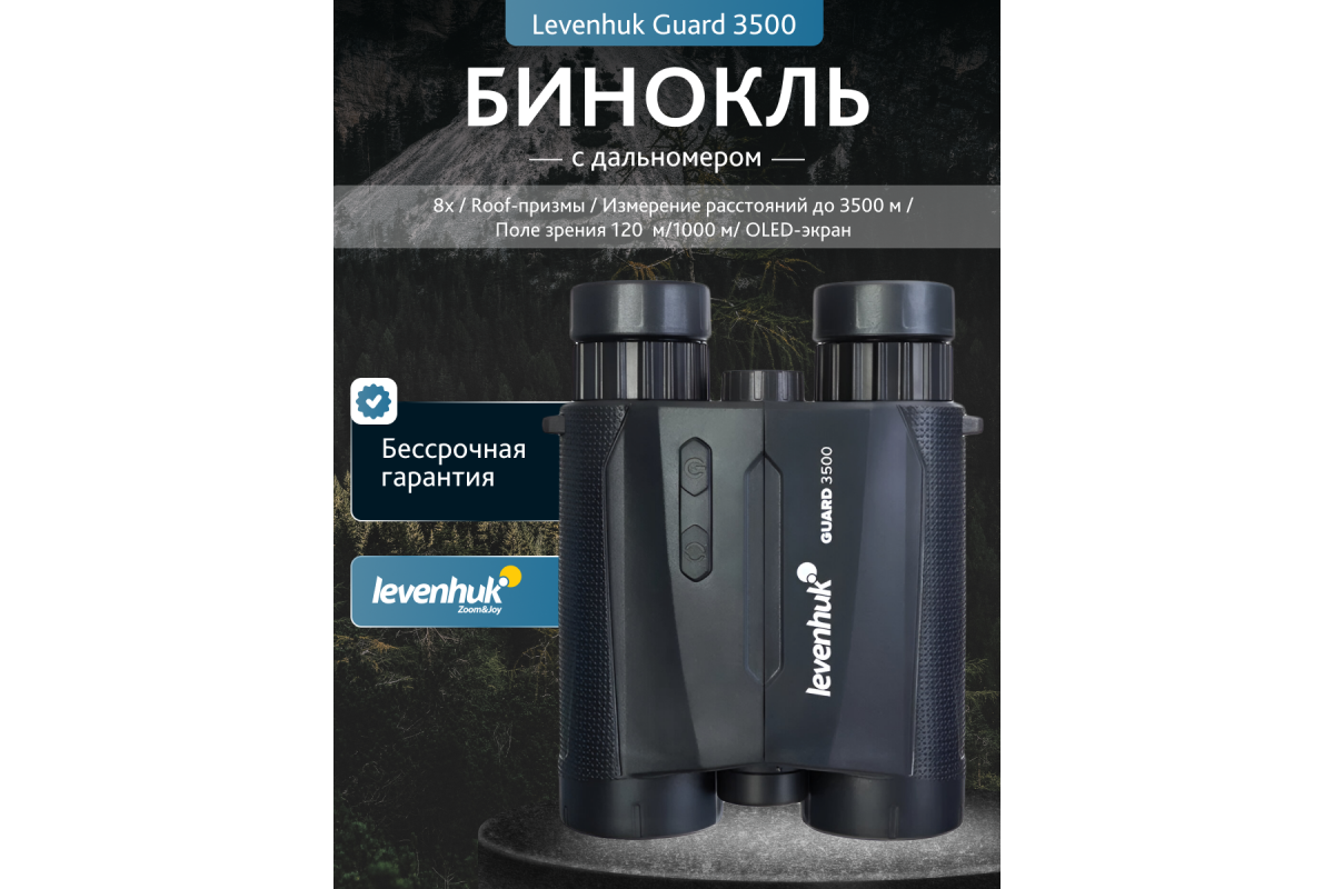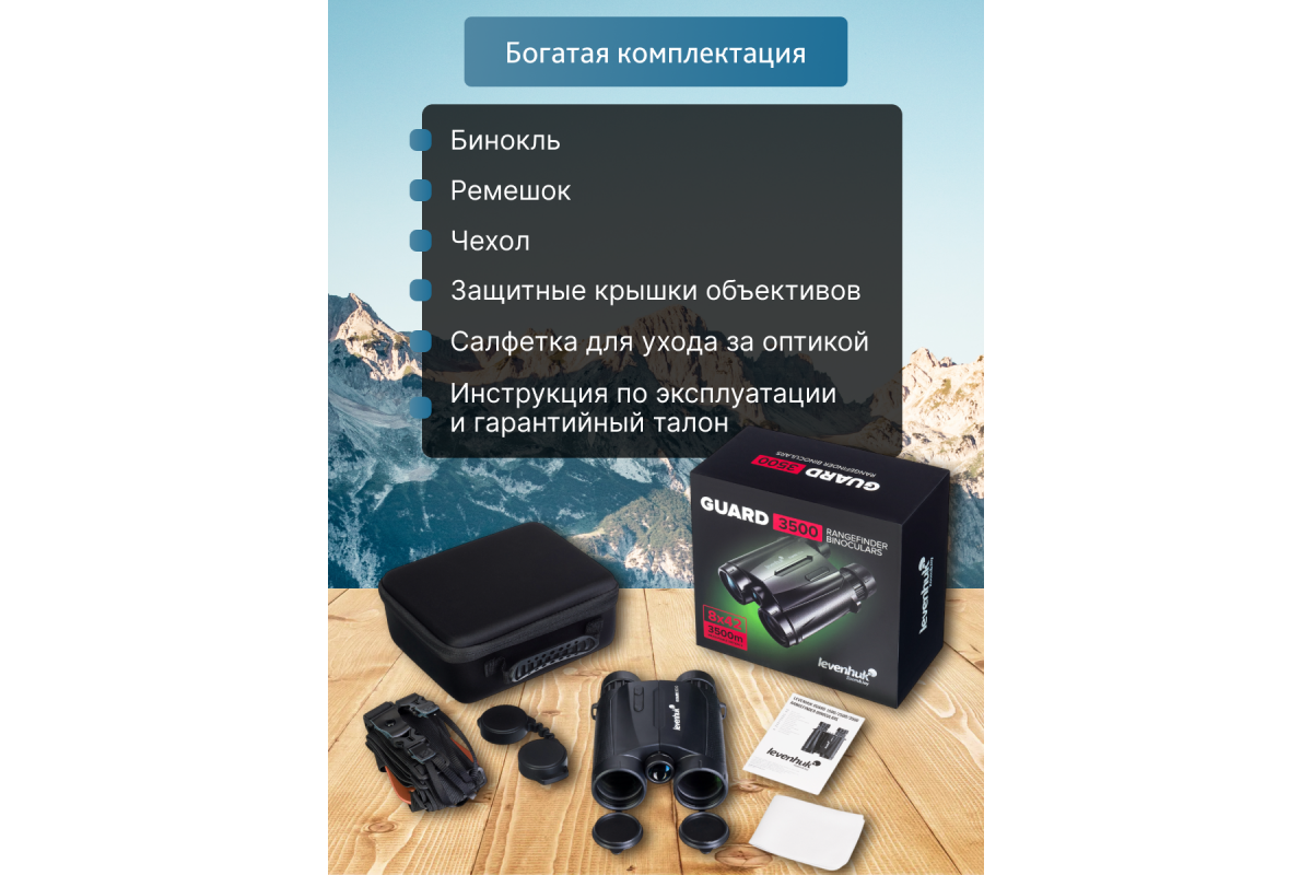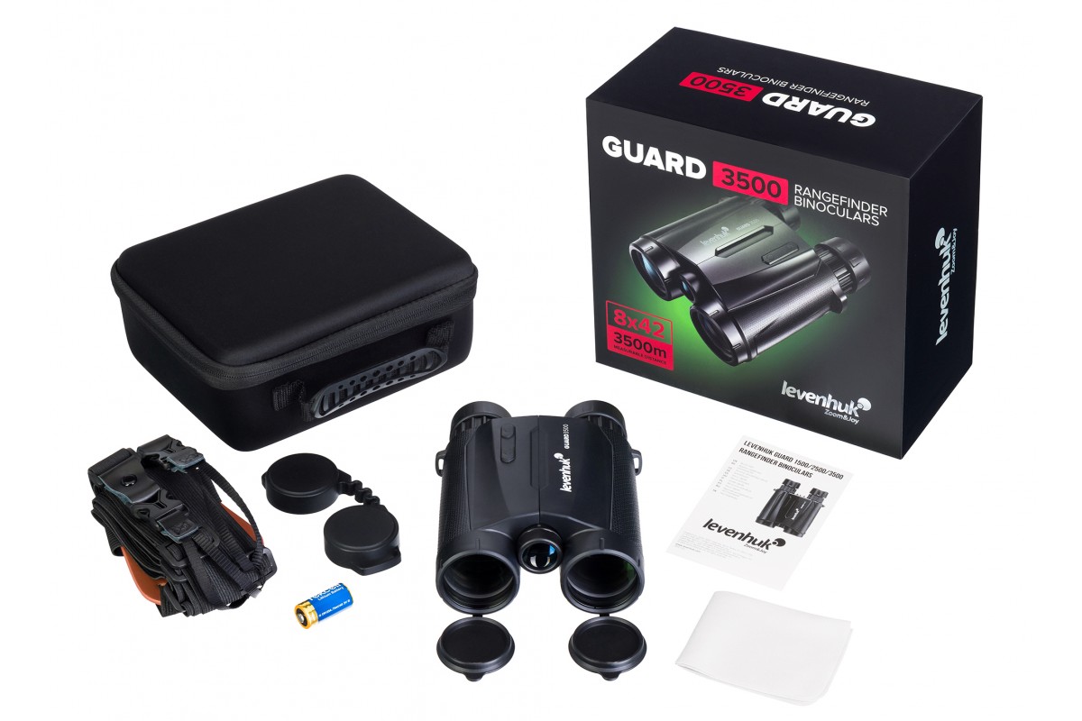 Бинокль Levenhuk Guard 3500 со встроенным лазерным дальномером – это прибор, подходящий для использования как профессионалами, так и любителями, сочетающий в себе функции наблюдательного и измерительного инструмента. 8-кратное увеличение и широкое поле зрения позволяют пользователю вести обзорные наблюдения, изучать мелкие детали окружающей среды и отслеживать цели, а дальномер с рабочей дистанцией до 3500 метров помогает дополнительно измерять расстояния до объектов (видимые, горизонтальные) и определять углы. Levenhuk Guard 3500 будет полезен во многих ситуациях: на охоте, в походных условиях, при решении тактических задач, во время тренировок по спортивной стрельбе, при проведении охранных мероприятий.