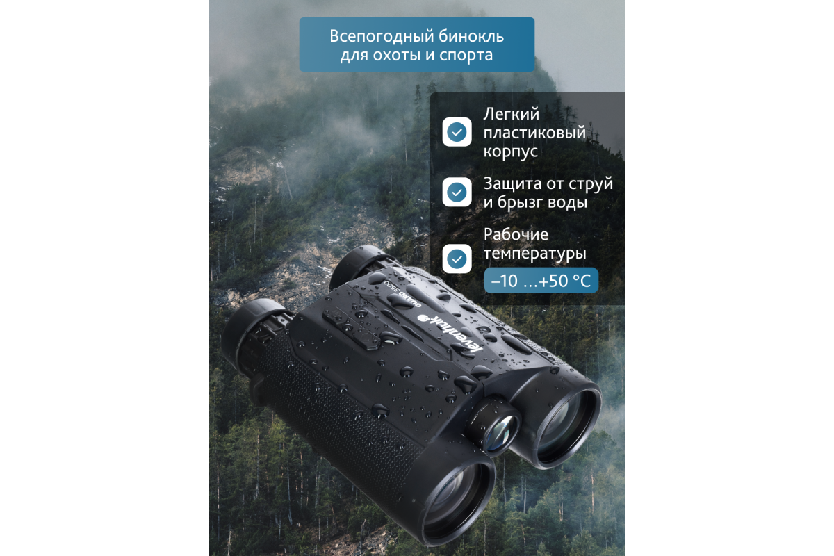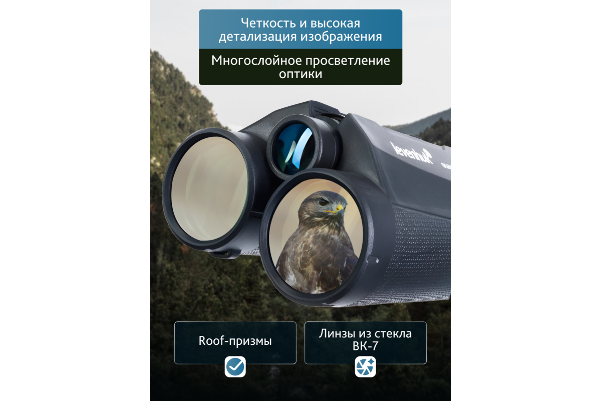Оптическая схема бинокля строится на основе roof-призм. Линзы имеют многослойное просветление, что в сочетании со светосильными объективами обеспечивает одинаково яркую, четкую и правдивую картинку, лишенную оптических искажений, как при дневном свете, так и в сумерках. Предусмотрена возможность настроить фокус каждого окуляра по отдельности. Межзрачковое расстояние регулируется – бинокль легко подстроить под индивидуальную физиологию.