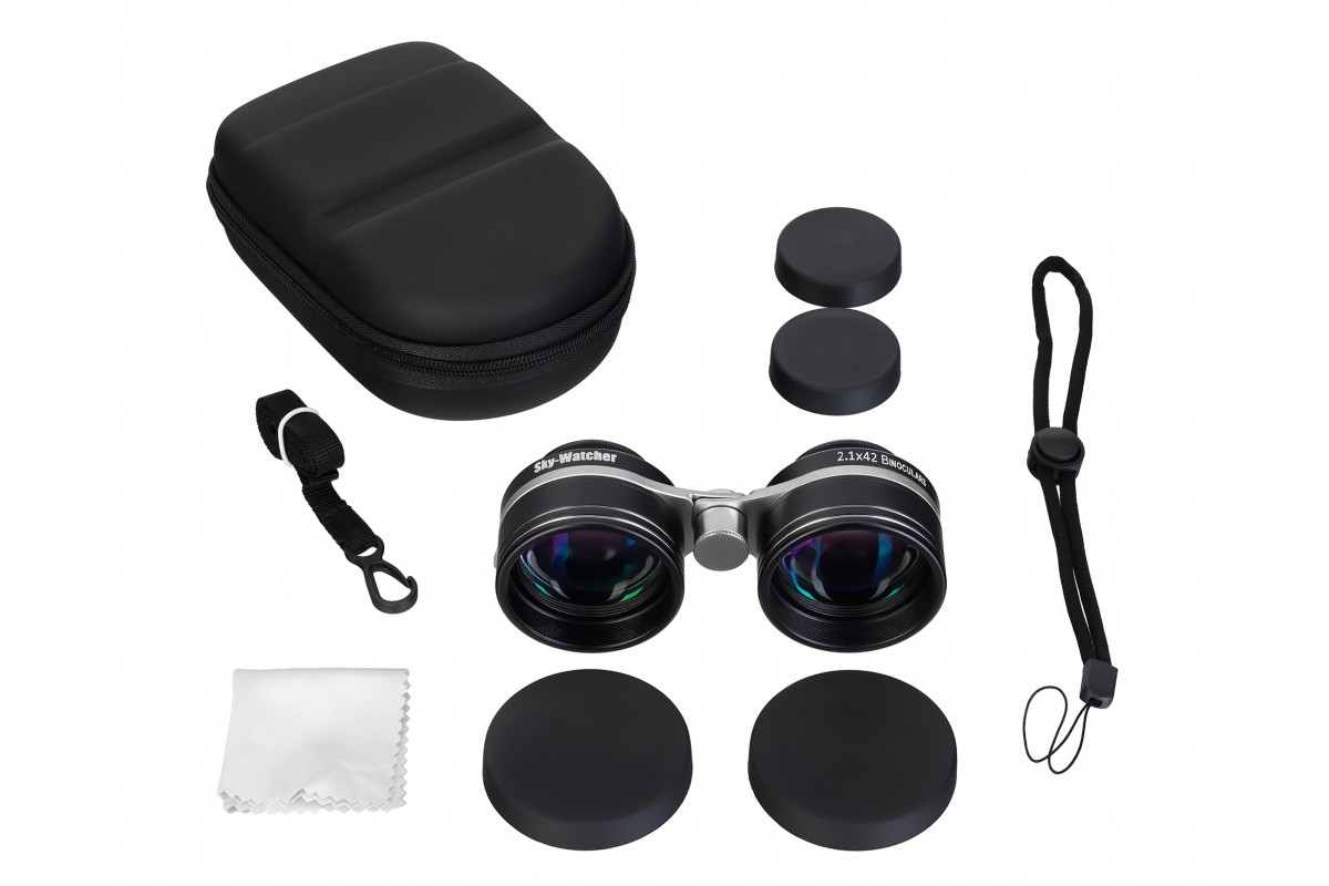 Вес Sky-Watcher 2,1x42 не достигает 400 г, за счет чего его удобно переносить с собой и использовать в полевых условиях – это заслуга особо компактной оптической схемы, называемой галилеевской. В комплект поставки входят ремешок на запястье и чехол, защищающие бинокль от случайных падений и повреждений при перевозке соответственно.