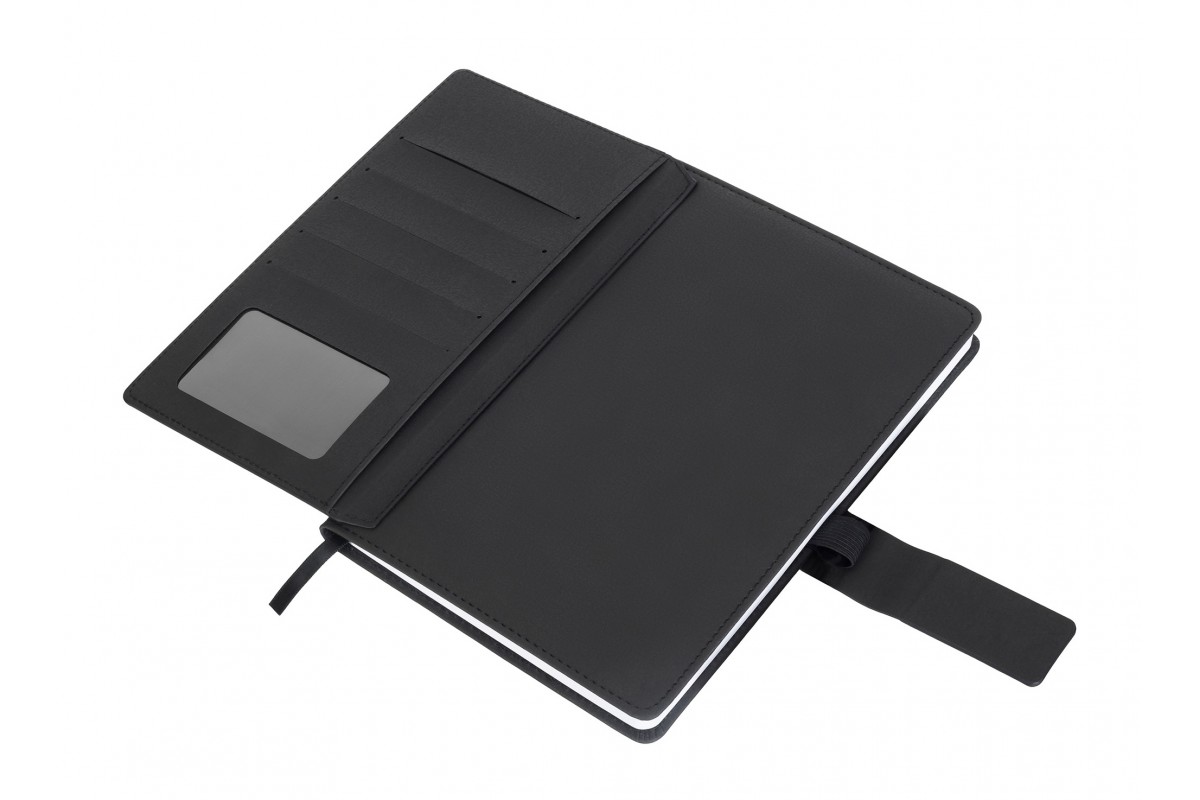 Обложка блокнота – неброского цвета, изготовлена из матовой искусственной кожи, приятной на ощупь. Внутри декоративного форзаца находятся кармашки для хранения кредитных карт и визиток; один из кармашков имеет прозрачное окошко. Закрывается блокнот при помощи магнитного хлястика с металлическим шильдиком в виде логотипа MAGUS.