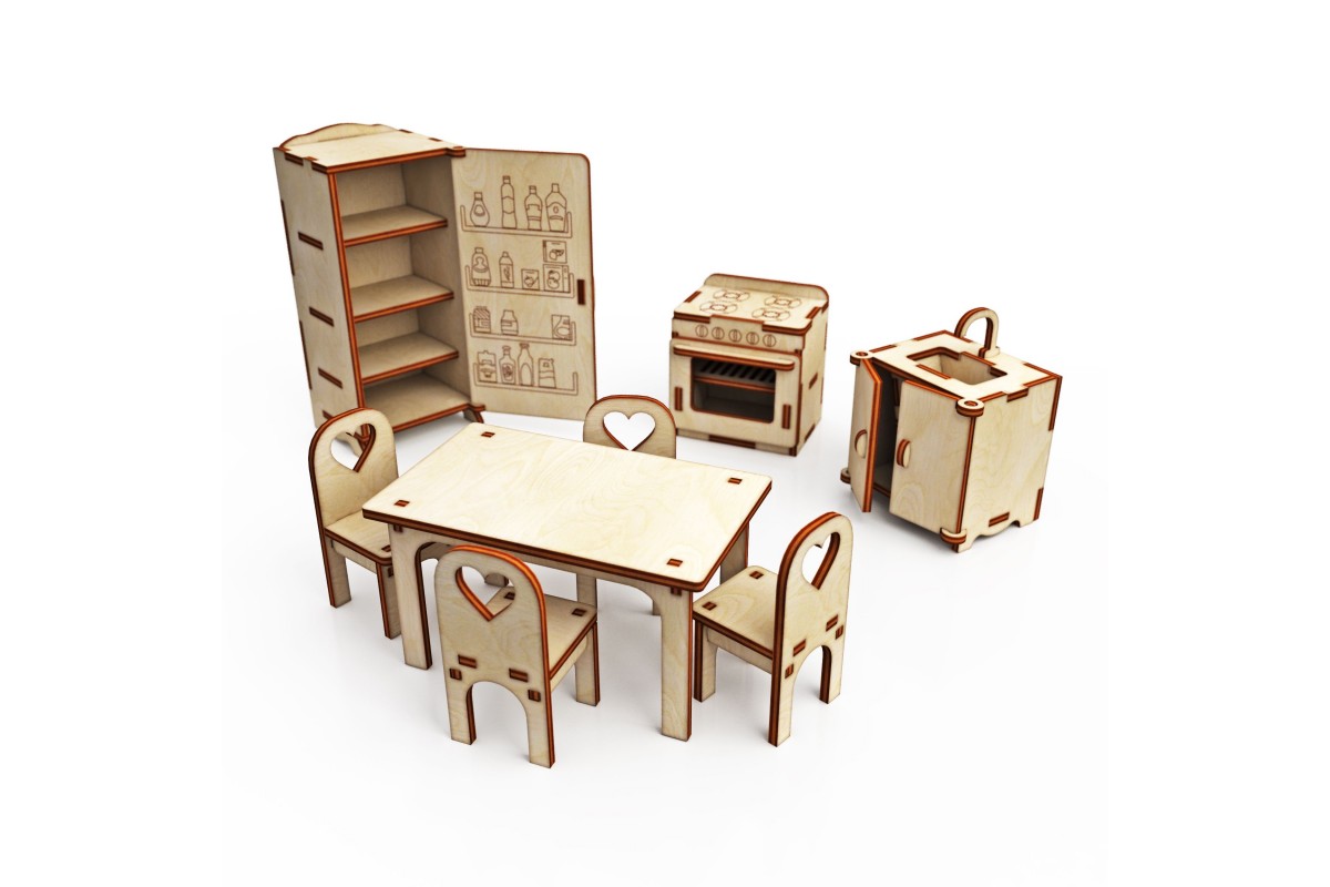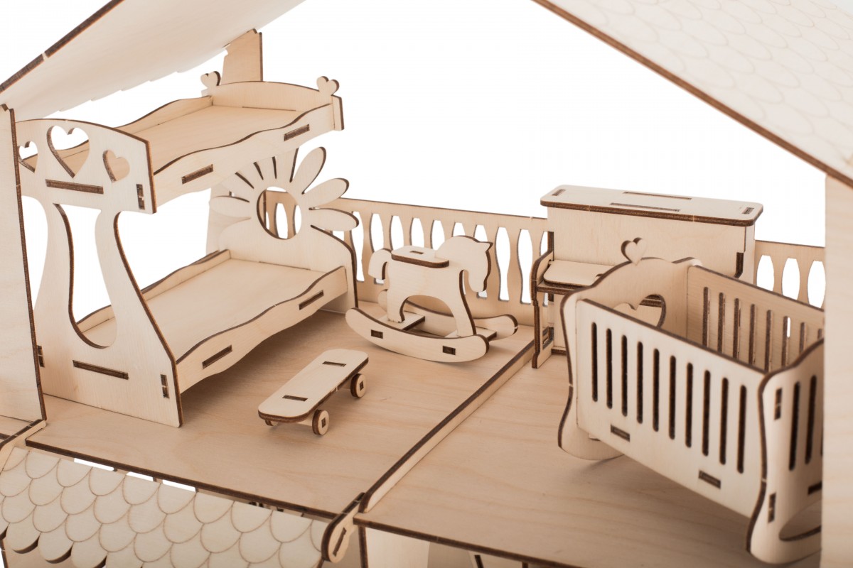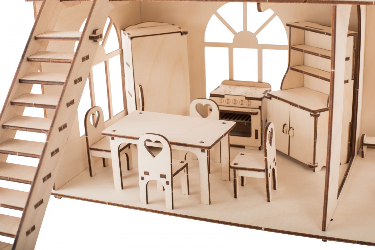 Мебель выполнена из березовой фанеры. Все элементы собираются без клея, просто вставляются в пазы, крепление очень прочное и надежное.