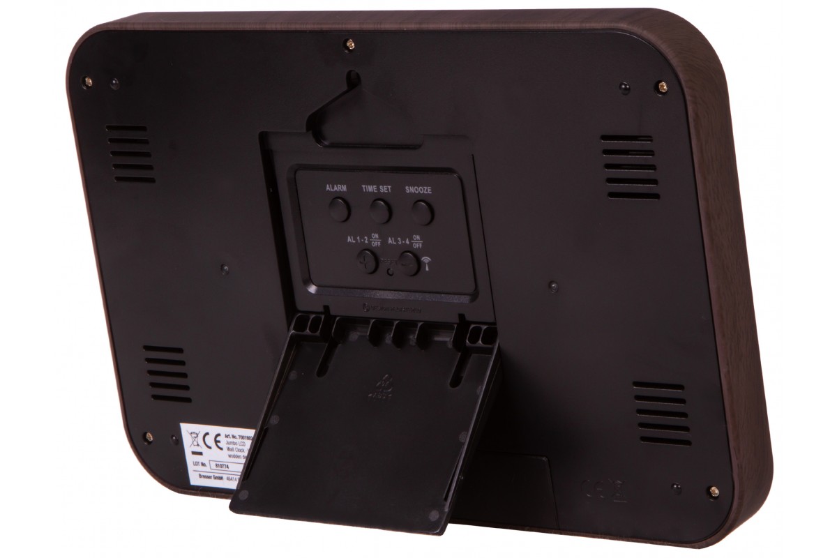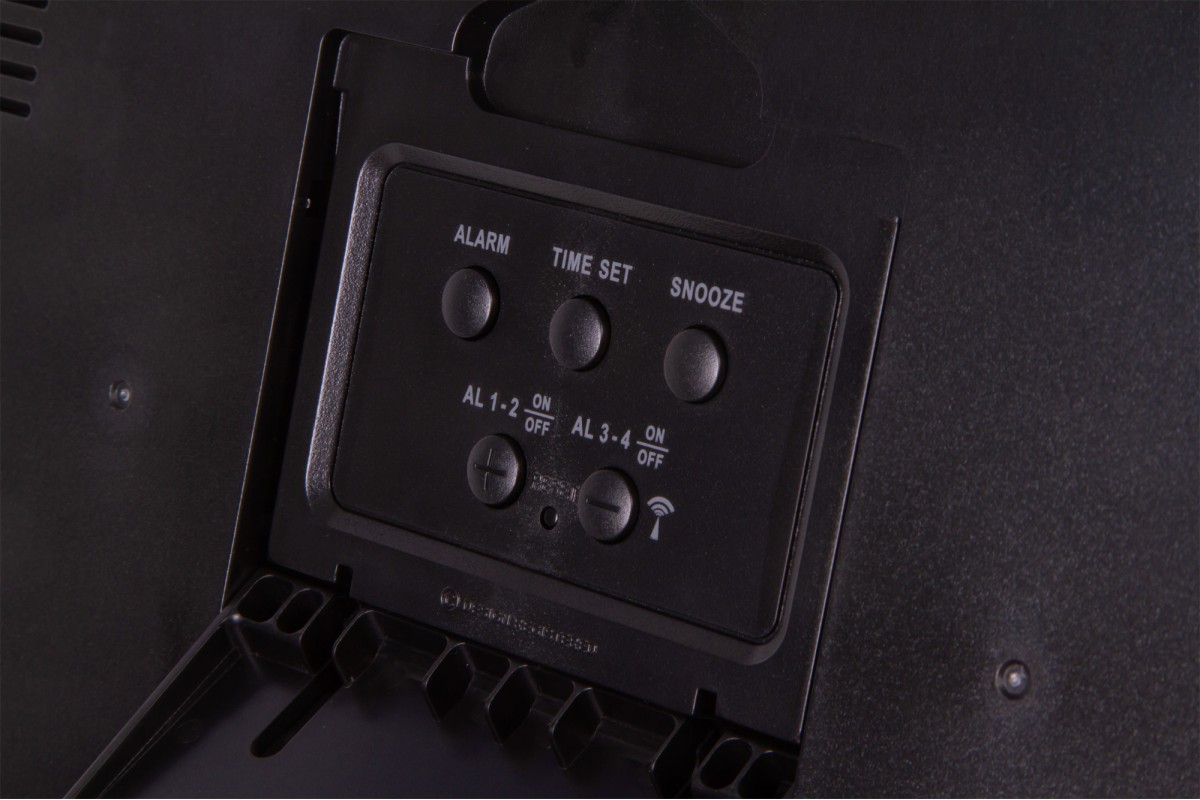 Из дополнительного функционала стоит отметить возможность установки до четырех будильников на разное время. Прибор работает от батареек (нет в комплекте) и может устанавливаться настенно или настольно. Кнопки управления расположены на задней стенке под защитной крышкой. Корпус сделан из пластика и декорирован под дерево.