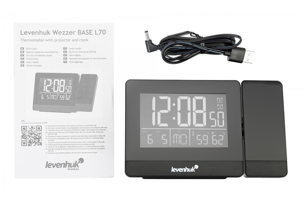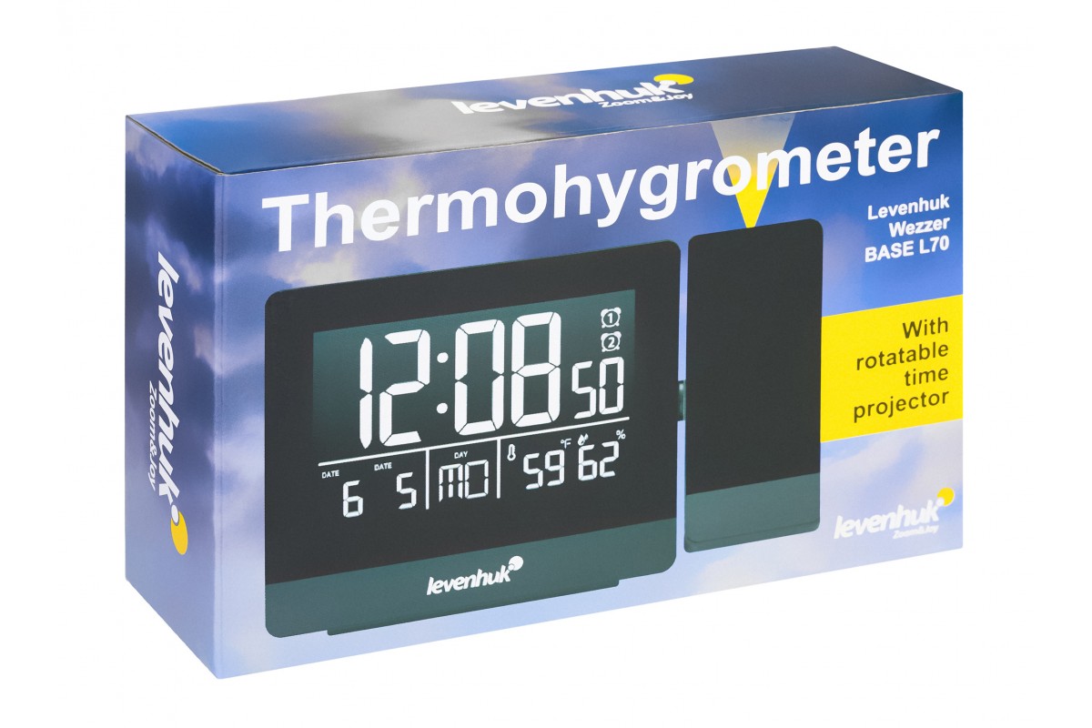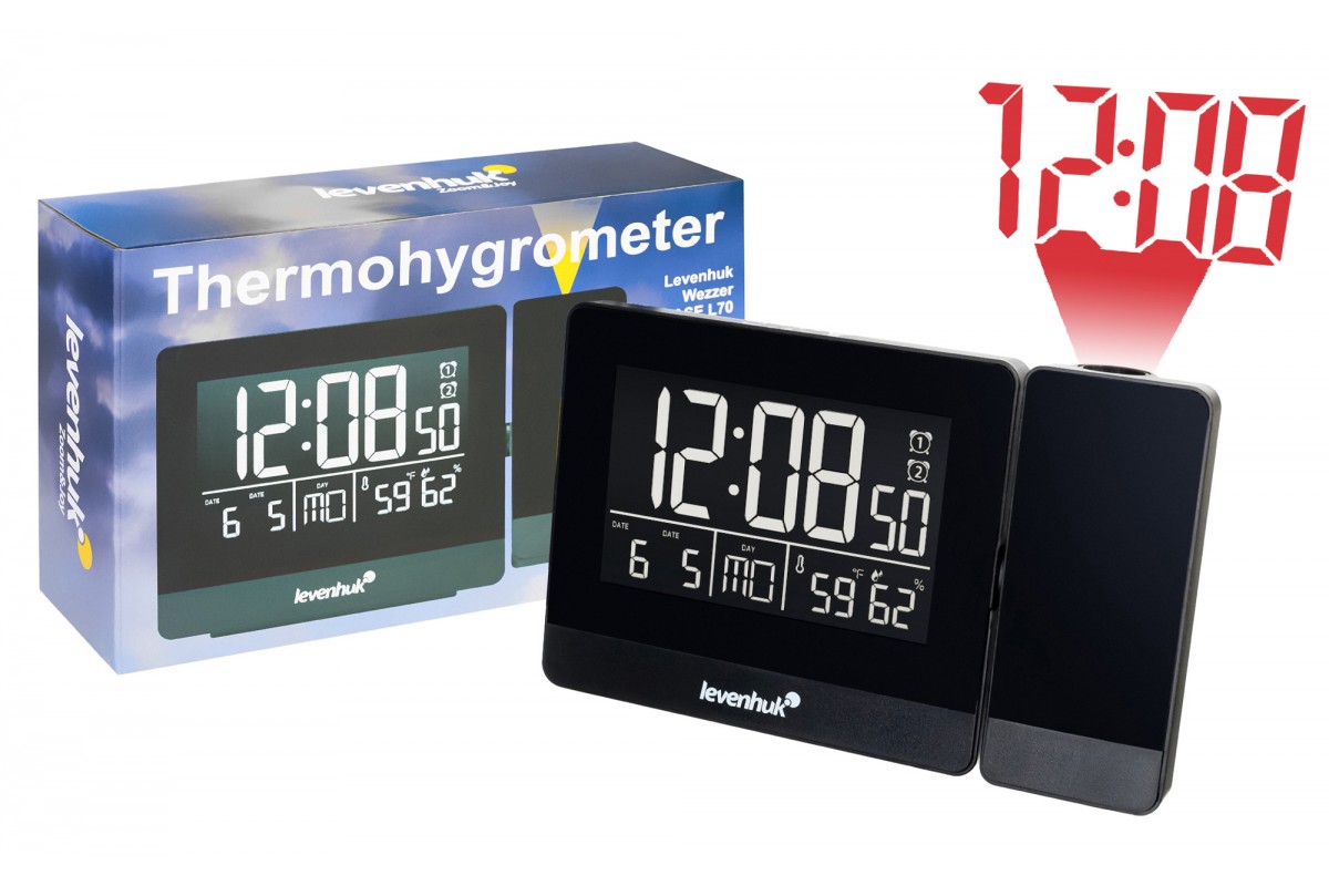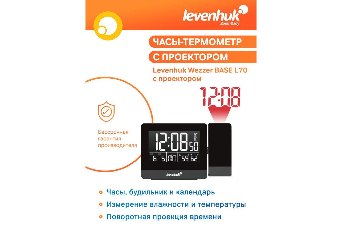 Levenhuk Wezzer BASE L70 – это часы-термометр с проектором и встроенным гигрометром. Стильный многофункциональный гаджет украсит собой любой интерьер, покажет точное время и поможет всегда быть в курсе основных параметров микроклимата – температуры и влажности. Кроме того, прибор оснащен будильником с возможностью установки двух сигналов. При желании сигнал можно откладывать одним нажатием кнопки, чтобы поспать подольше.