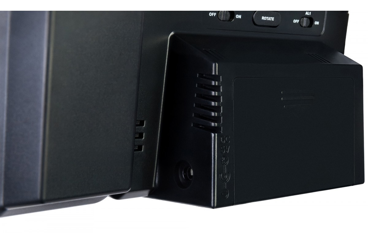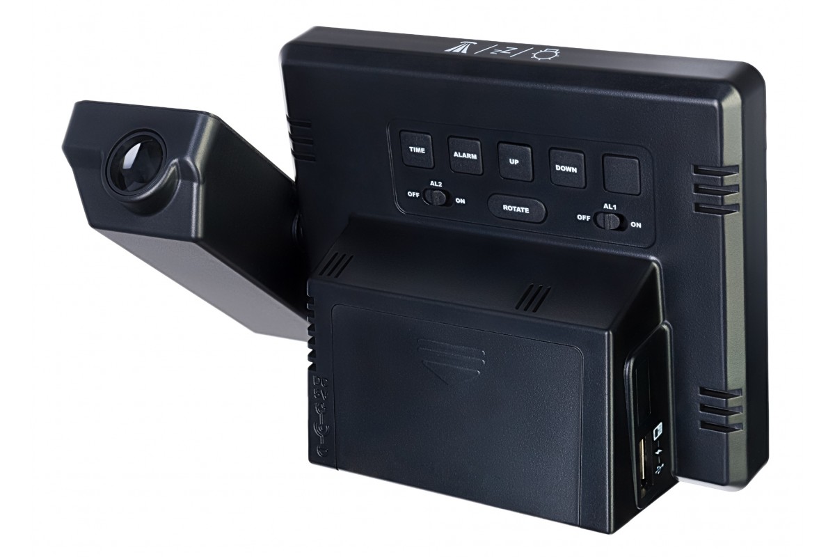 На ЖК-экране прибора отображаются все данные: время, дата, день недели, результаты измерений температуры и влажности. Справа от экрана расположен небольшой поворотный блок, который проецирует значение времени на стену, потолок или другую ровную поверхность. Если вы куда-то торопитесь, проекция будет очень кстати: не придется постоянно доставать смартфон, чтобы проконтролировать время. Прибор работает от батареек или от сети. При подключении к розетке доступна постоянная подсветка экрана.