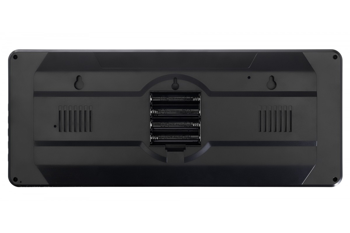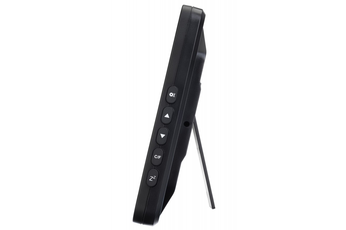 Первое, что бросается в глаза в этой модели, – это крупные цифры времени. Они хорошо различимы даже с большого расстояния, так как на экране занимают практически всю его высоту. Остальная информация подана более компактно, но тоже четко. Меньшим шрифтом отображаются метеоданные, символы часов и календаря. Также на экране есть место и для двух иконок: одна – это будильник, вторая – функция отложенного повтора сигнала. Для управления настройками прибора используются кнопки на правой стороне корпуса: они хорошо прощупываются, управлять удобно даже вслепую.