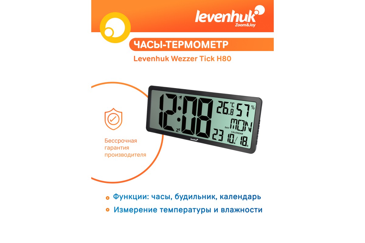 Levenhuk Wezzer Tick H80 – это часы с дополнительными функциями термометра и гигрометра. Также здесь есть календарь и будильник. Это классический набор функций для полезного домашнего гаджета, чтобы следить за временем, вовремя просыпаться по утрам, а также контролировать колебания влияющих на самочувствие температуры и влажности воздуха. Крайне полезный прибор в стильном и лаконичном исполнении.