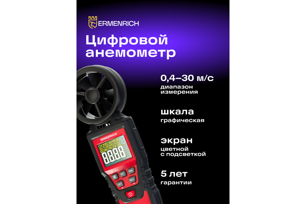 Анемометр Ermenrich Seek DN20 – цифровой прибор для измерения скорости воздушного потока. Компактные размеры и встроенный крыльчатый датчик позволяют проводить замеры оперативно, как на улице, так и в помещении. Цветной экран с подсветкой дает возможность работать в условиях с плохим освещением.