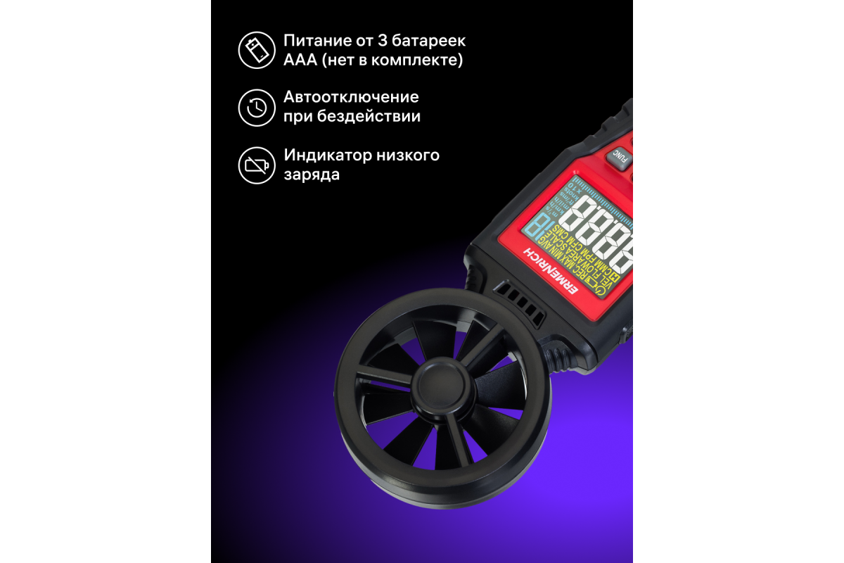 - Погрешность измерения±(2%+0,5 м/с); ±(2%+1,8 км/ч); ±(2%+1,6 фут/с); ±(2%+1 узел); ±(2%+1,1 миль/ч); ±(2%+10 фут/м)