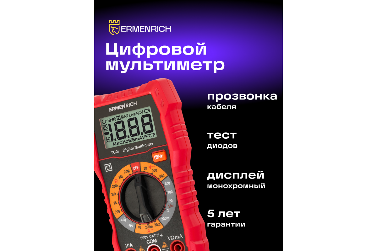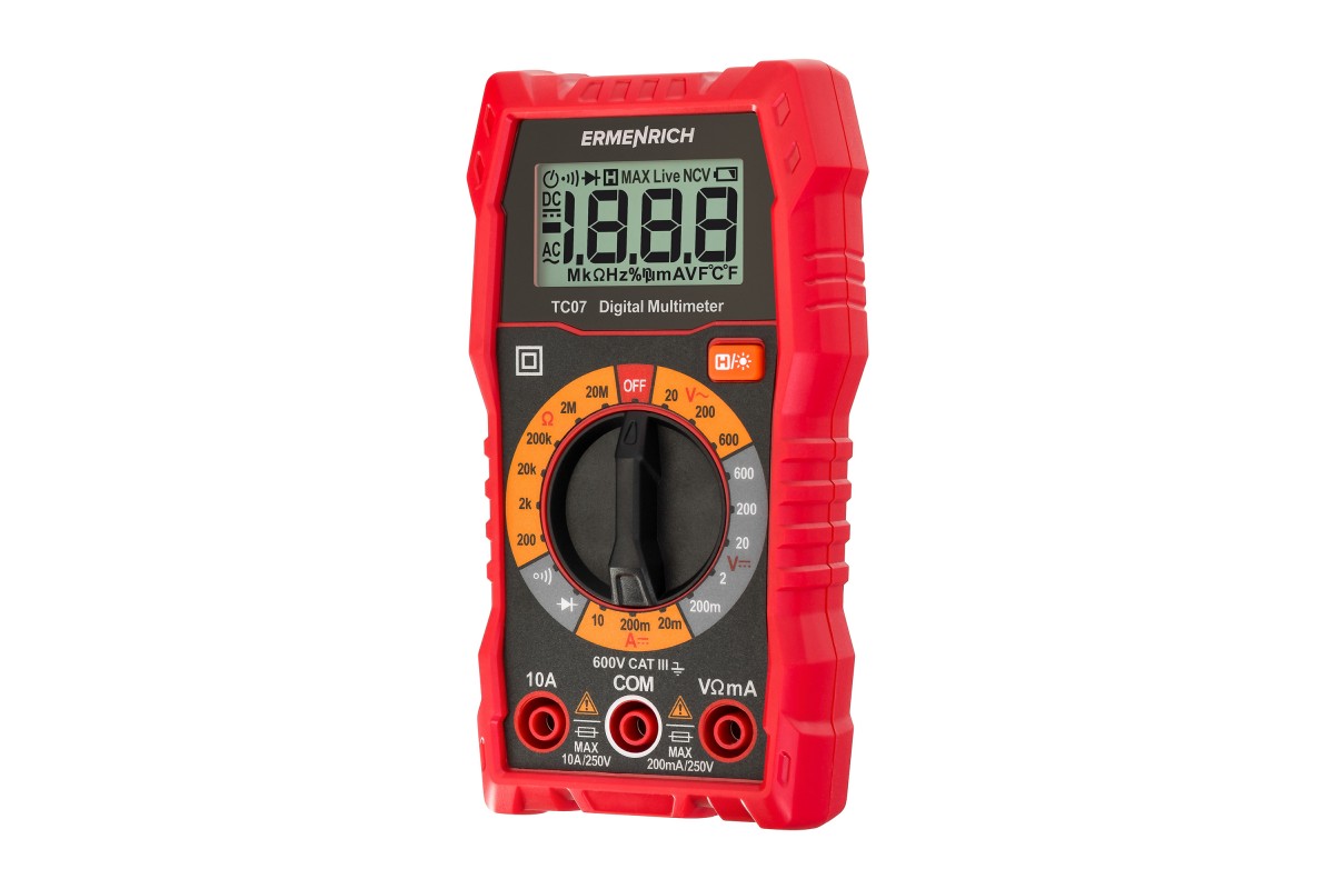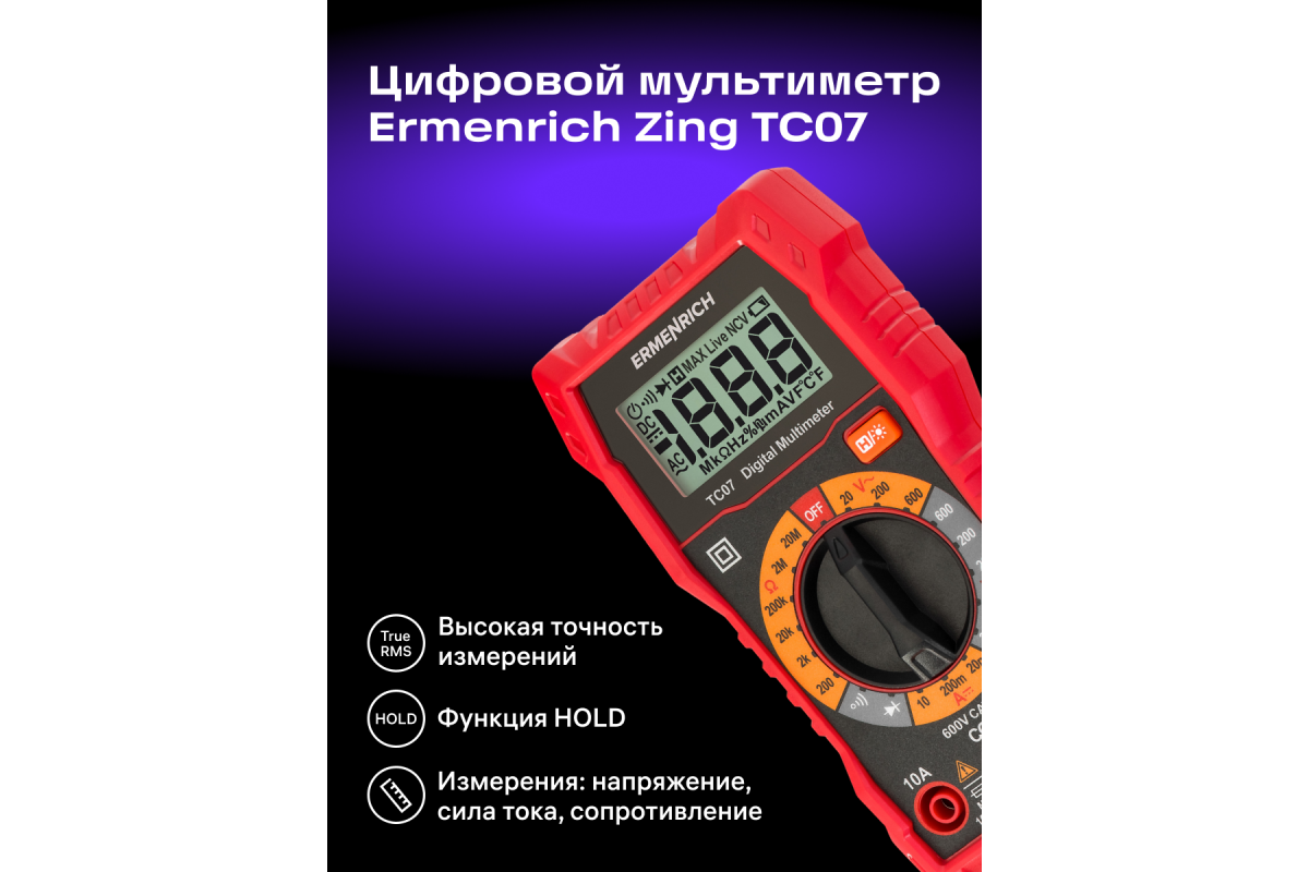 Ermenrich Zing TC07 – цифровой мультиметр для измерения постоянного и переменного напряжения, постоянного тока и сопротивления по истинному среднеквадратичному значению (метод True RMS) с высокой точностью результатов. Режимы работы и диапазоны измерений выбираются с помощью удобного поворотного переключателя. Прибор пригодится в быту при самостоятельном ремонте электросети, а также будет полезен профессиональным электрикам при проведении стандартных электротехнических измерений.