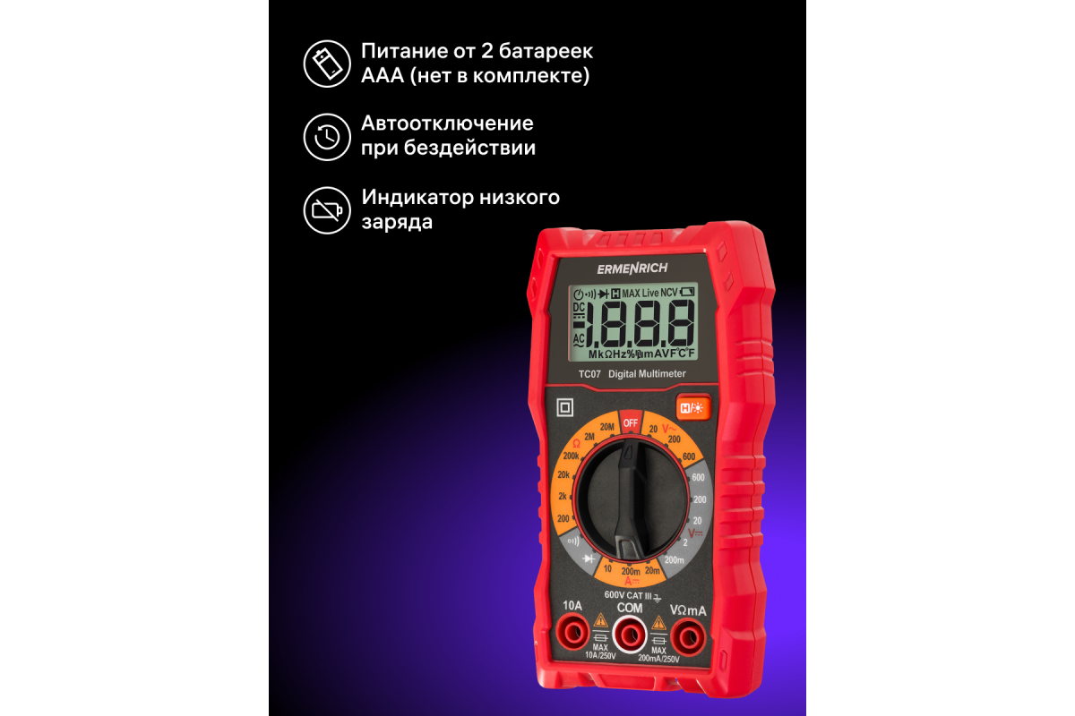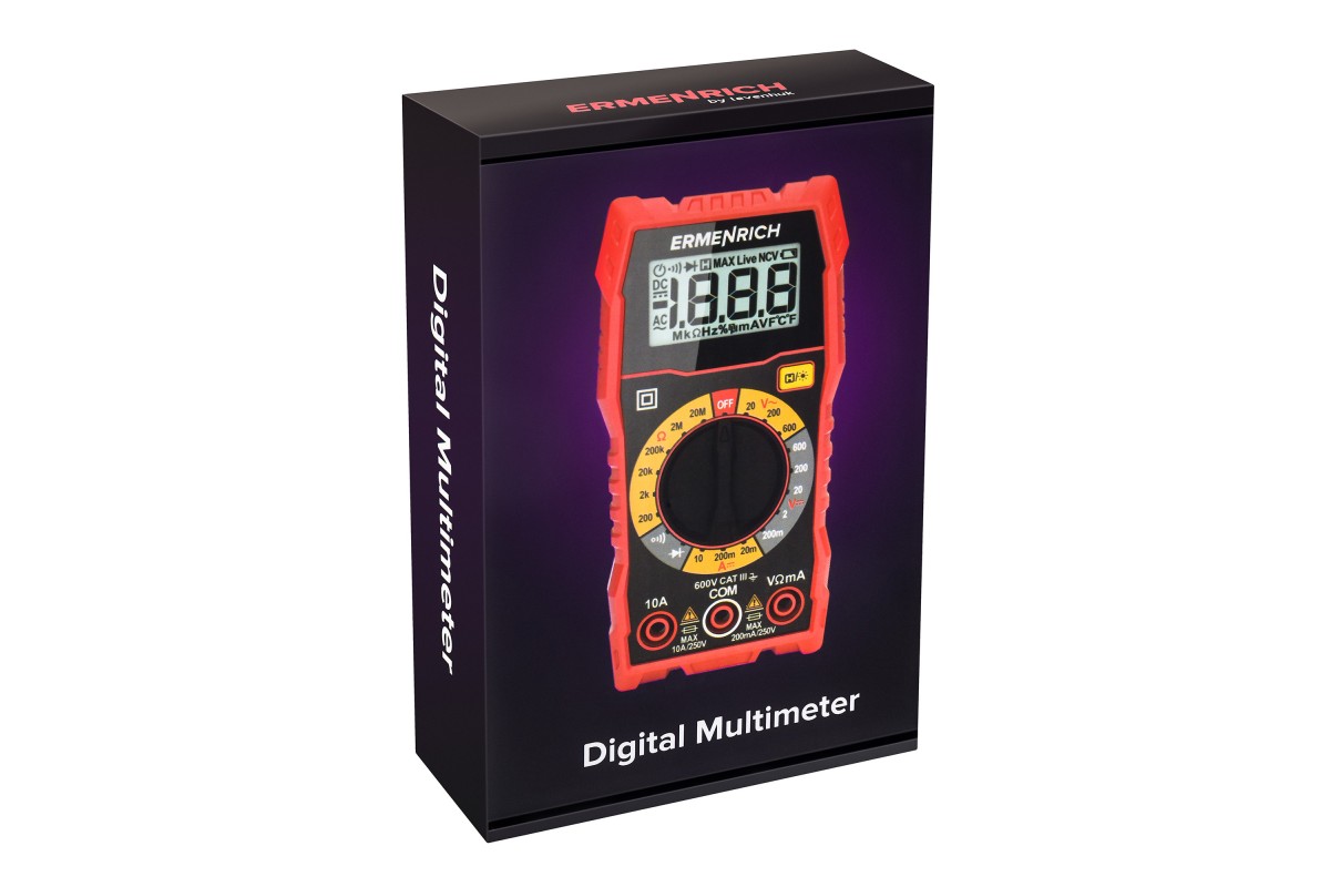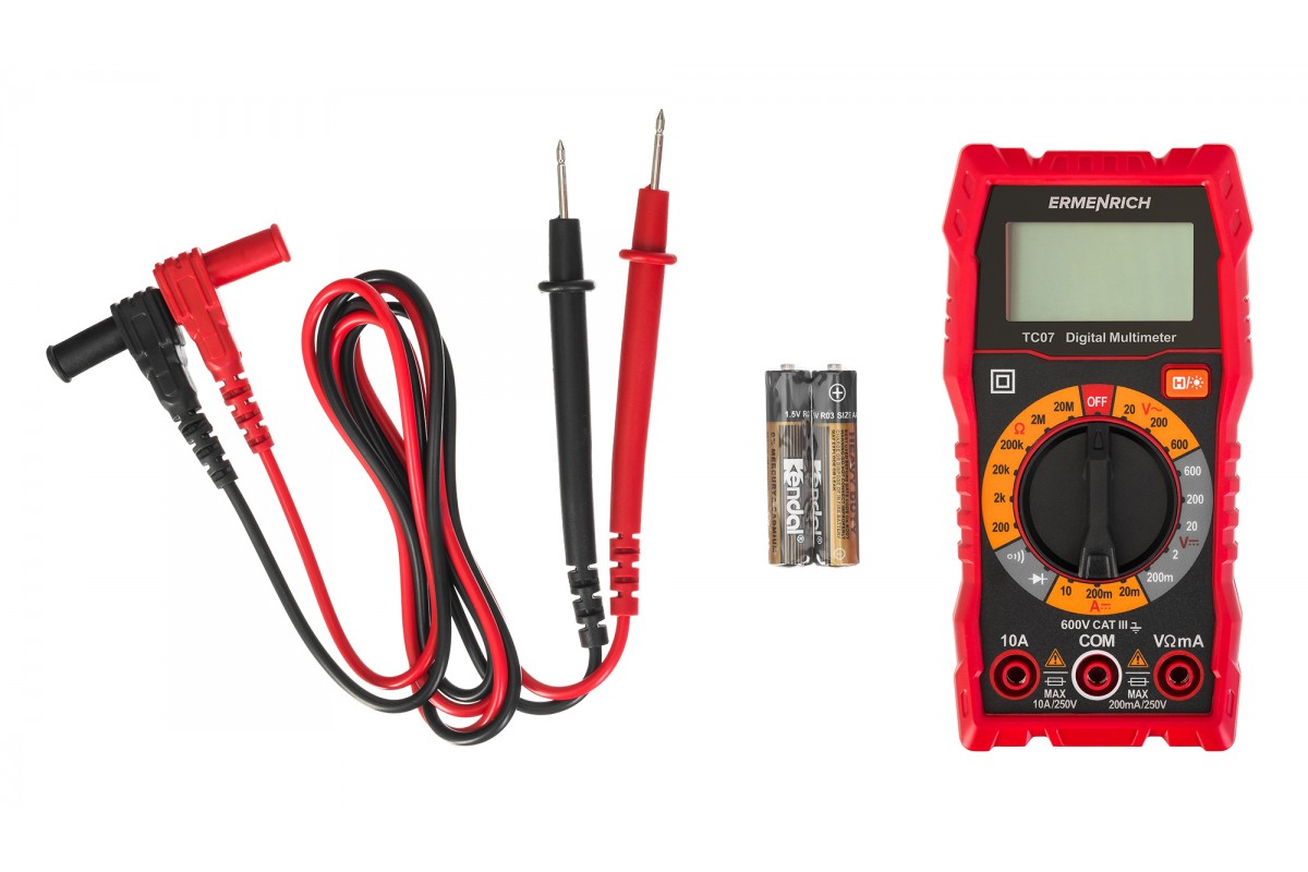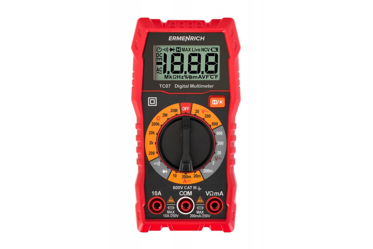Ermenrich Zing TC07 – цифровой мультиметр для измерения постоянного и переменного напряжения, постоянного тока и сопротивления по истинному среднеквадратичному значению (метод True RMS) с высокой точностью результатов. Режимы работы и диапазоны измерений выбираются с помощью удобного поворотного переключателя. Прибор пригодится в быту при самостоятельном ремонте электросети, а также будет полезен профессиональным электрикам при проведении стандартных электротехнических измерений.