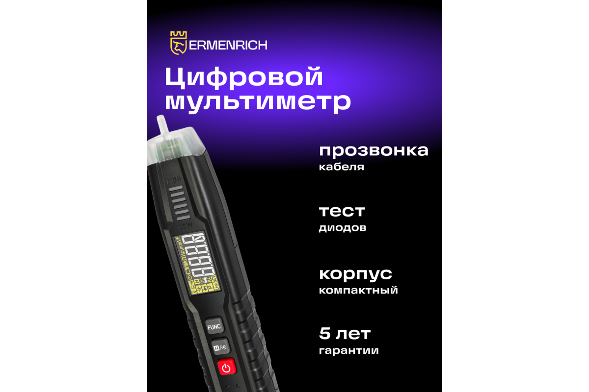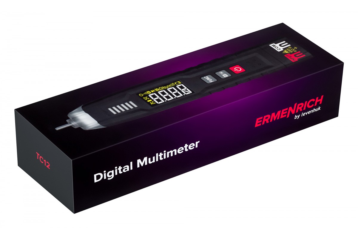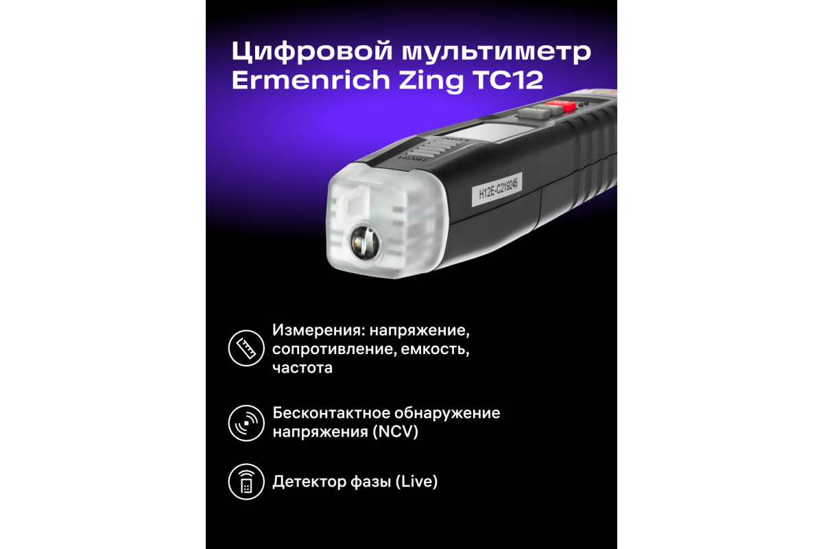 Ermenrich Zing TC12 - многофункциональный карманный мультиметр для измерения целого ряда электротехнических величин: постоянного и переменного напряжения, частоты, емкости и сопротивления. Кроме того, с помощью этого тестера определяют обрыв проводника, короткое замыкание, пробой или обрыв диода. Но это еще не все: Ermenrich Zing TC12 помогает обнаружить скрытую проводку в полу или в стене, определить фазу и последовательность фаз в трехфазной сети. И все эти возможности предоставляет прибор размером с авторучку! Мультиметр можно использовать дома при ремонте электропроводки. Оценят его и профессиональные электрики, которым нужен легкий, но при этом функциональный рабочий инструмент.