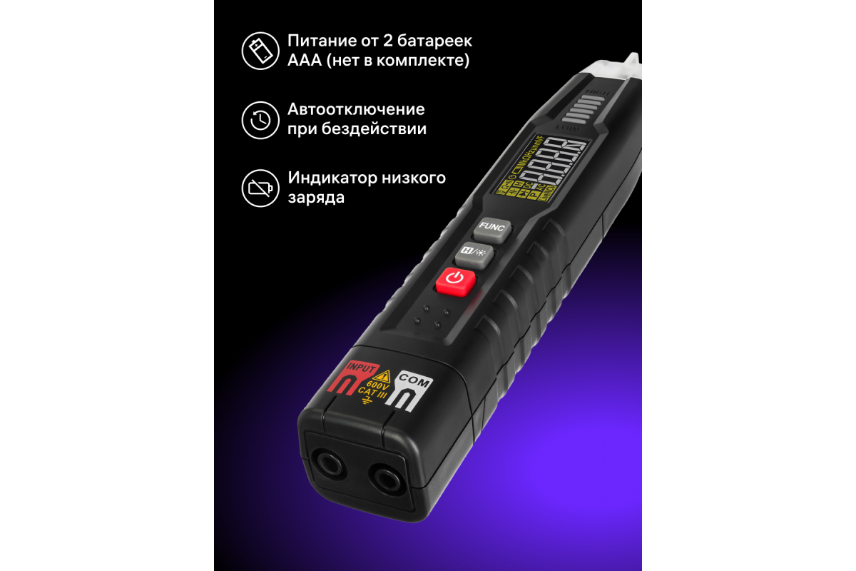 Питание прибора осуществляется от 2 батареек типа AAA, уровень заряда визуализируется на дисплее. Если тестер определенное время не используется, то он автоматически отключается.