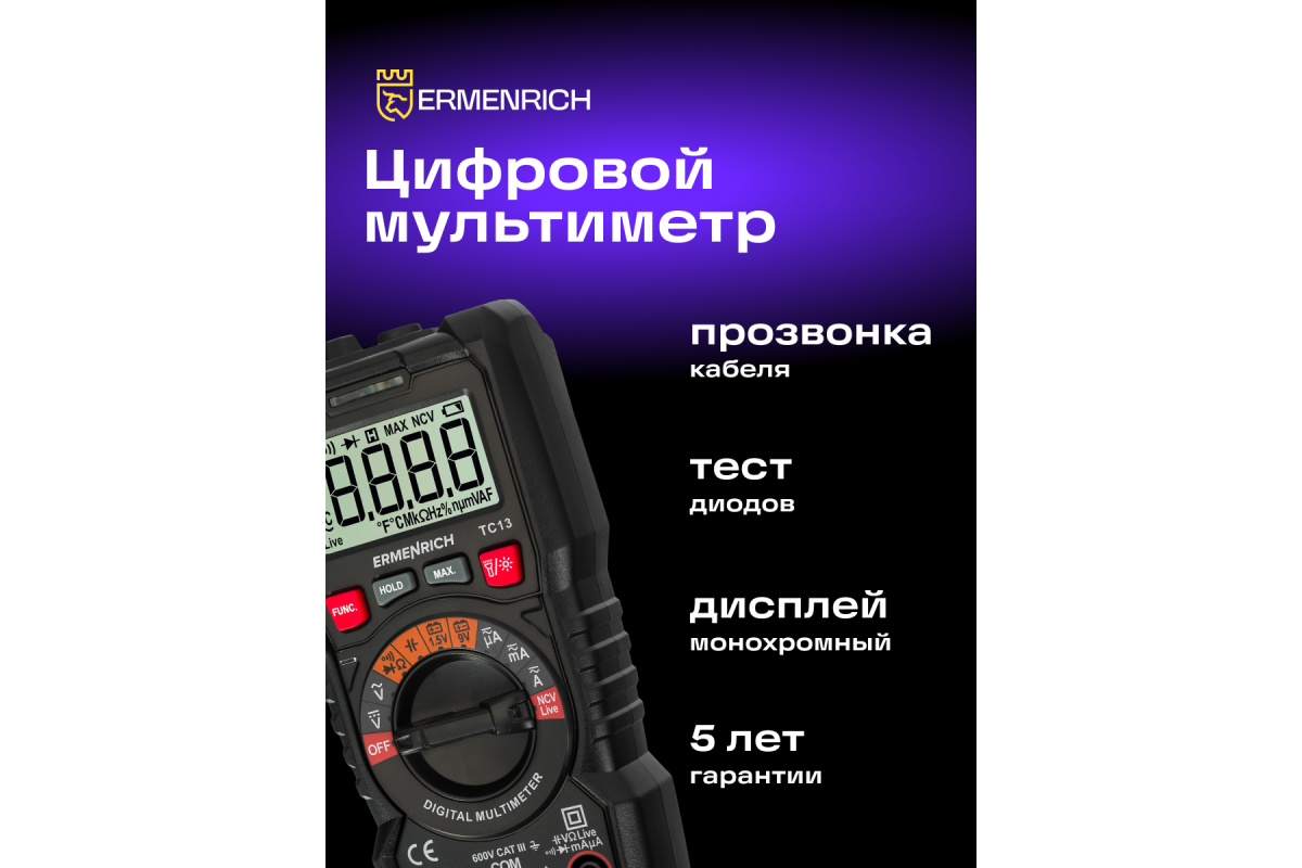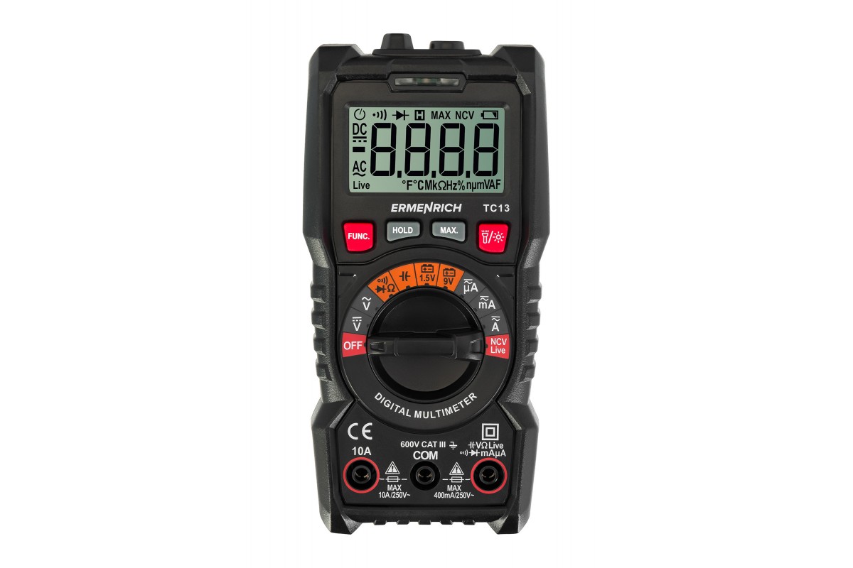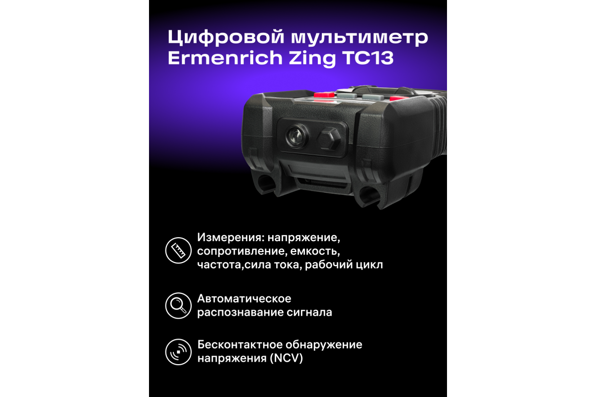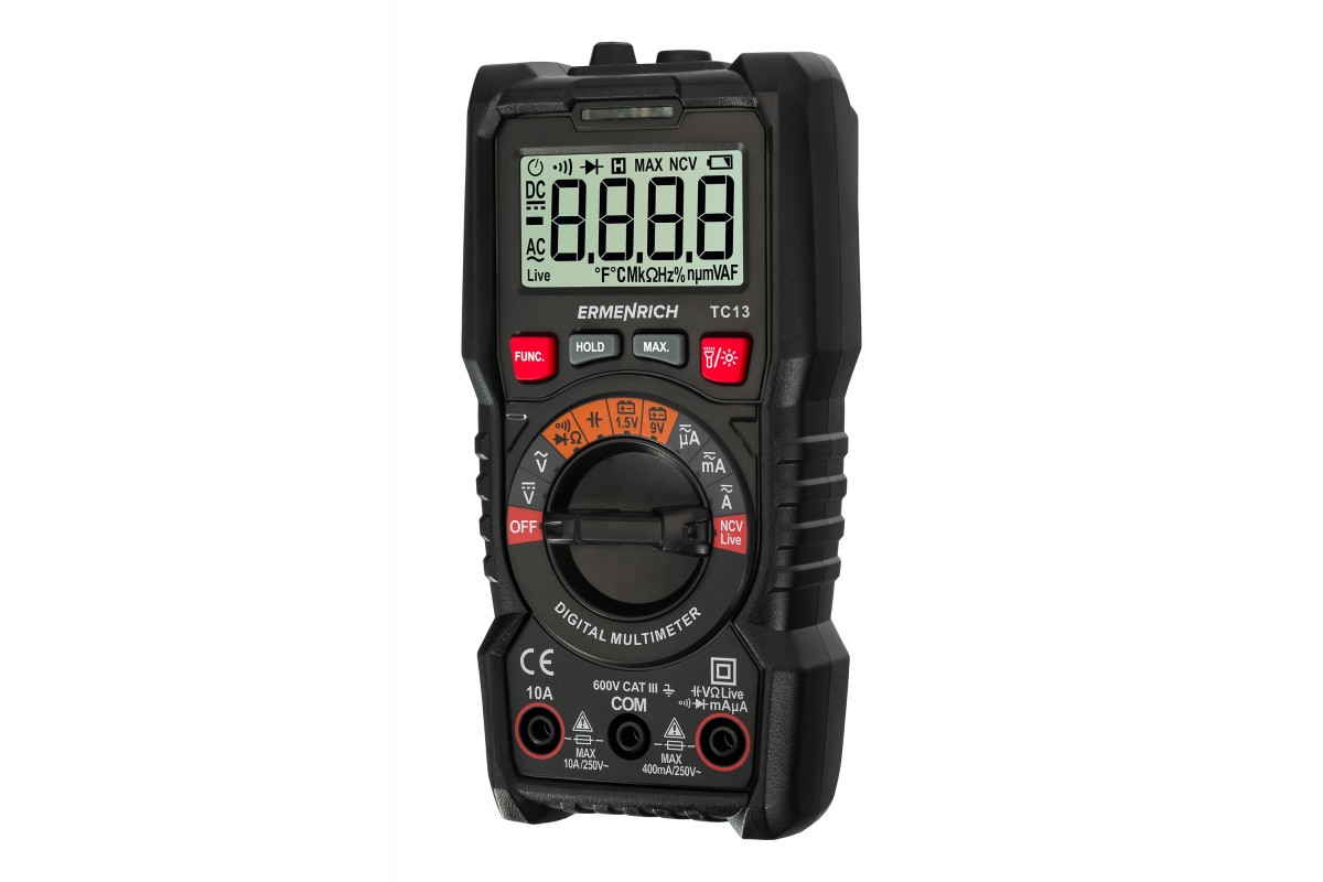 Ermenrich Zing TC13 – портативный цифровой измеритель для измерения силы тока, напряжения и сопротивления, а также частоты, емкости и рабочего цикла. Кроме того, с его помощью можно определять обрывы и пробои диодов, короткое замыкание, обрыв кабеля. Есть функция бесконтактного обнаружения скрытой проводки под напряжением. Мультиметр оснащен ЖК-дисплеем для отображения режимов работы и результатов измерений.