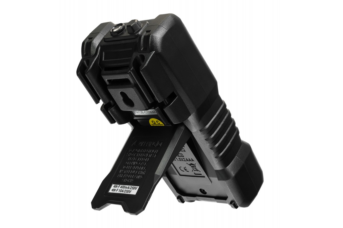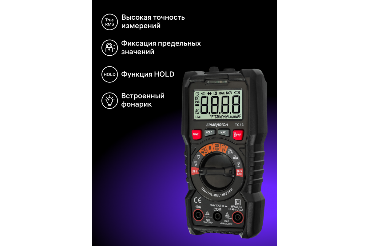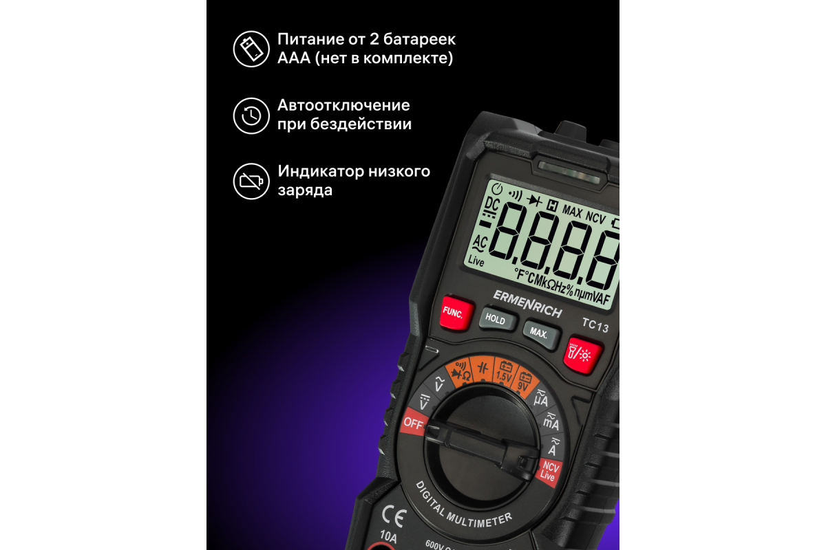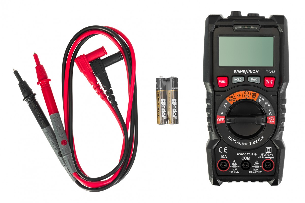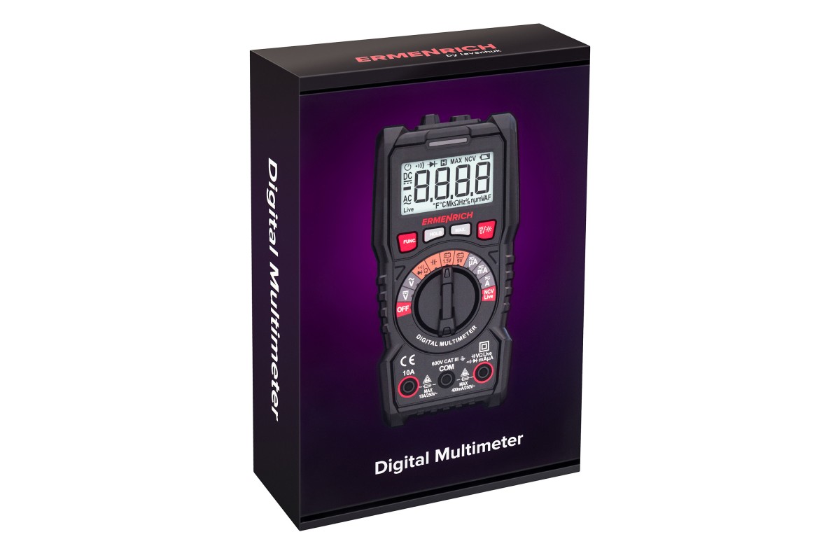 Ermenrich Zing TC13 – портативный цифровой измеритель для измерения силы тока, напряжения и сопротивления, а также частоты, емкости и рабочего цикла. Кроме того, с его помощью можно определять обрывы и пробои диодов, короткое замыкание, обрыв кабеля. Есть функция бесконтактного обнаружения скрытой проводки под напряжением. Мультиметр оснащен ЖК-дисплеем для отображения режимов работы и результатов измерений.