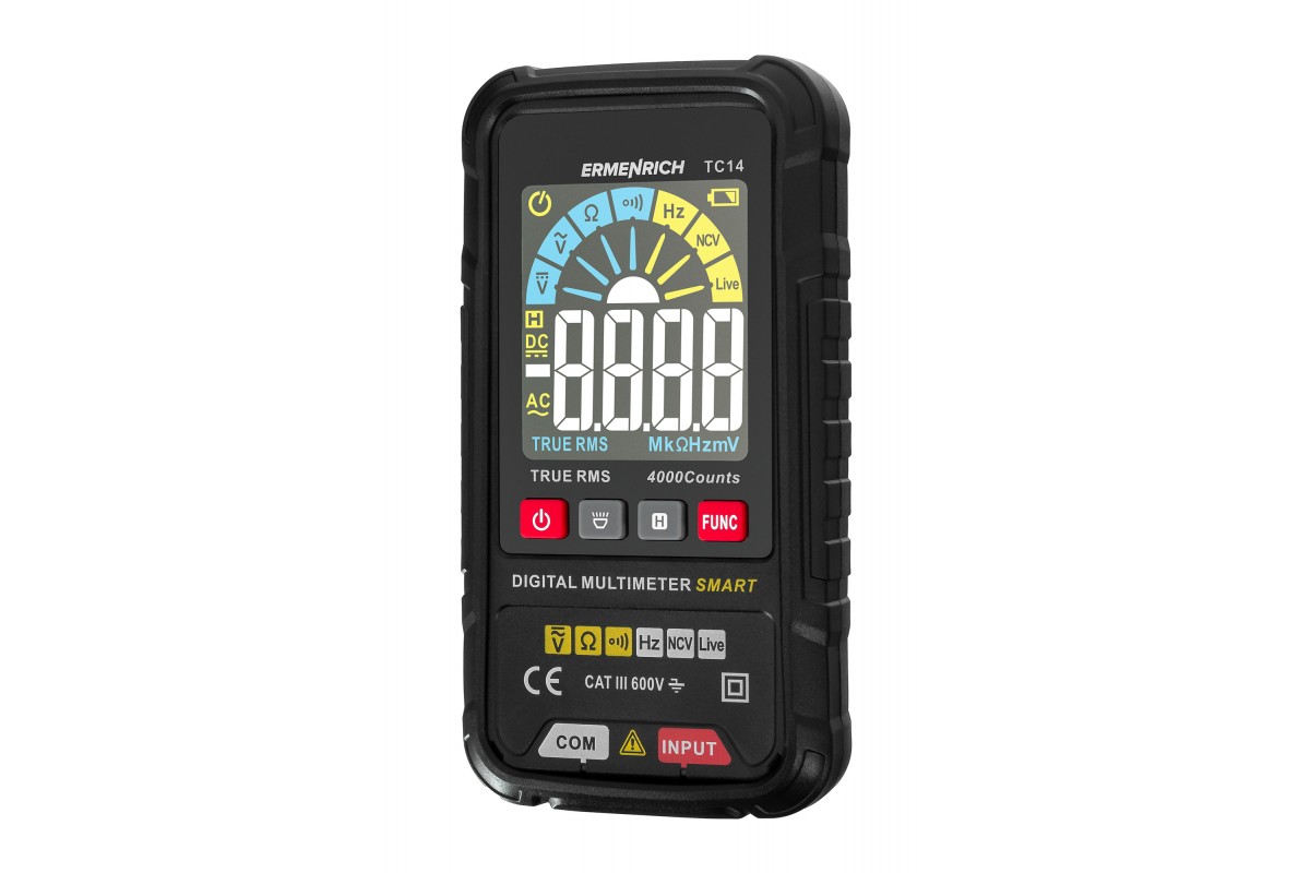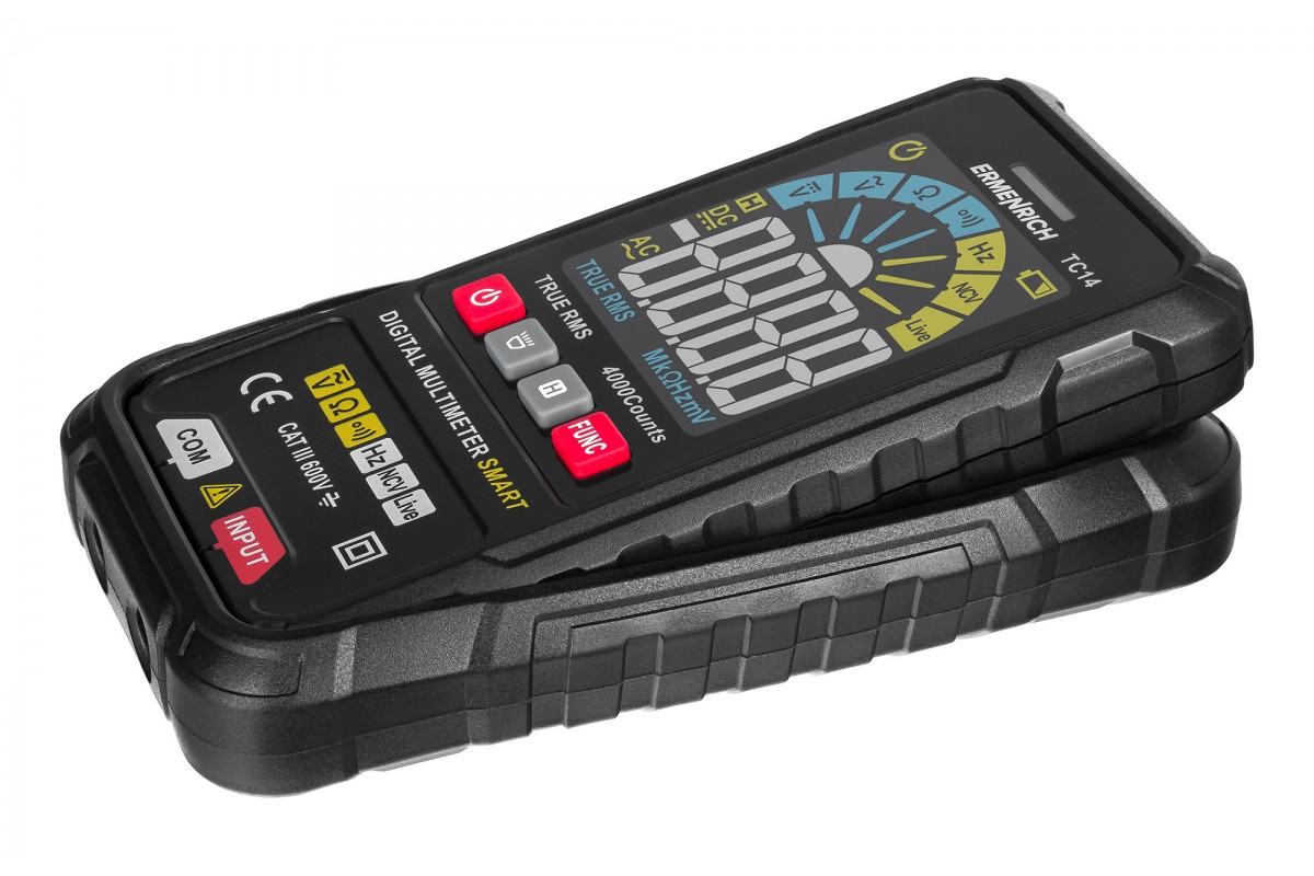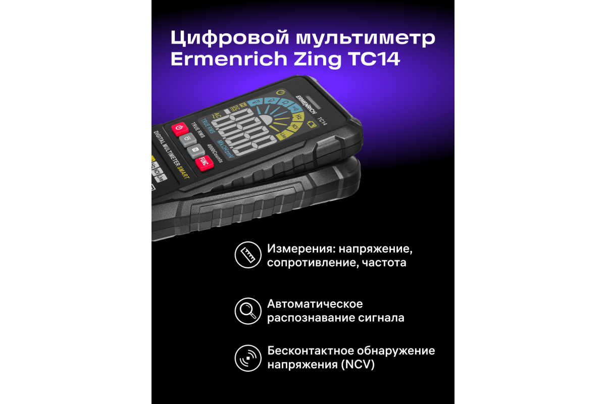 Компактный цифровой тестер Ermenrich Zing TC14 предназначен для измерения постоянного и переменного напряжения, сопротивления и частоты, а также для прозвонки кабелей (поиска обрывов). Может использоваться для бесконтактного обнаружения проводки в полу или в стенах (функция NCV) и для определения фазы. В приборе есть функция Smart для автоматического определения принимаемого сигнала и выбора предела измерения (для всех параметров, кроме частоты).