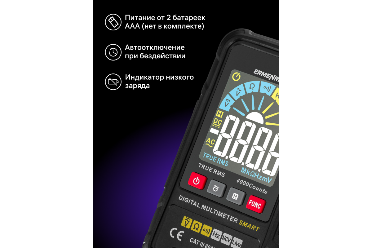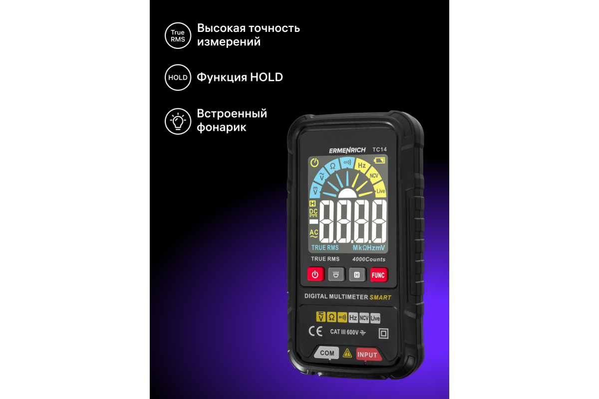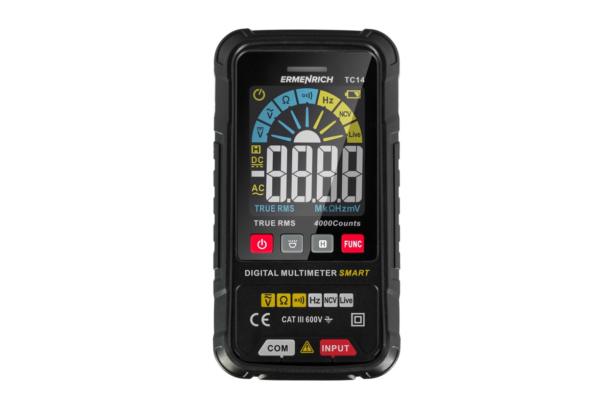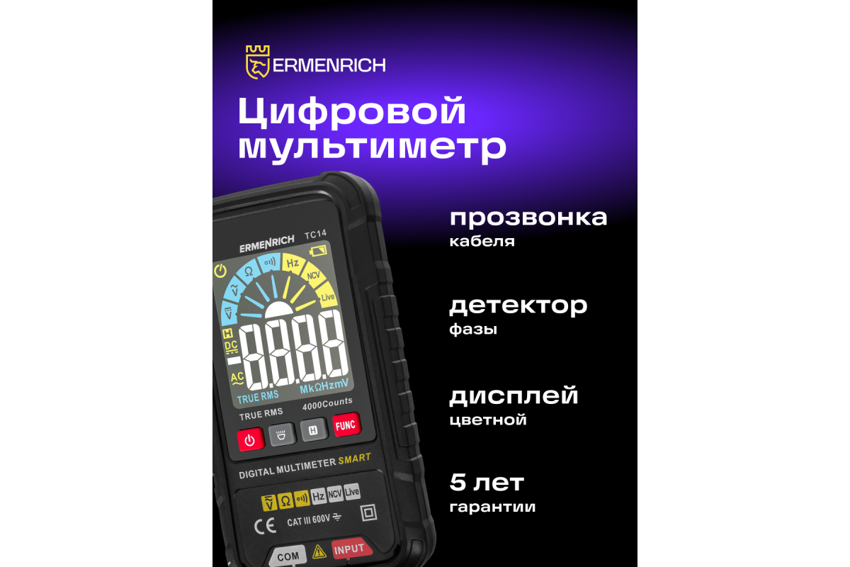 Компактный цифровой тестер Ermenrich Zing TC14 предназначен для измерения постоянного и переменного напряжения, сопротивления и частоты, а также для прозвонки кабелей (поиска обрывов). Может использоваться для бесконтактного обнаружения проводки в полу или в стенах (функция NCV) и для определения фазы. В приборе есть функция Smart для автоматического определения принимаемого сигнала и выбора предела измерения (для всех параметров, кроме частоты).