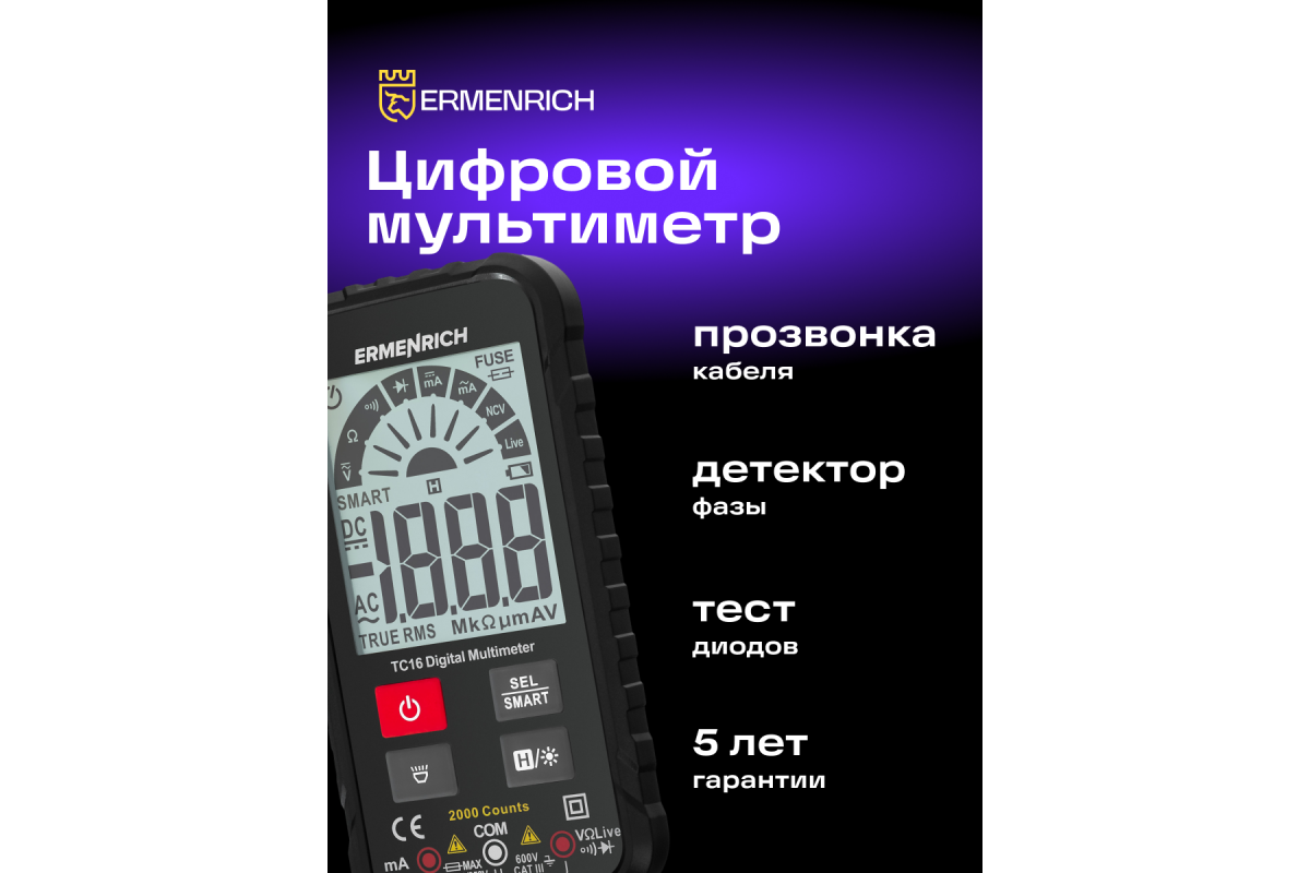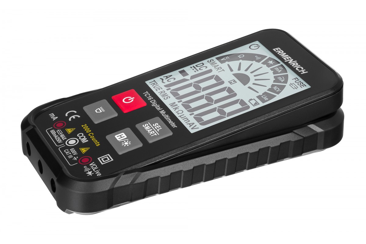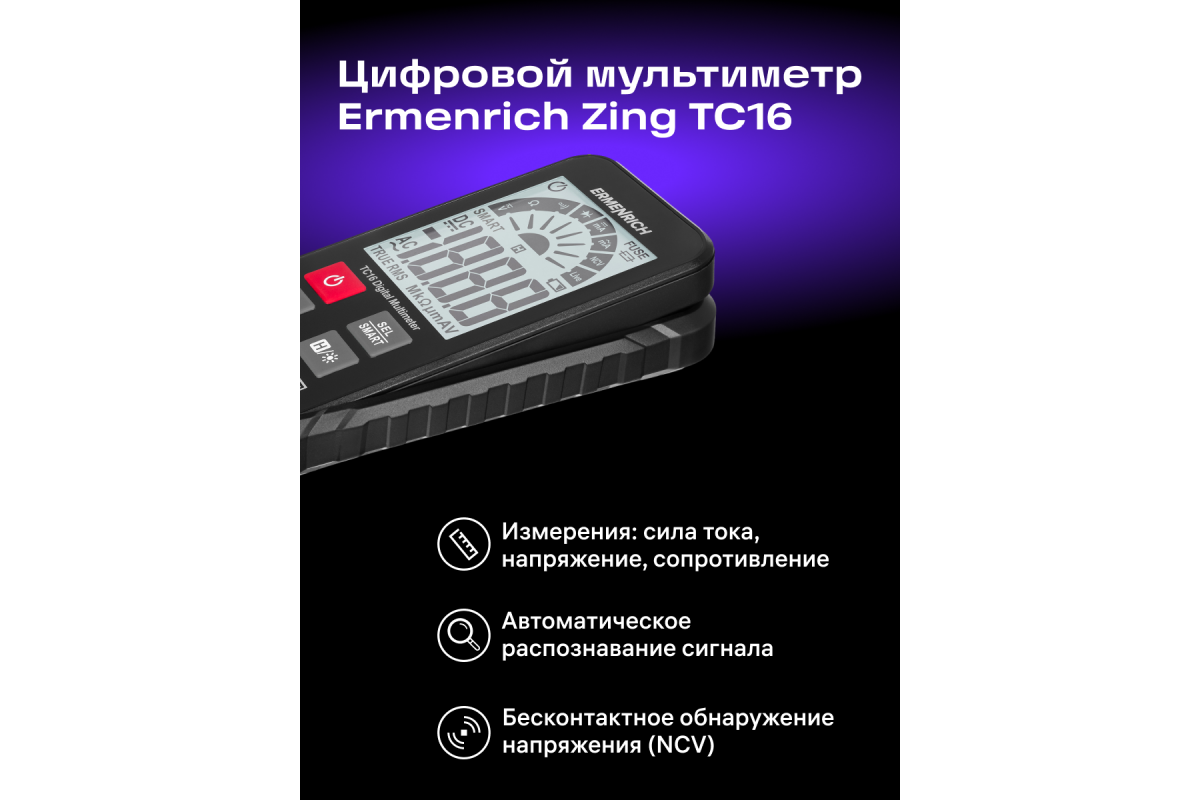 Мультиметр Ermenrich Zing TC16 – это цифровой измеритель напряжения, силы тока и сопротивления с сенсорным дисплеем и питанием от 2 сменных батареек. Измерения производятся по истинным среднеквадратичным значениям (True RMS) и отличаются высокой точностью. Режим работы выбирается автоматически, по типу входящего сигнала, или вручную. Прибор имеет большой дисплей и интуитивно понятное управление. Может использоваться для диагностики электропроводки в быту или для профессионального ремонта электросетей.