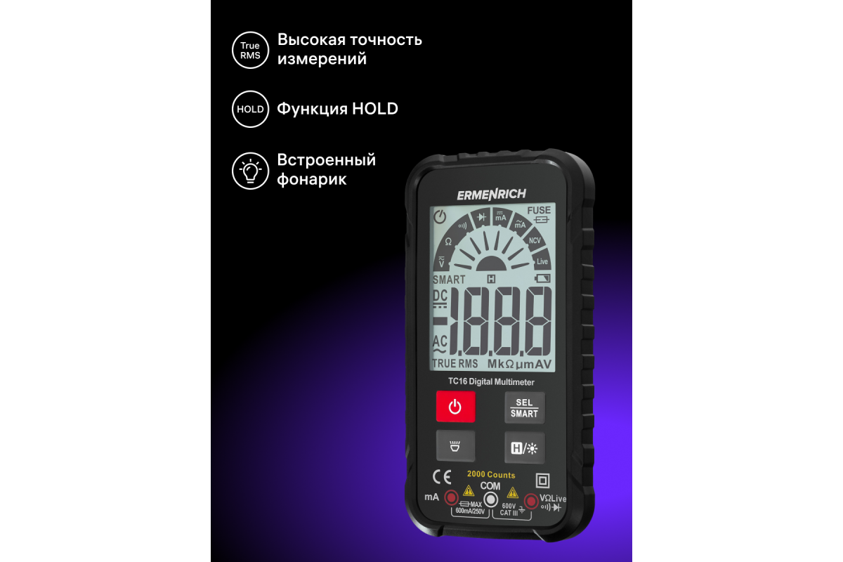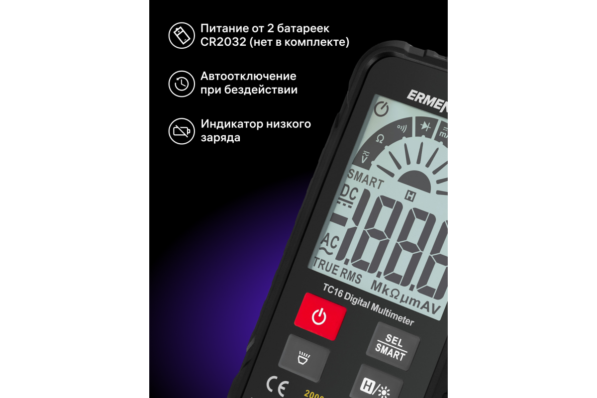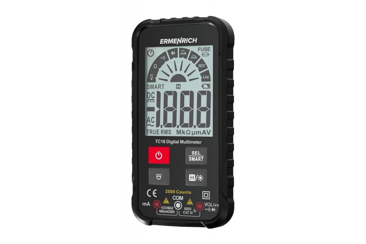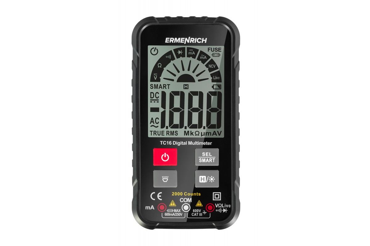Мультиметр Ermenrich Zing TC16 – это цифровой измеритель напряжения, силы тока и сопротивления с сенсорным дисплеем и питанием от 2 сменных батареек. Измерения производятся по истинным среднеквадратичным значениям (True RMS) и отличаются высокой точностью. Режим работы выбирается автоматически, по типу входящего сигнала, или вручную. Прибор имеет большой дисплей и интуитивно понятное управление. Может использоваться для диагностики электропроводки в быту или для профессионального ремонта электросетей.