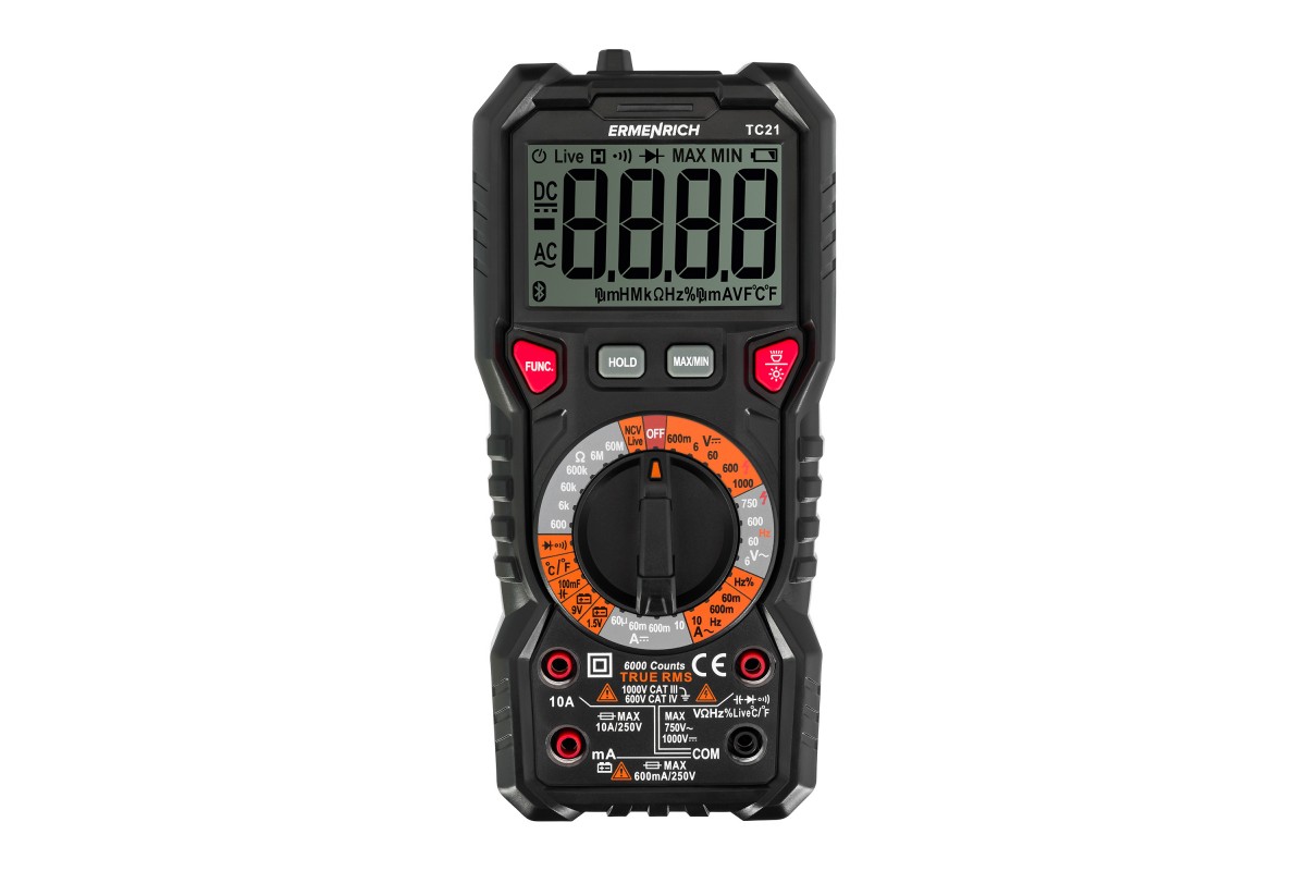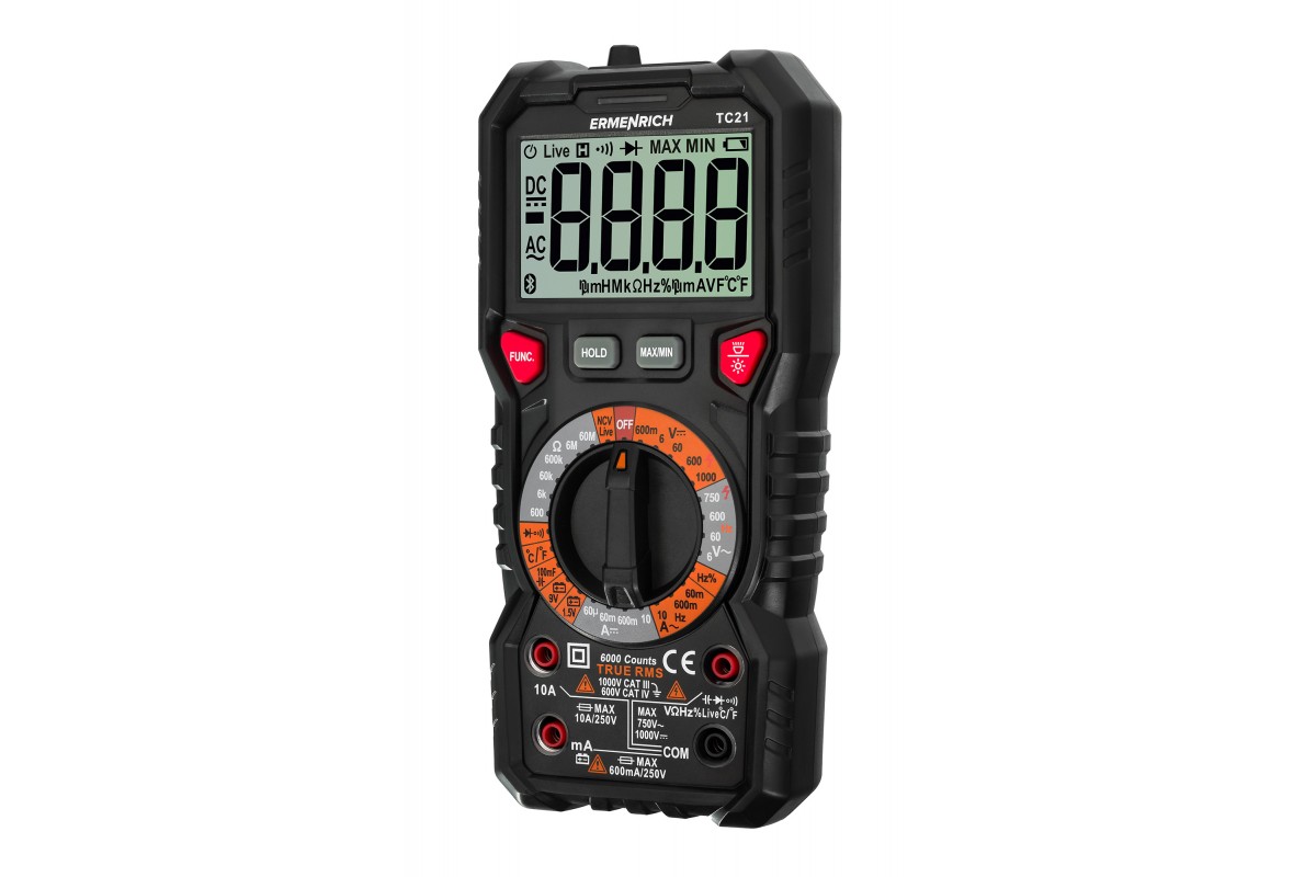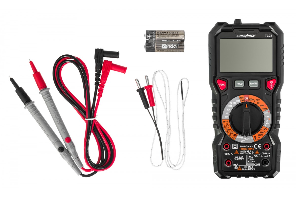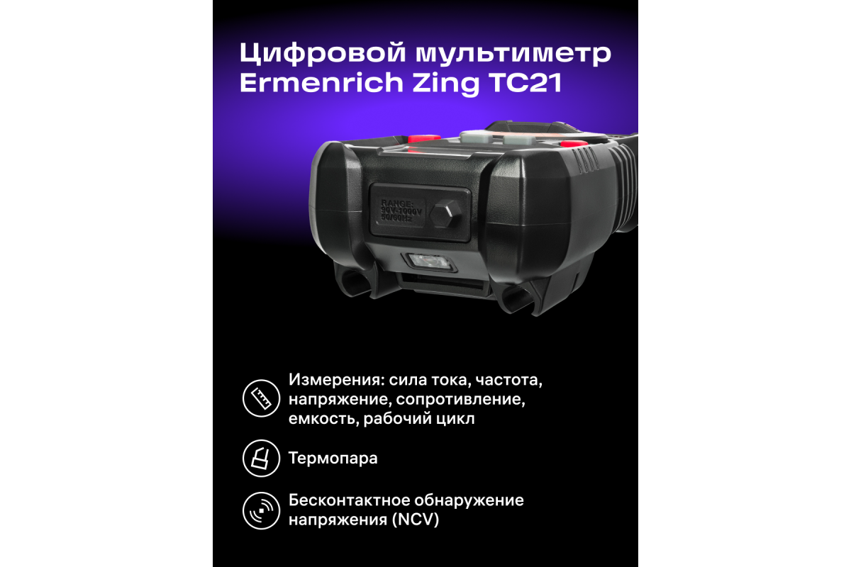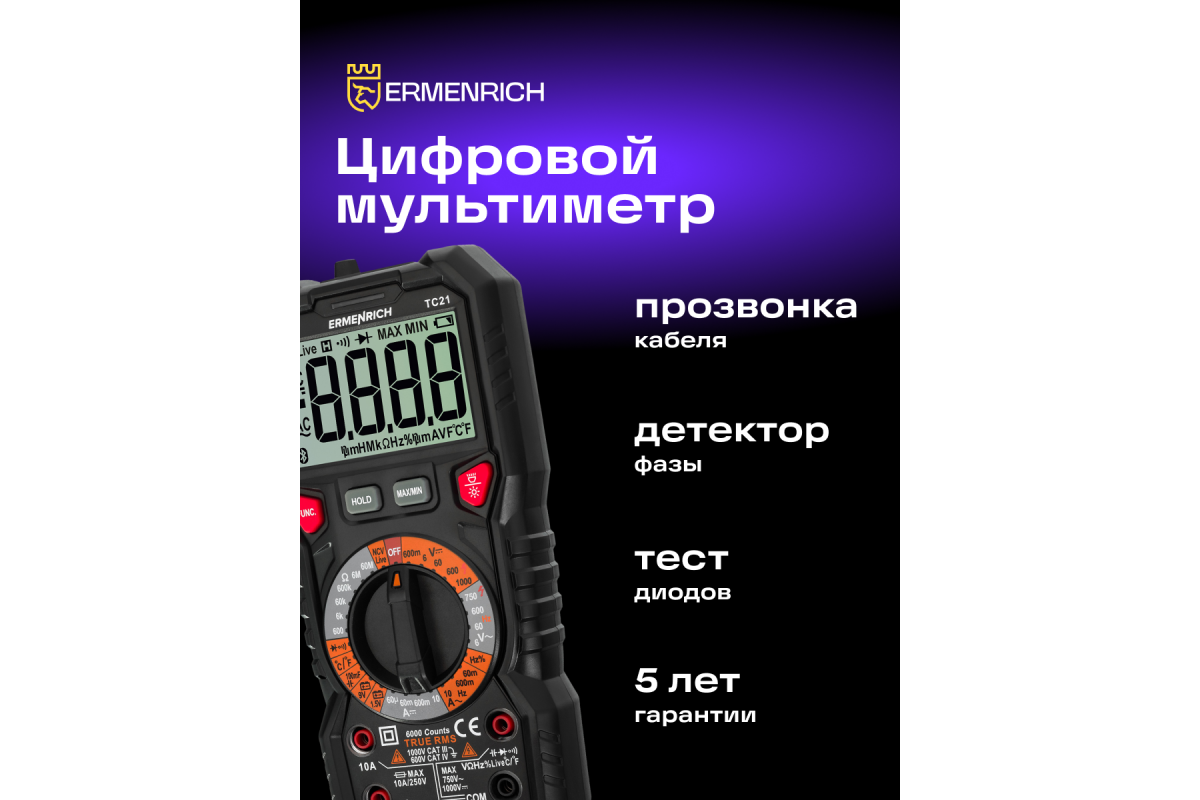 Мультиметр Ermenrich Zing TC21 – цифровой измеритель электрических характеристик и тестер кабельных линий в одном устройстве. Прибор измеряет целый ряд величин: напряжение, силу тока, сопротивление, а также частоту, емкость, рабочий цикл и температуру. Кроме того, с его помощью можно сделать прозвонку кабеля для обнаружения обрыва, определить фазу, найти короткое замыкание, обнаружить пробой или обрыв диода, протестировать элементы питания. Также есть функция бесконтактного обнаружения скрытого кабеля и участков с опасным напряжением. Измеряемые значения и режимы отображаются на монохромном LCD-дисплее. Режим работы выбирается вручную с помощью большого поворотного переключателя.