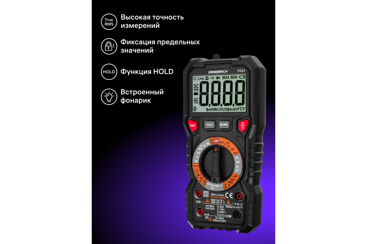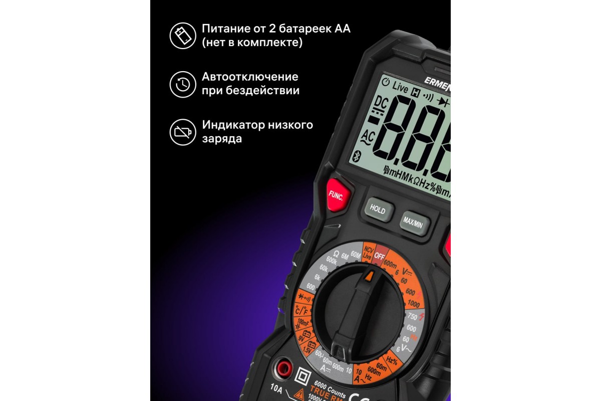 Мультиметр Ermenrich Zing TC21 выполняет измерения с максимальной точностью по методу истинного среднеквадратичного значения (True RMS). Этот функциональный прибор можно рекомендовать как электрикам, так и непрофессионалам для диагностики проводки в квартире или проверки автомобильной электросети. Измеренное значение можно «заморозить» на дисплее и посмотреть его позже, например, если при проверке экран повернут от пользователя. С помощью светодиодного фонарика можно осветить проверяемый участок кабеля. Мультиметр работает от 2 «пальчиковых» батареек. Если измеритель не используется, он автоматически выключается в целях энергосбережения.