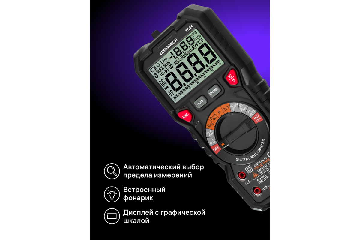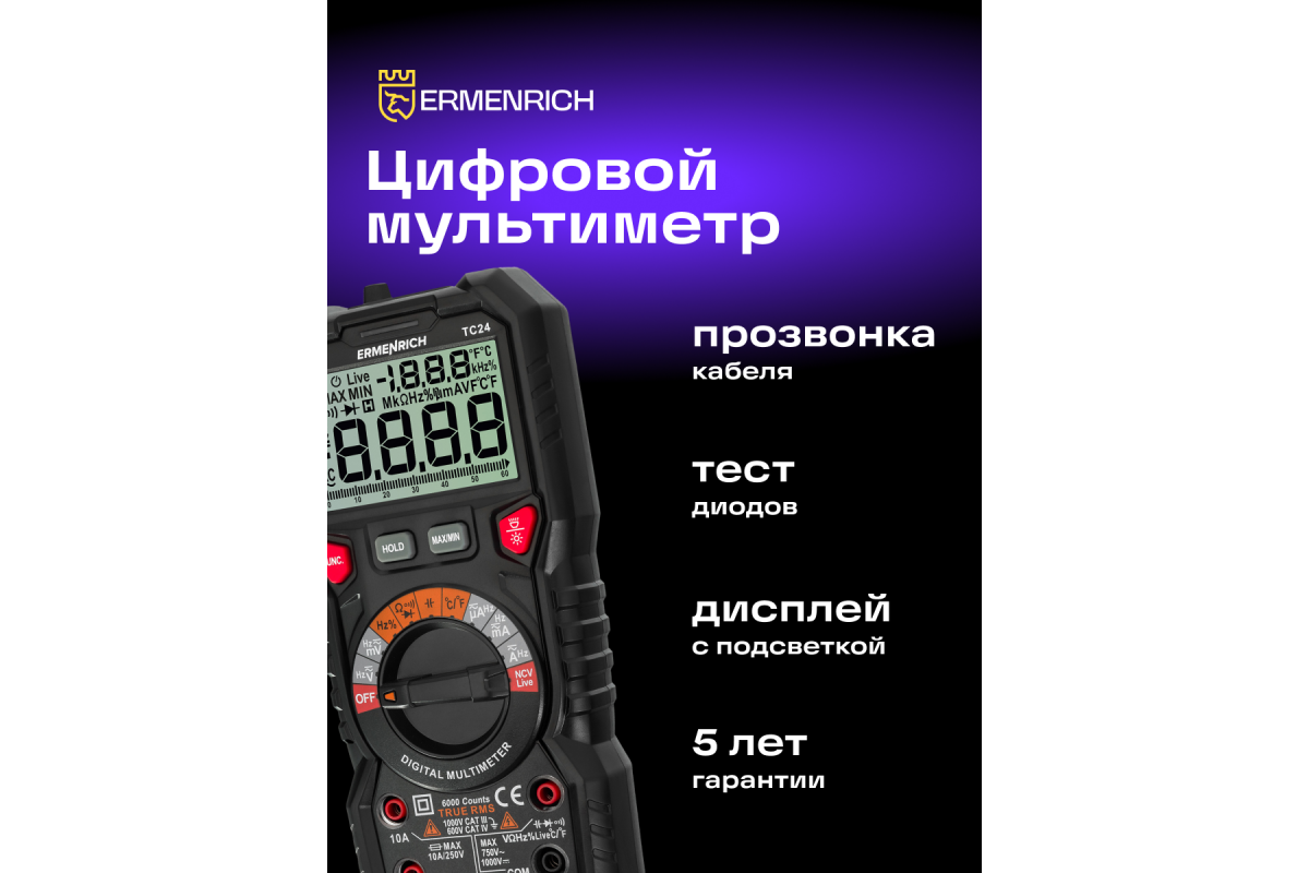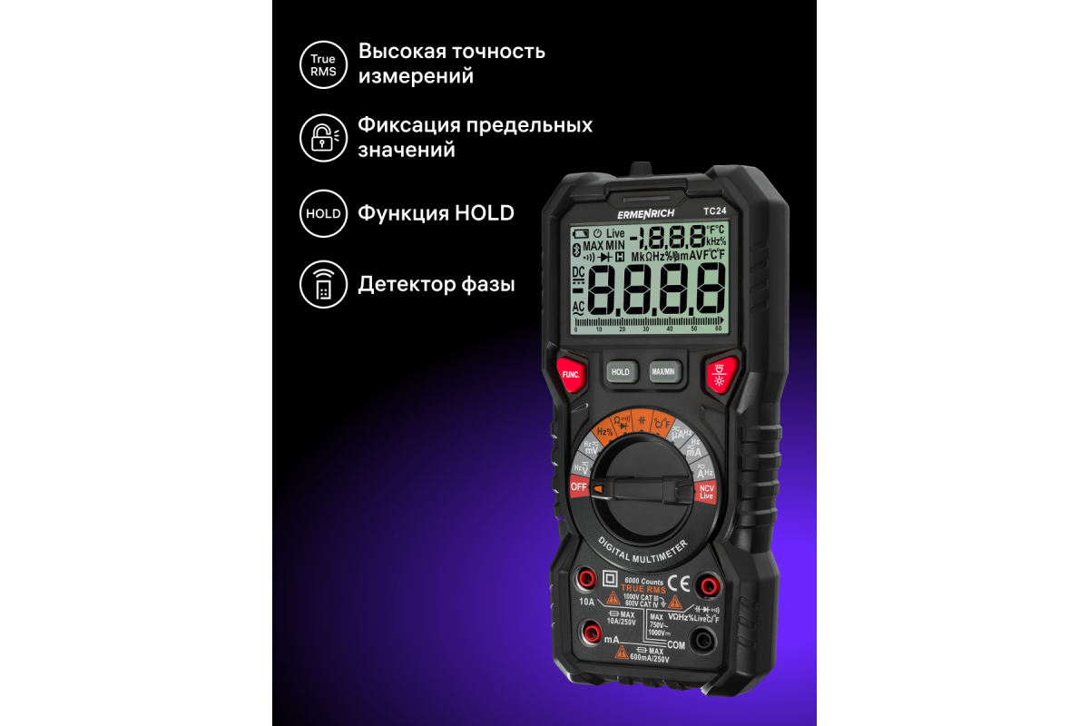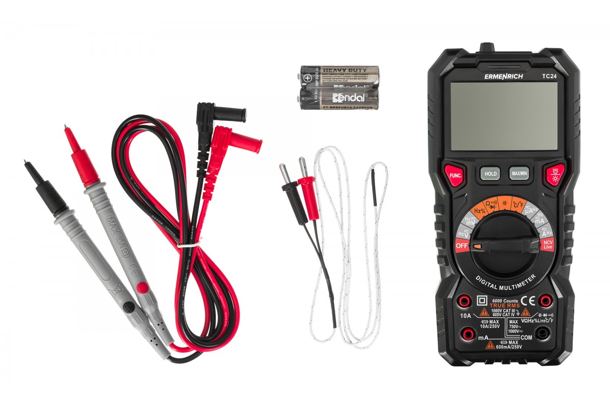 Цифровой мультиметр Ermenrich Zing TC24 – устройство для измерения характеристик электрического тока (силы и напряжения) и проводника (сопротивления и емкости). С его помощью также можно измерять рабочий цикл и температуру, определять фазу, находить обрывы на линии (прозвонка кабеля), обрывы и пробои диодов. Доступна функция NCV для бесконтактного обнаружения проводки в полу или в стенах и детектирования опасного напряжения. Измерения осуществляются по истинному среднеквадратичному значению (True RMS), предел измерения выбирается автоматически.