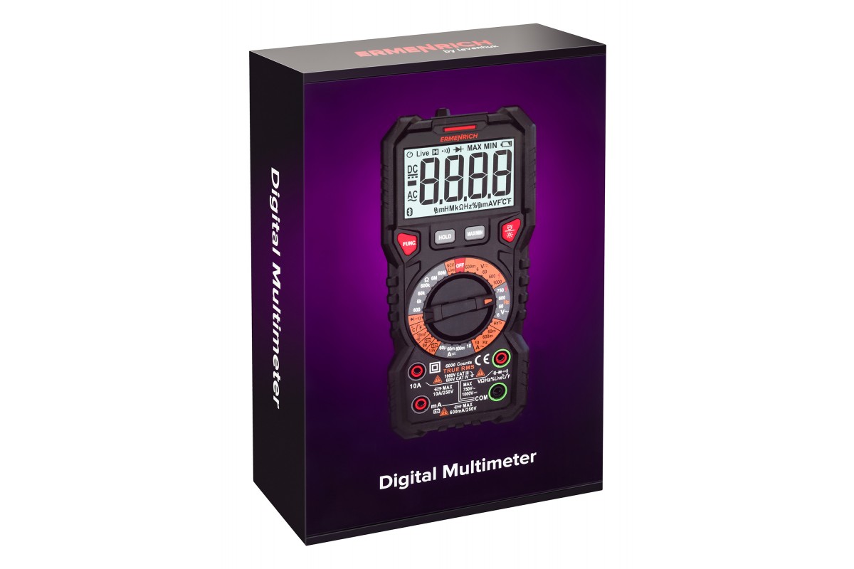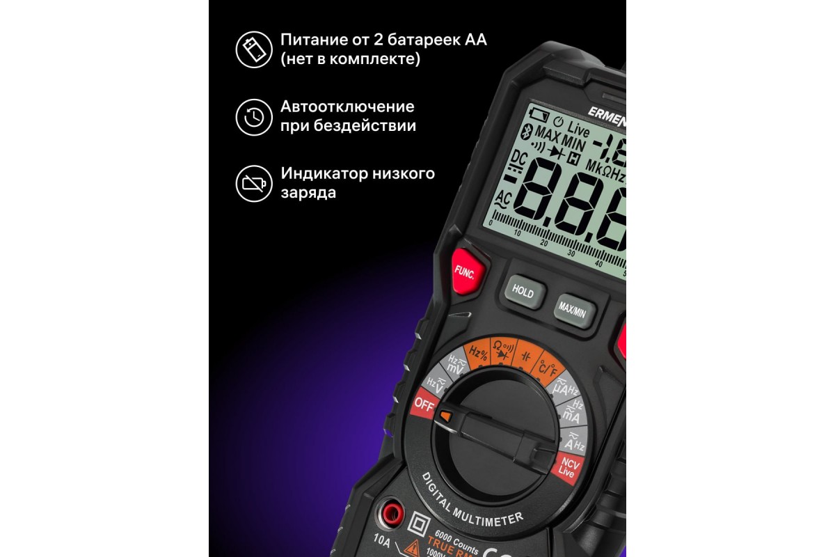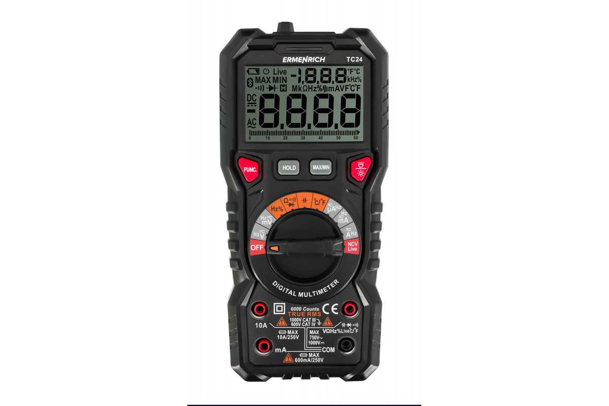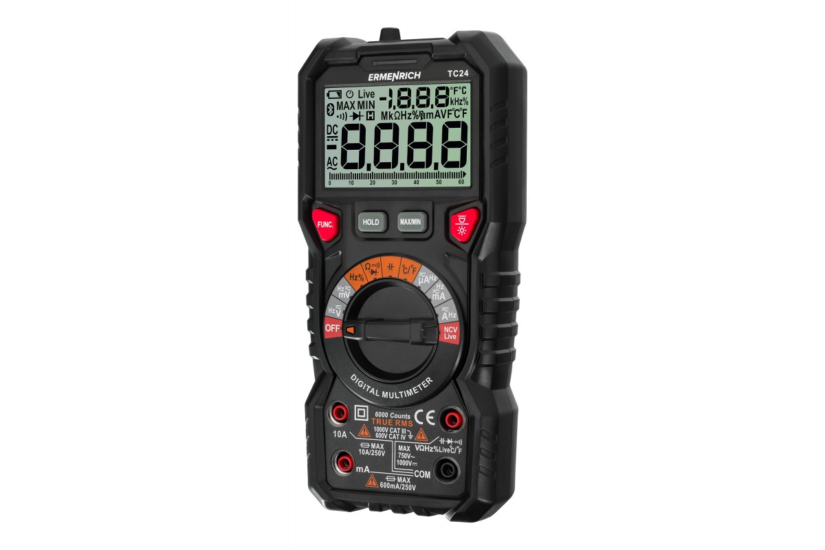 Цифровой мультиметр Ermenrich Zing TC24 – устройство для измерения характеристик электрического тока (силы и напряжения) и проводника (сопротивления и емкости). С его помощью также можно измерять рабочий цикл и температуру, определять фазу, находить обрывы на линии (прозвонка кабеля), обрывы и пробои диодов. Доступна функция NCV для бесконтактного обнаружения проводки в полу или в стенах и детектирования опасного напряжения. Измерения осуществляются по истинному среднеквадратичному значению (True RMS), предел измерения выбирается автоматически.