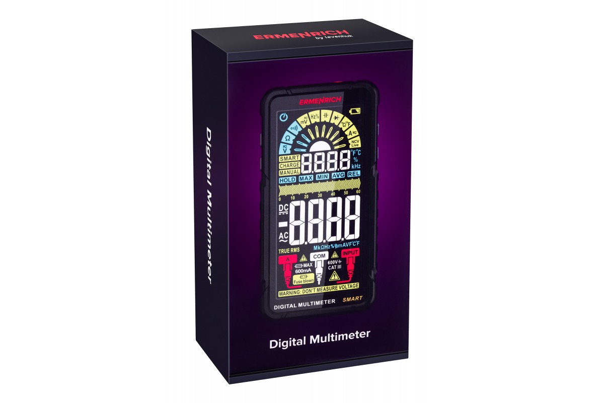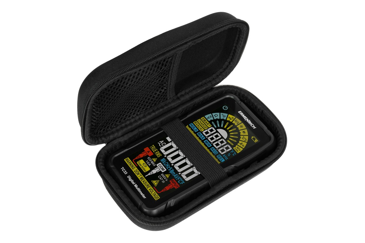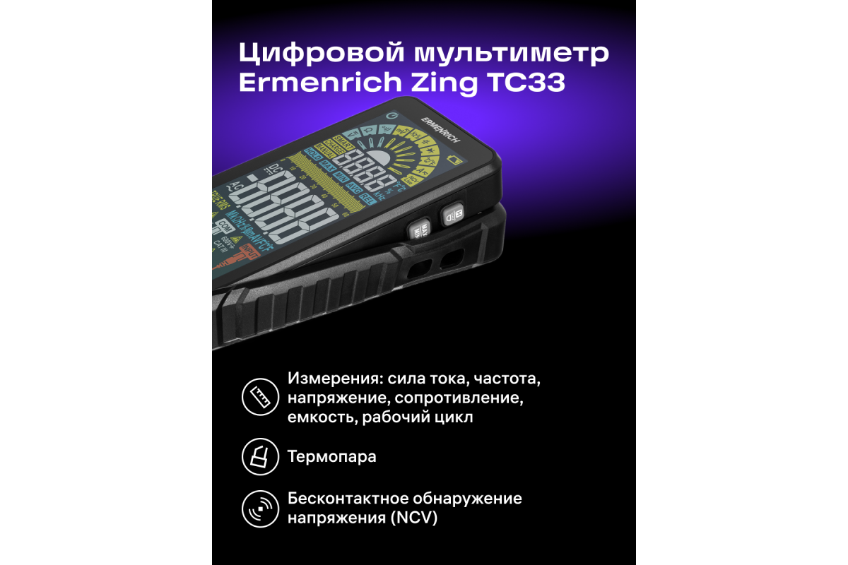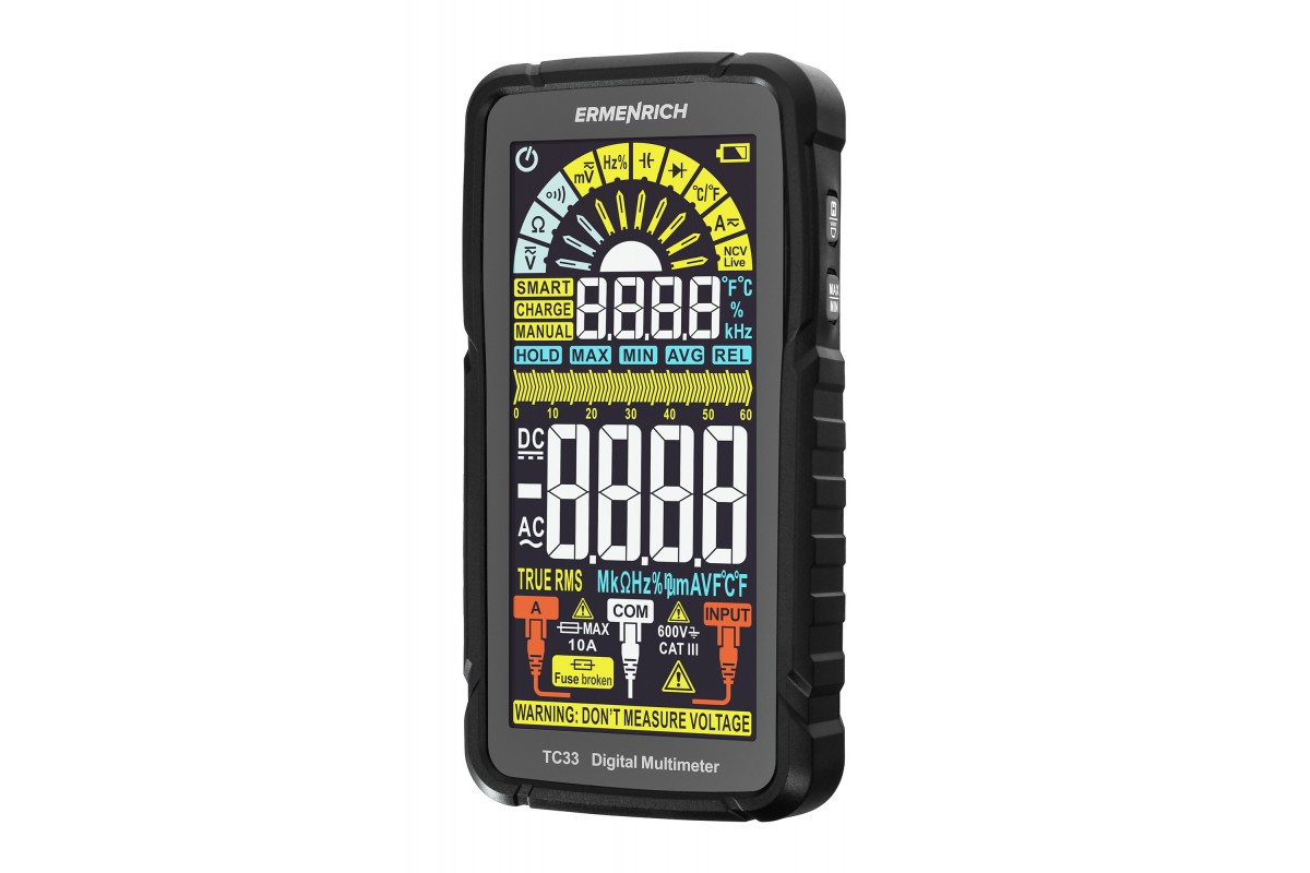 Ermenrich Zing TC33 – портативный измеритель электрических параметров и тестер кабельных линий. С его помощью можно измерить напряжение, силу тока, сопротивление, рабочий цикл, емкость, частоту. Также мультиметр оснащен термопарой для измерения температуры в двух единицах: °C или °F. В приборе есть режимы прозвонки кабеля, тестирования диодов, определения фазы и обнаружения короткого замыкания. Используя Ermenrich Zing TC33, также находят провода под напряжением, скрытые в полу или в стенах. Модель рекомендуется как профессиональным электрикам, так и тем, кому нужен простой и функциональный прибор для самостоятельной диагностики проводов (в том числе автомобильной электросети).