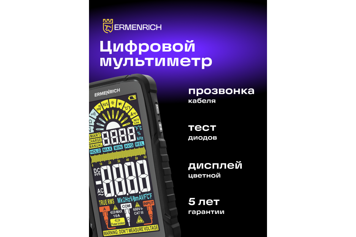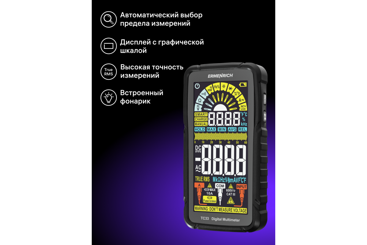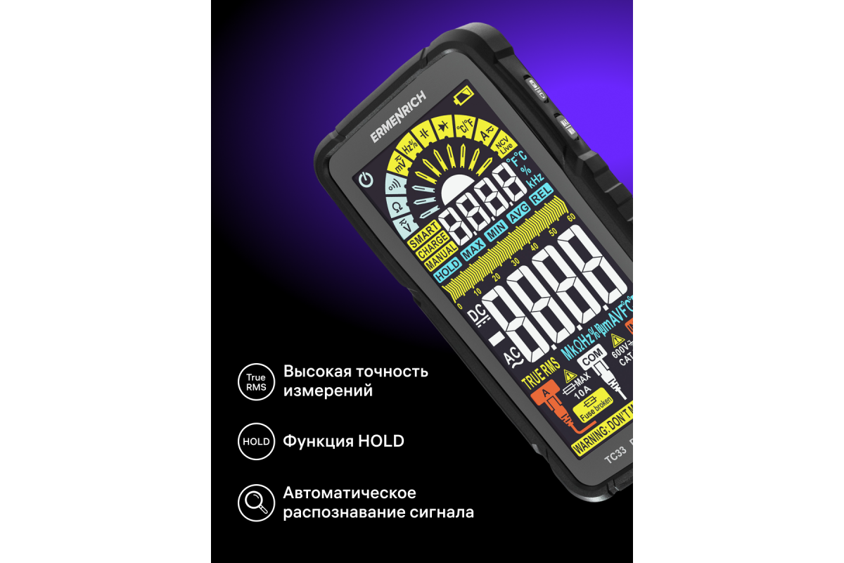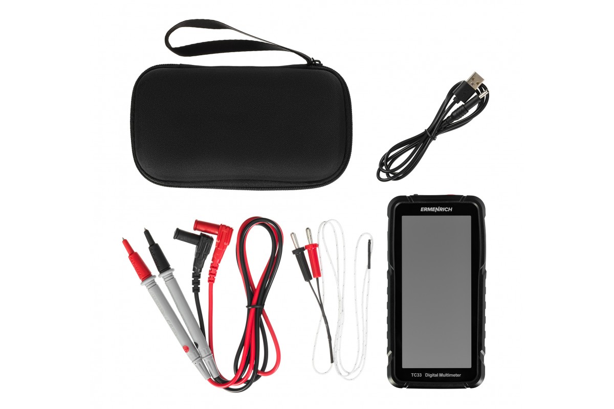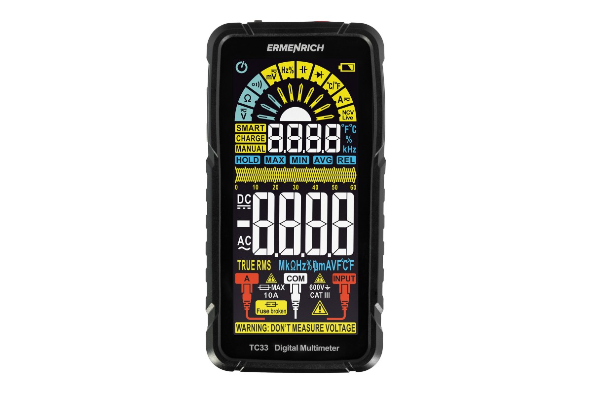 Ermenrich Zing TC33 – портативный измеритель электрических параметров и тестер кабельных линий. С его помощью можно измерить напряжение, силу тока, сопротивление, рабочий цикл, емкость, частоту. Также мультиметр оснащен термопарой для измерения температуры в двух единицах: °C или °F. В приборе есть режимы прозвонки кабеля, тестирования диодов, определения фазы и обнаружения короткого замыкания. Используя Ermenrich Zing TC33, также находят провода под напряжением, скрытые в полу или в стенах. Модель рекомендуется как профессиональным электрикам, так и тем, кому нужен простой и функциональный прибор для самостоятельной диагностики проводов (в том числе автомобильной электросети).