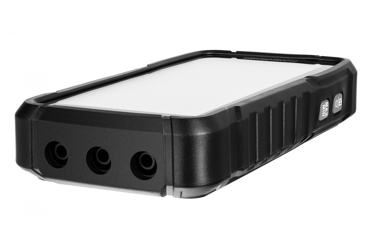 Корпус мультиметра изготовлен из пластика, имеет оребрение и удобно лежит в руке. Чтобы подсветить кабель или щиток, используют светодиодный фонарик. Питание прибора осуществляется от встроенного литий-ионного аккумулятора. Предусмотрена функция экономии заряда: мультиметр автоматически выключается при бездействии.